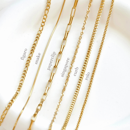 Gold Chain Necklaces, Tarnish Free Stainless Steel Chain Layers, Figaro Curb Snake, 12" to 22" Paperclip Singapore Curb Rolo Chain