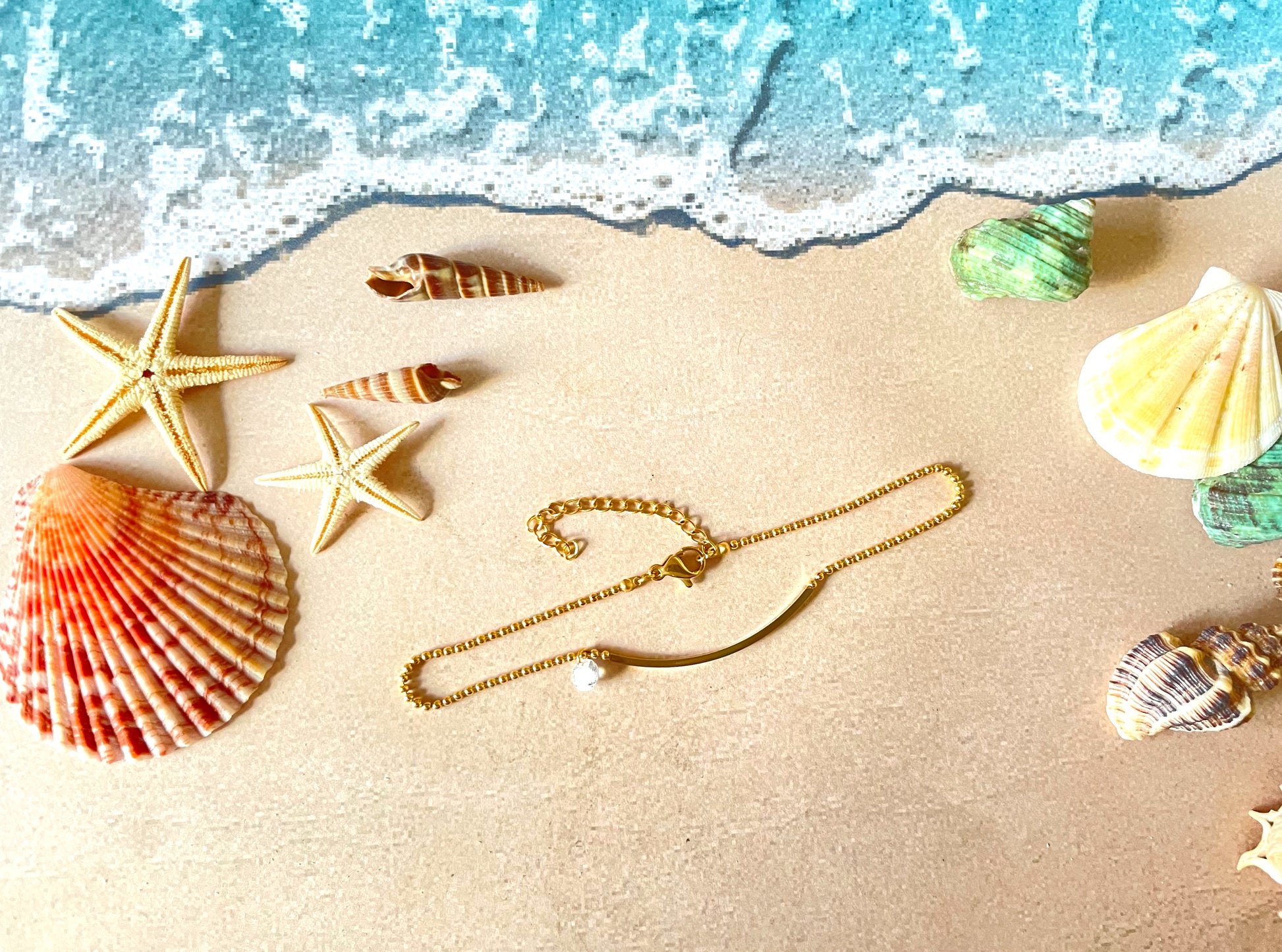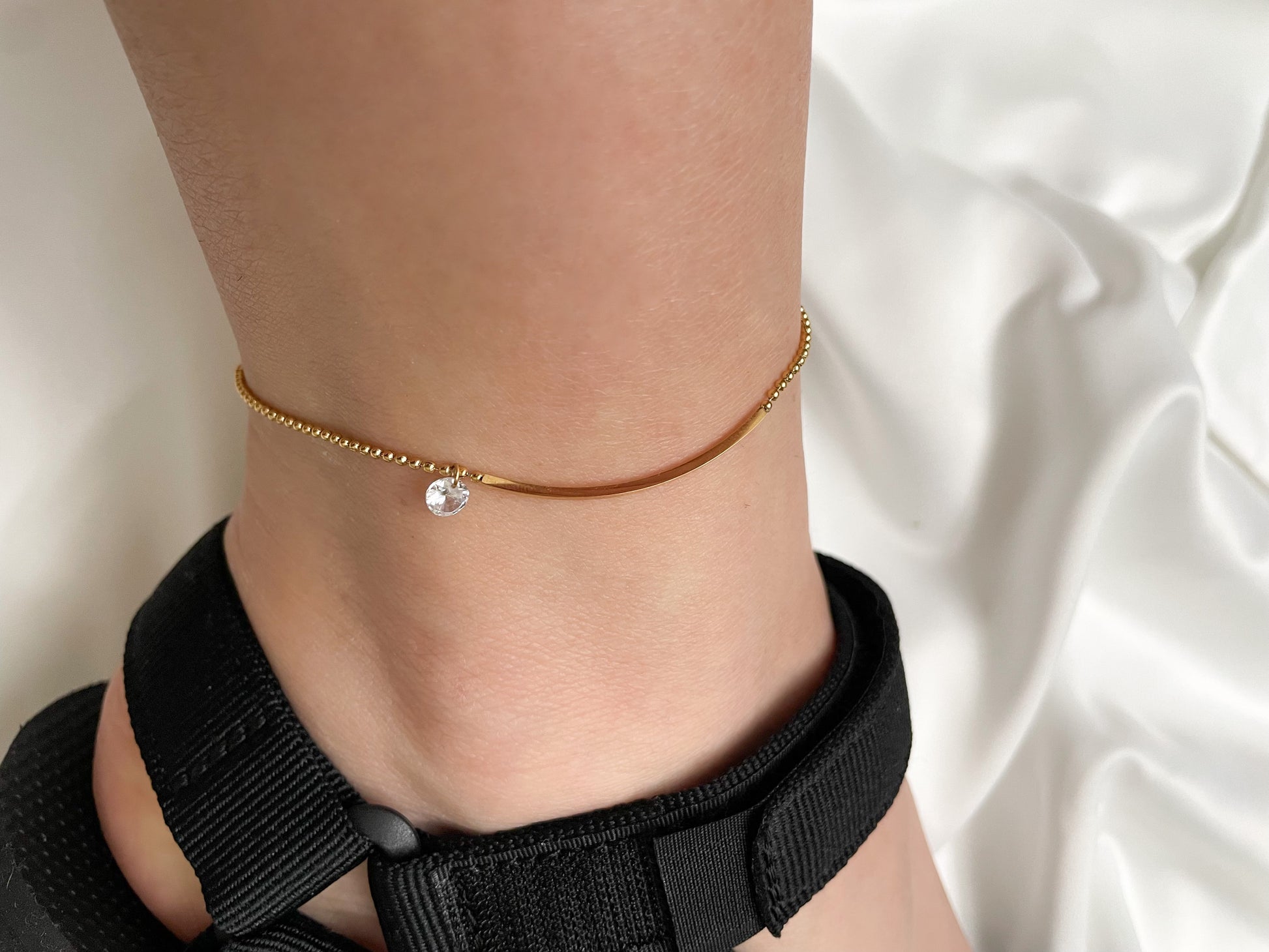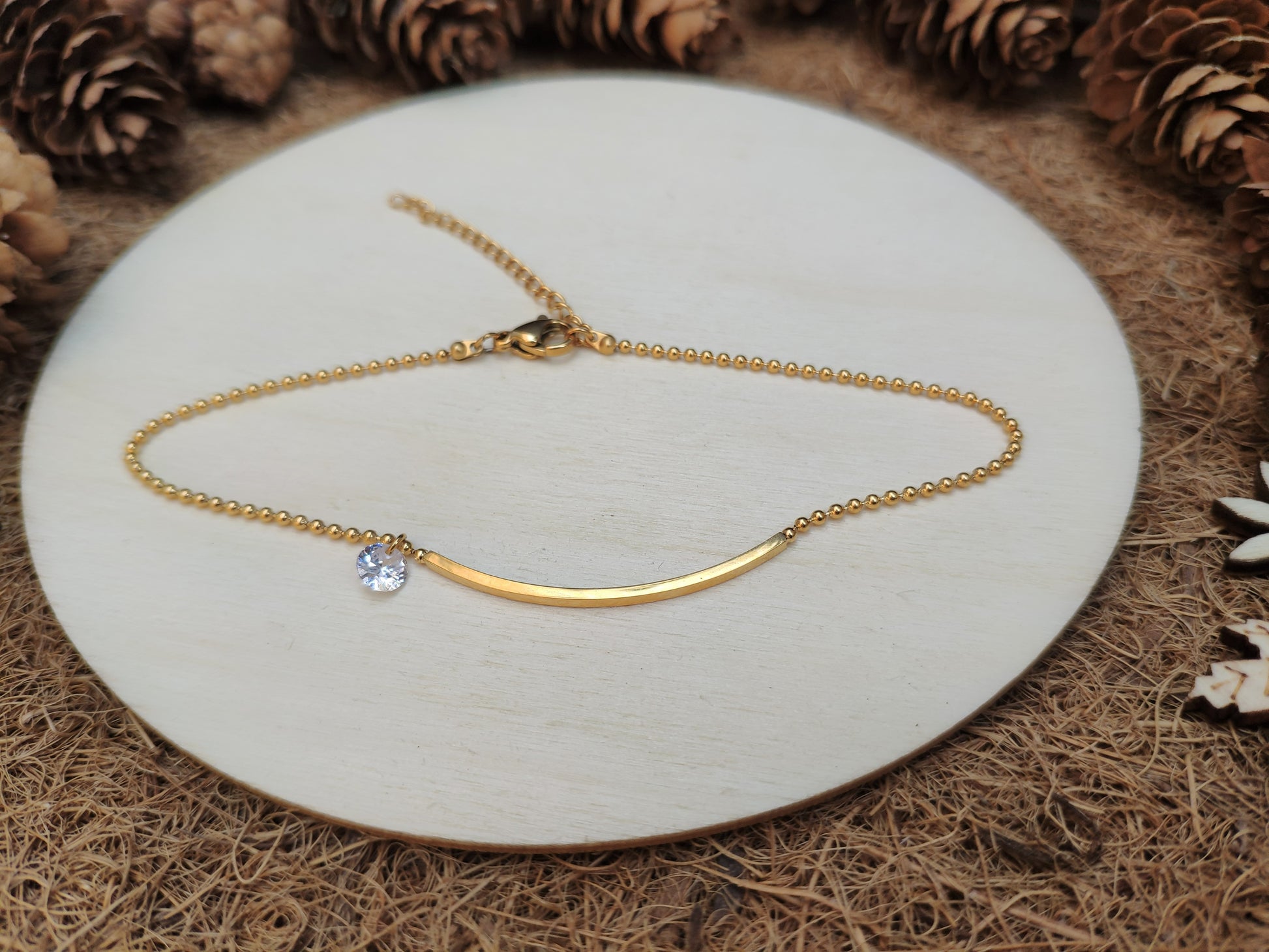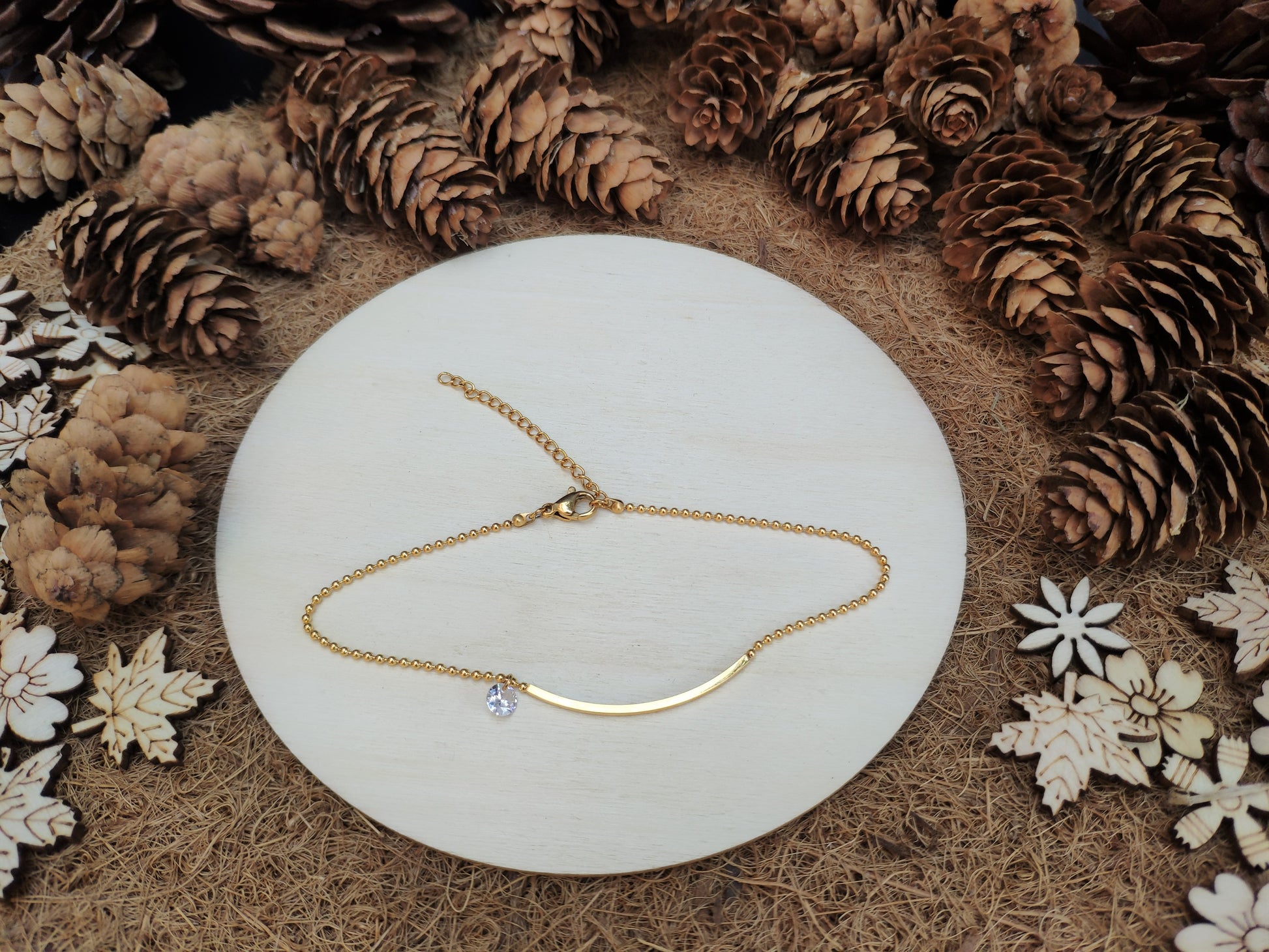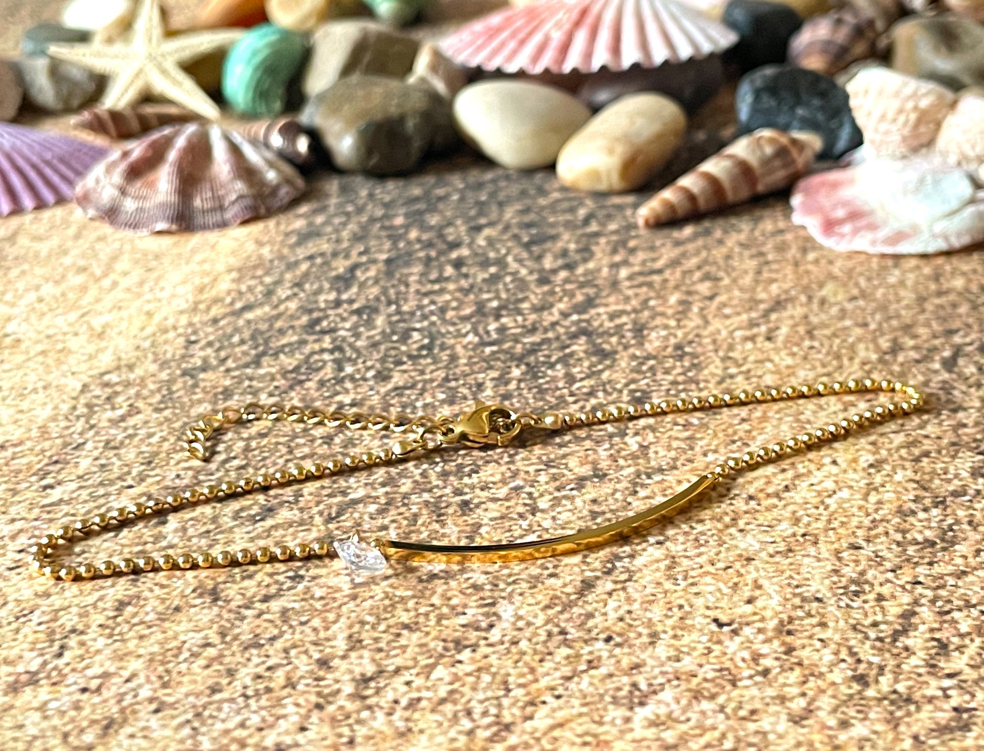 Make a statement with this stunning curved bar anklet which will make you smile:) Crafted in stainless steel, this sleek design has a curved bar centered along a dainty ball chain and features a crystal dangling from the right side of the bar, which adds just the right amount of sparkle to this anklet.