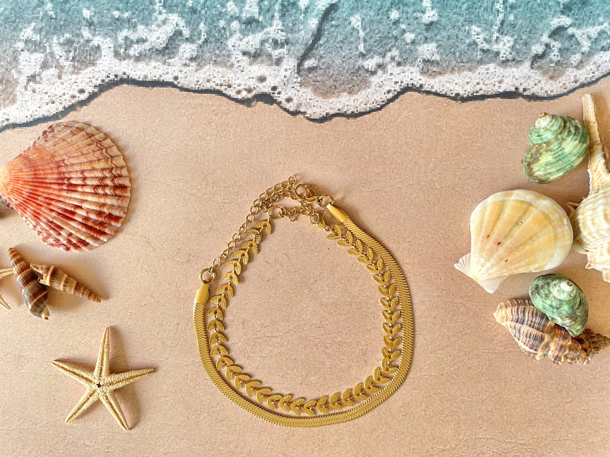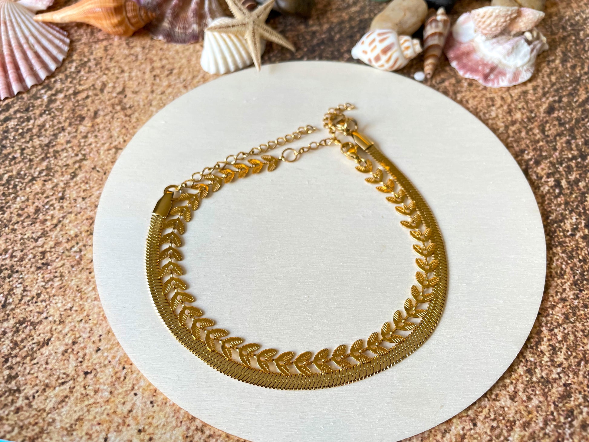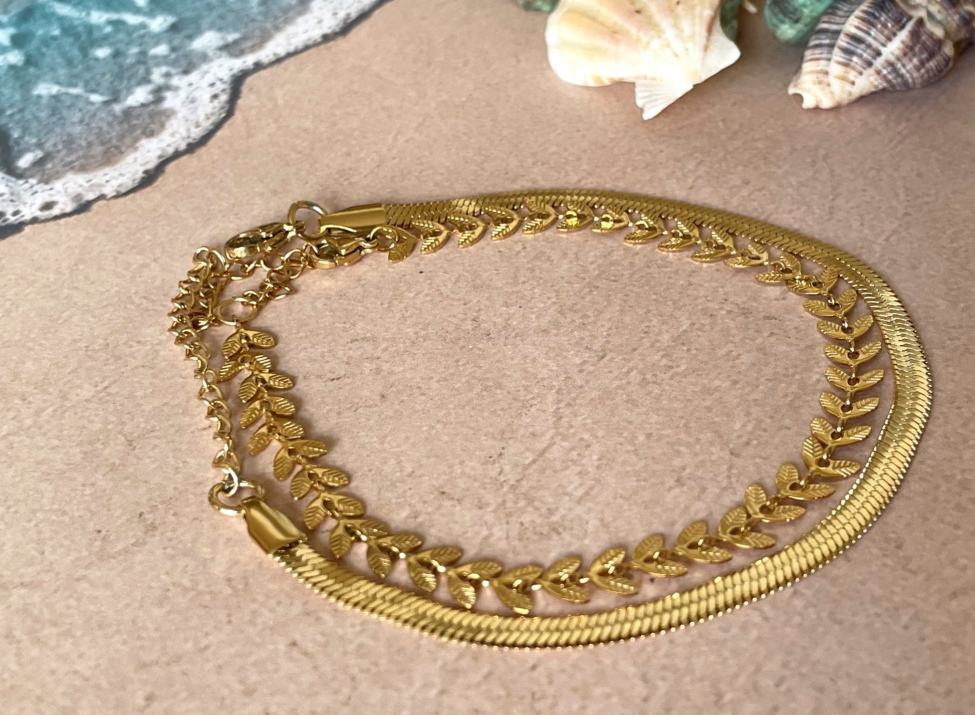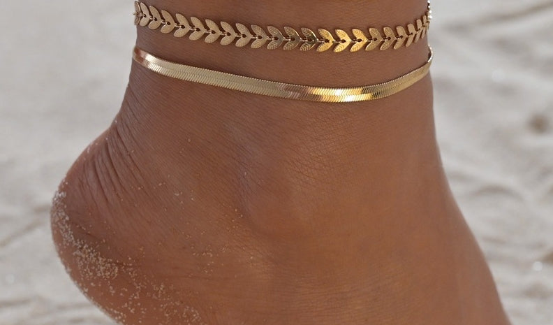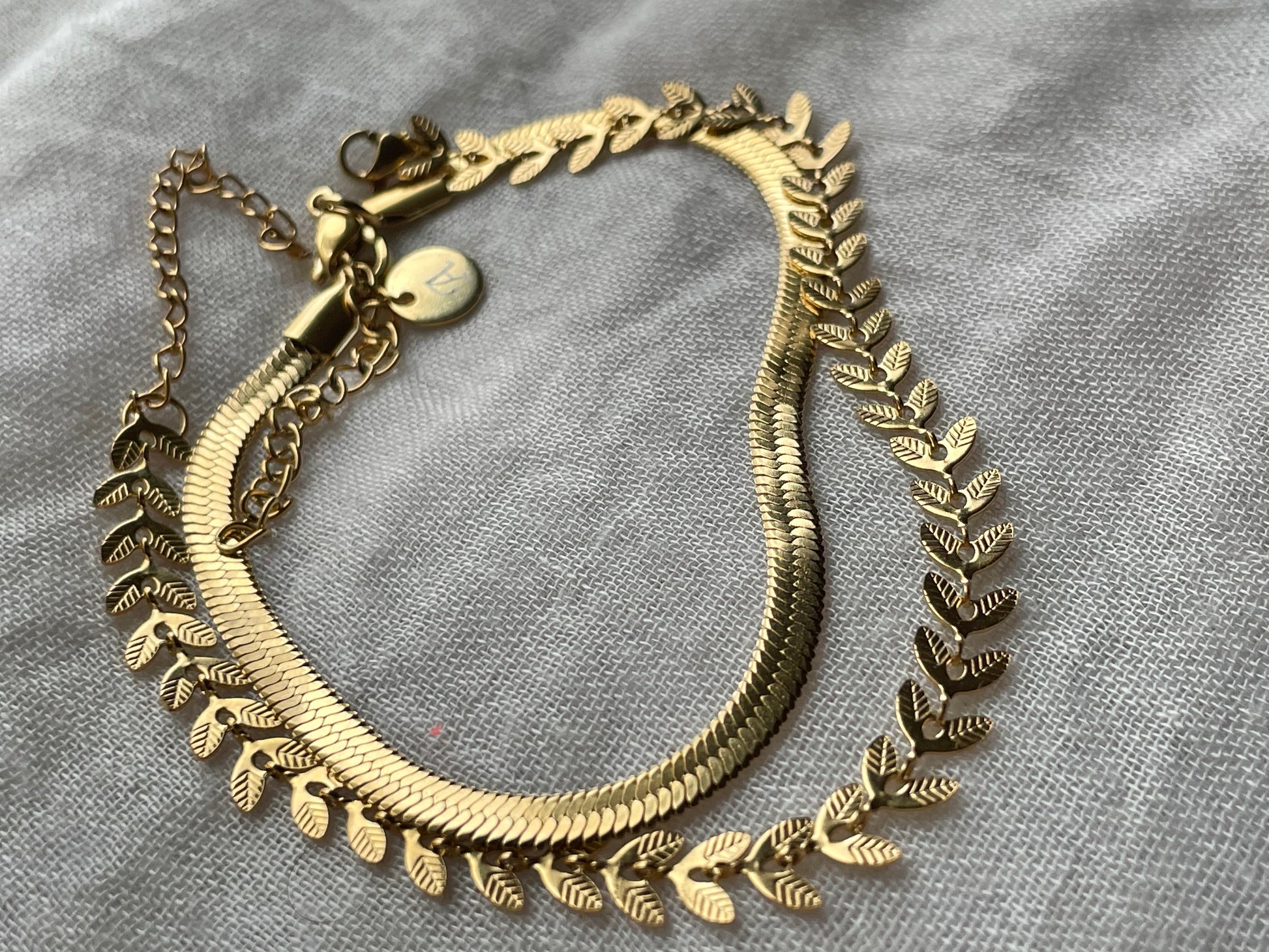 This fish bone or leaf style chain inspired by ancient Greece motifs and the timeless beauty of the herringbone chain comes together in this stunning anklet set. The design is made of stainless steel in gold finish and receives a personalized touch at the clasp area of the herringbone anklet with a disc letter charm, which creates a contrast with the edgy look of the leaf links of the chain.