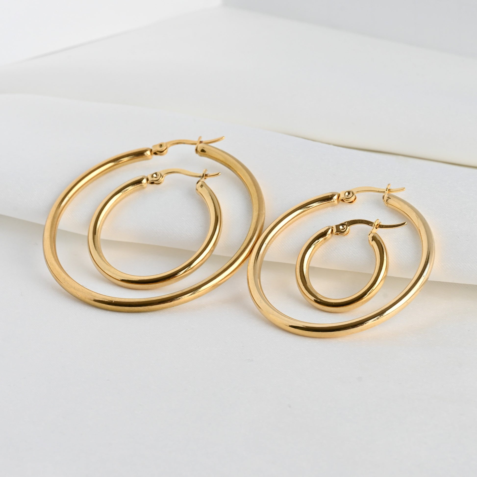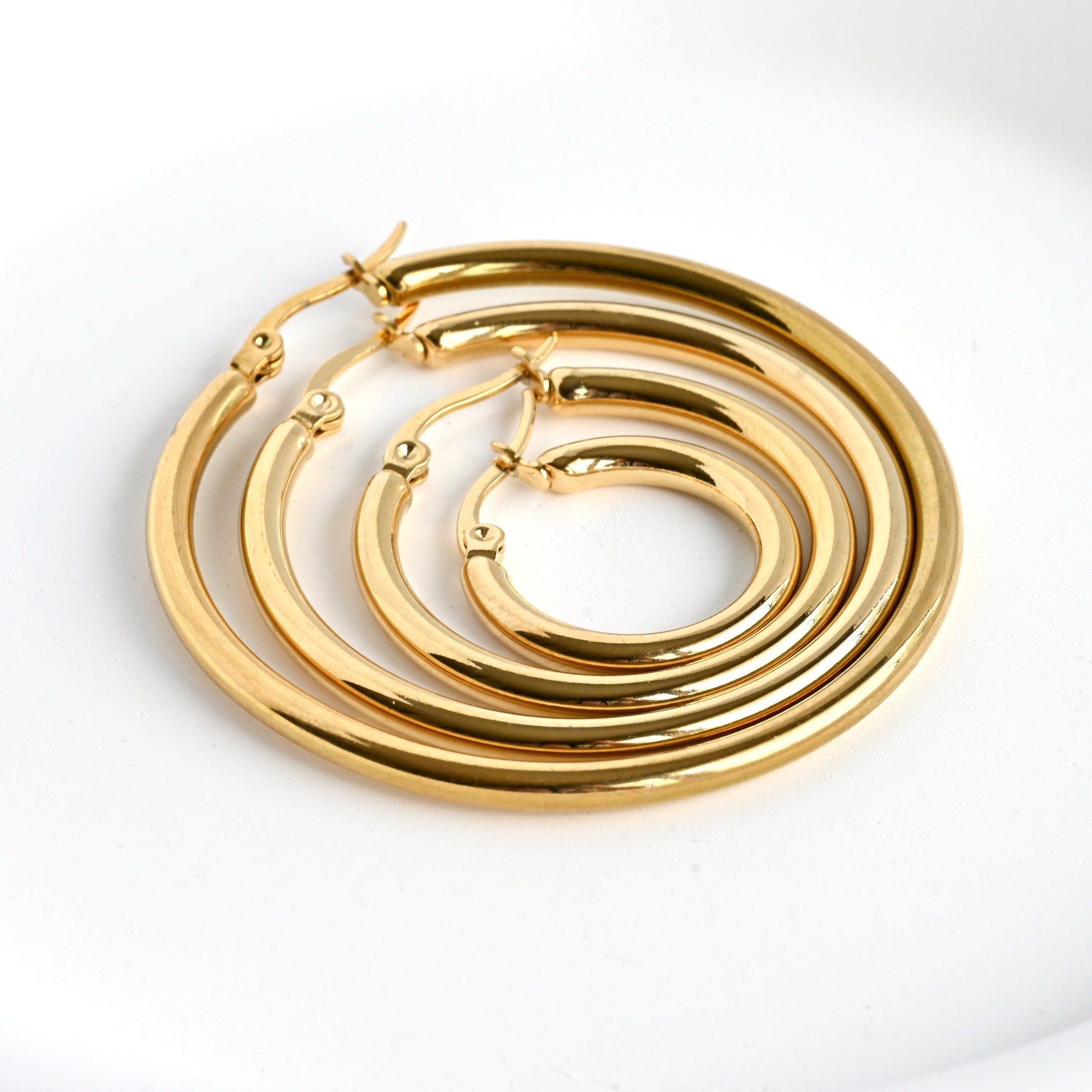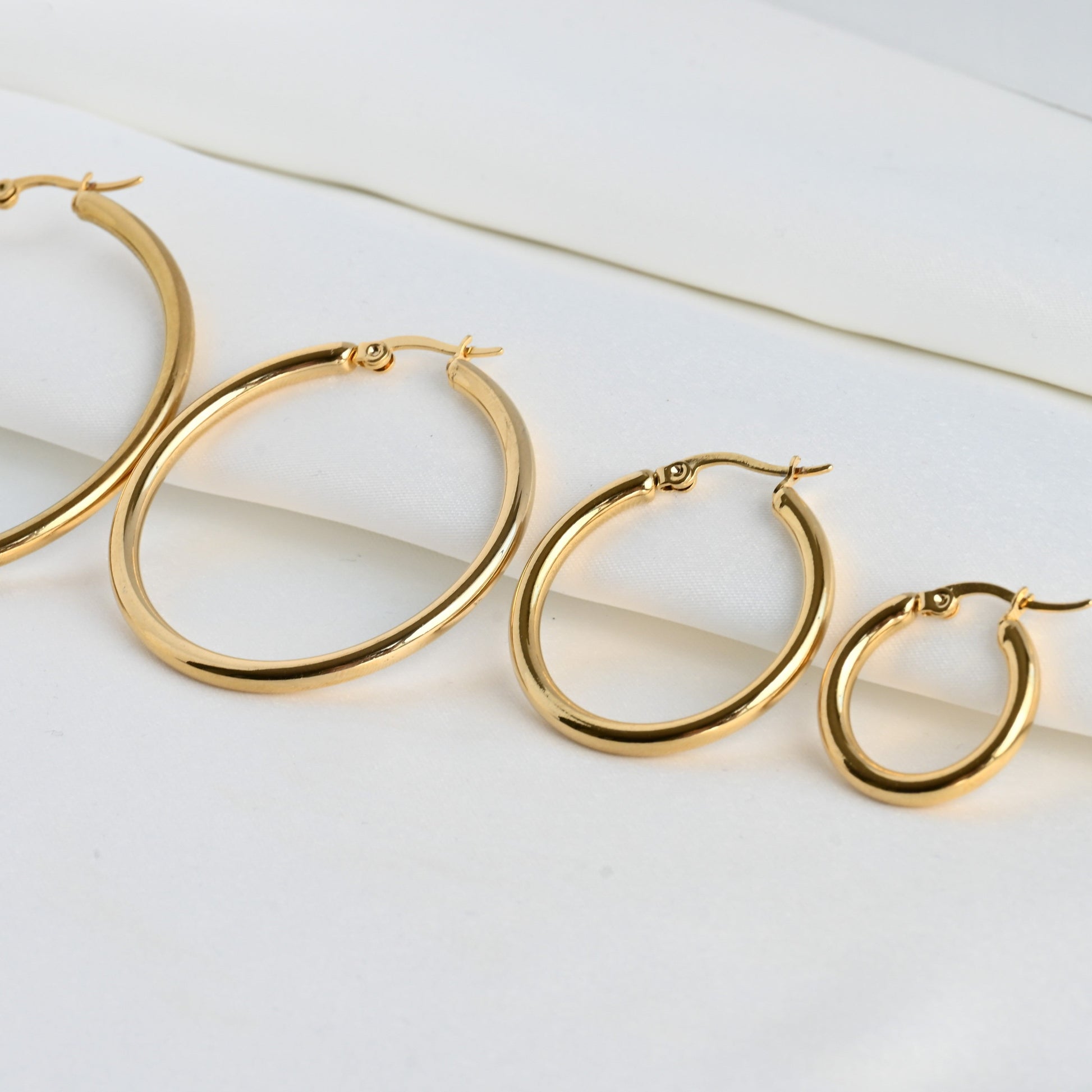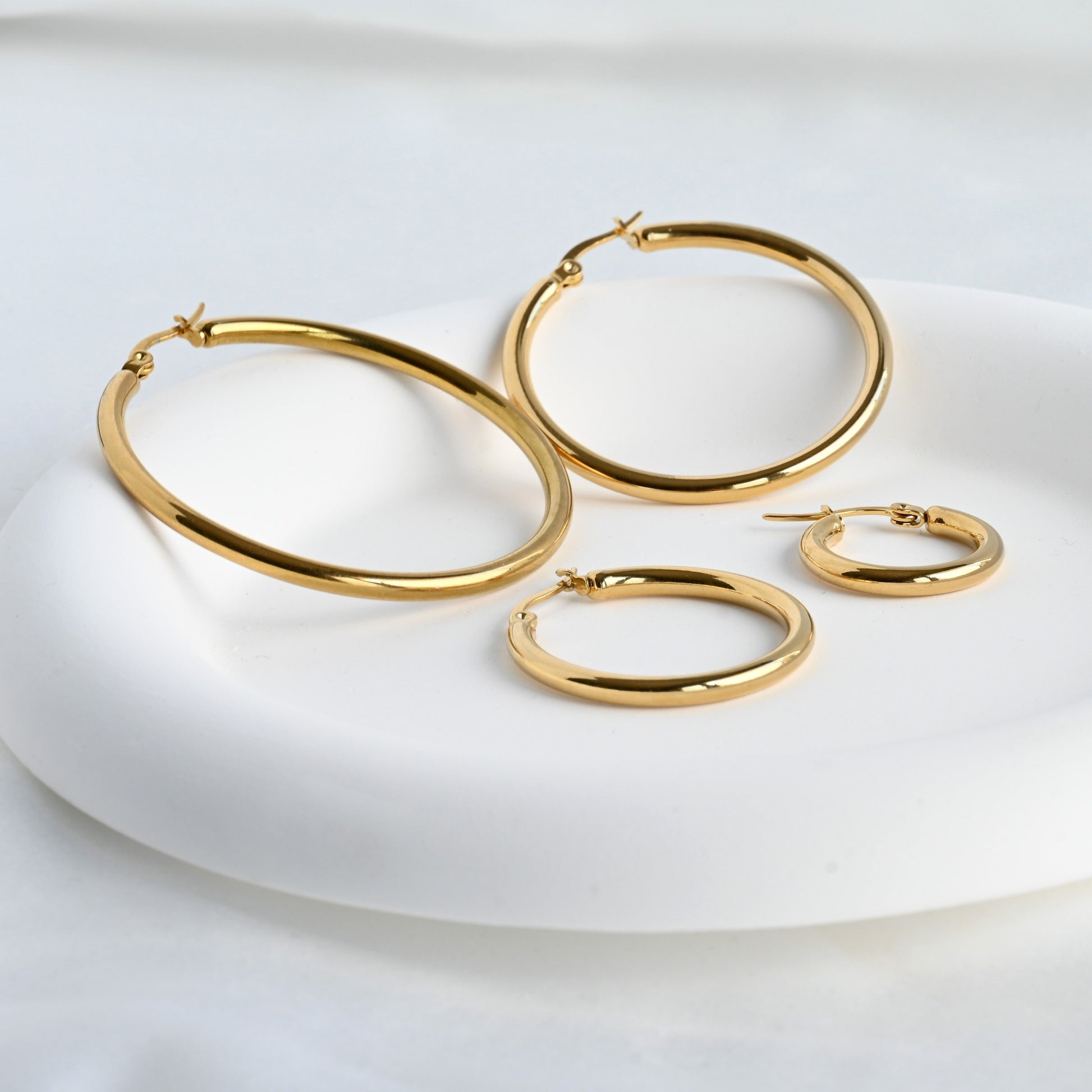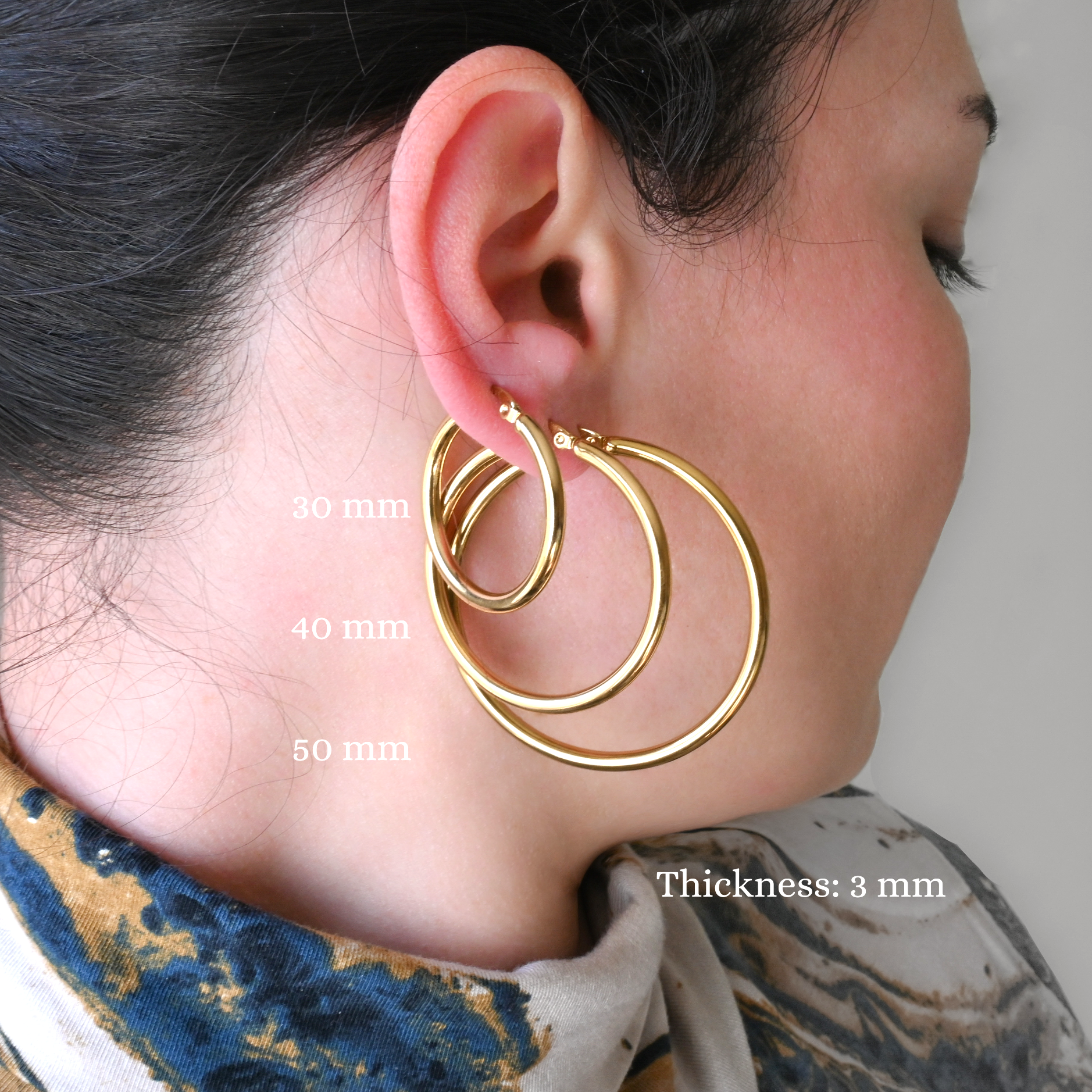 Classy and minimalistic in design, these 3 mm hoop earrings are crafted in 18k Gold PVD plated stainless steel and have a diameter of ,20 30 mm, 40 mm and 50 mm. They will fit just about any outfit. Plus, they are tarnish resistant and waterproof; you can wear them to the pool or gym and they won't tarnish.