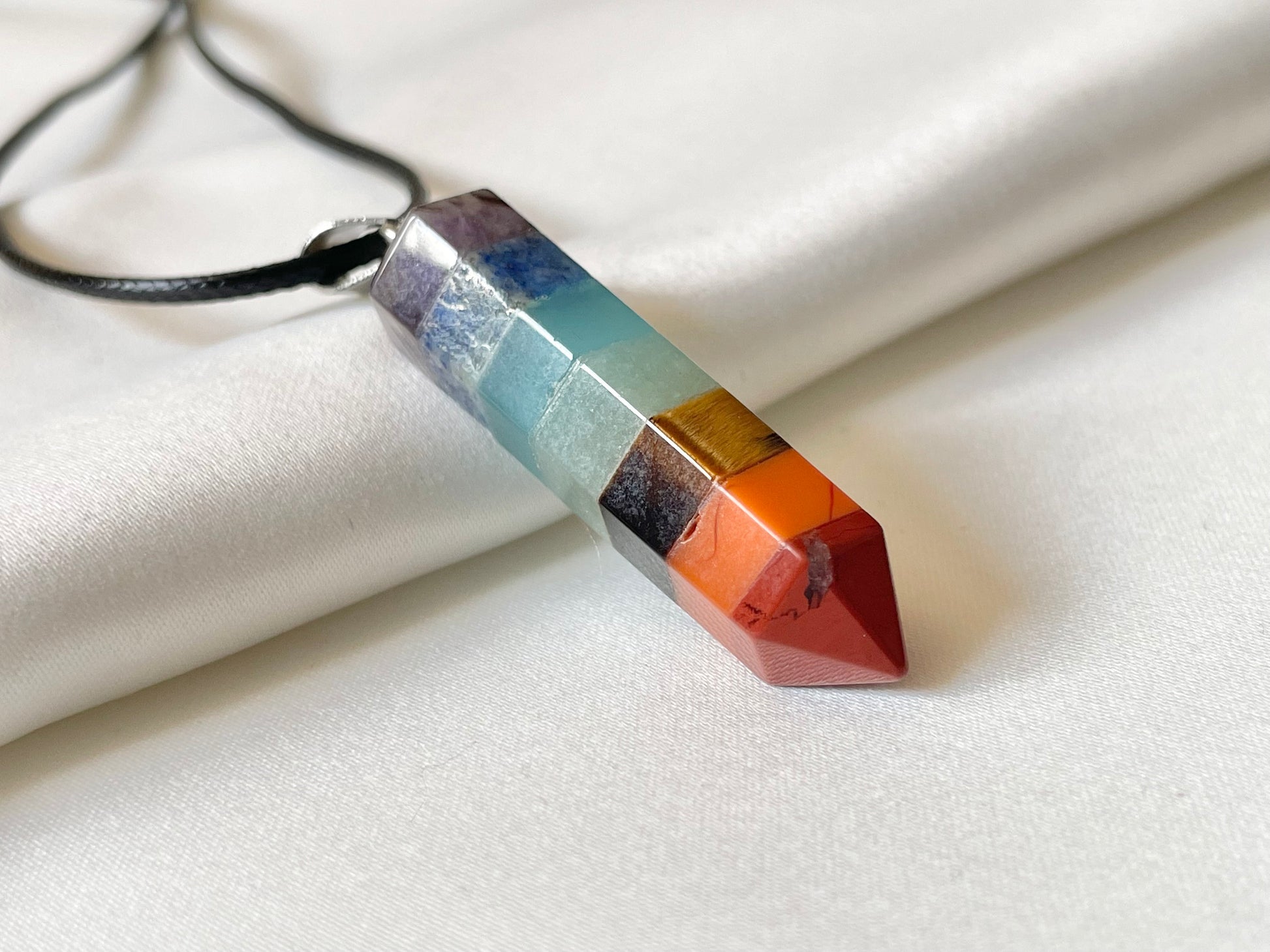 This energy crystals necklace features gleaming stones including amethyst, lapis lazuli, synthetic aquamarine, green aventurine, yellow tiger eye, red agate and red jasper, each of which represents a different chakra, aka energy centers, of human body, bringing you energy and healing you! Choose from different shapes of the crystal pendants from cylindrical, cone or stacked stones and necklace types: black cord or silver metal chain.