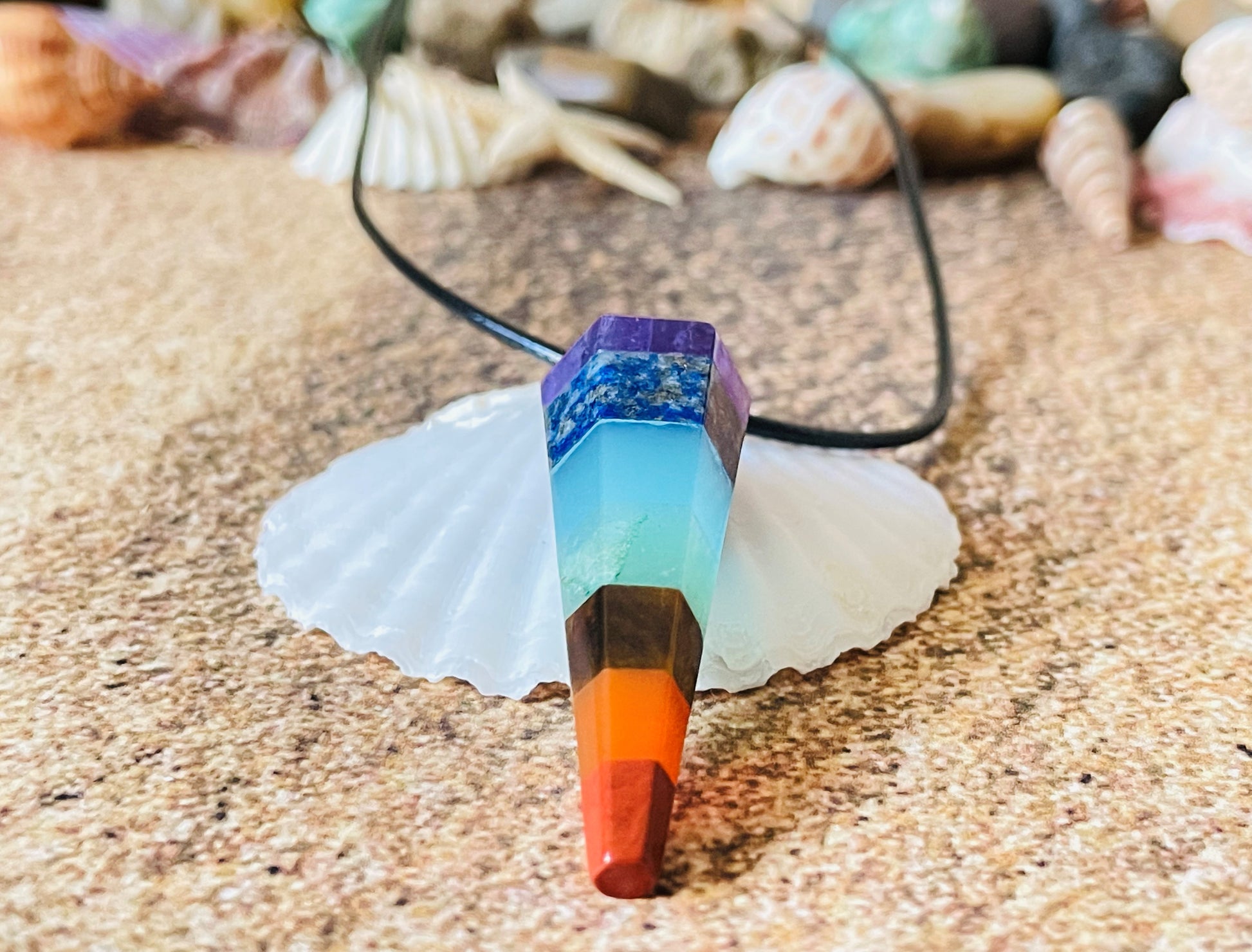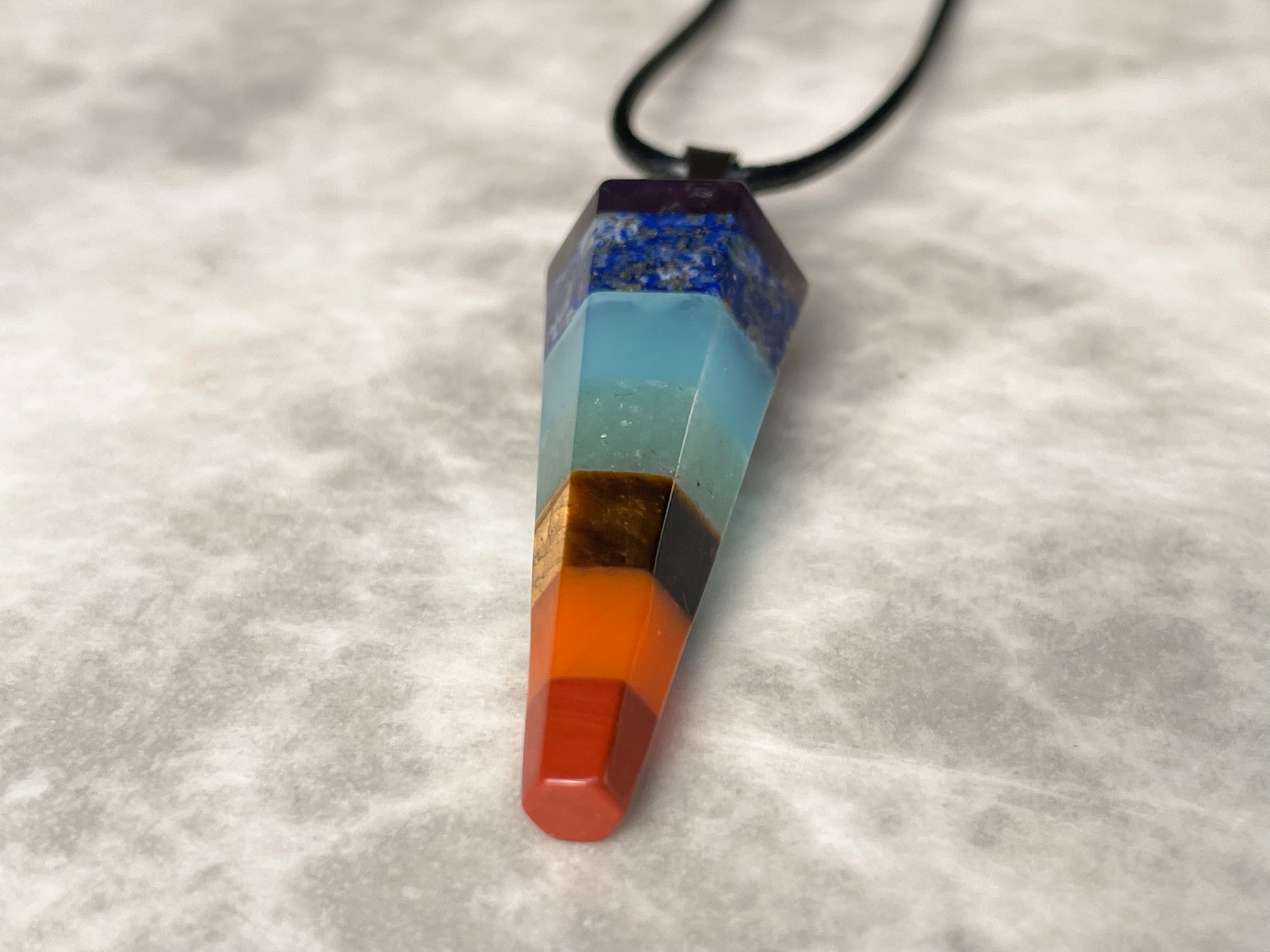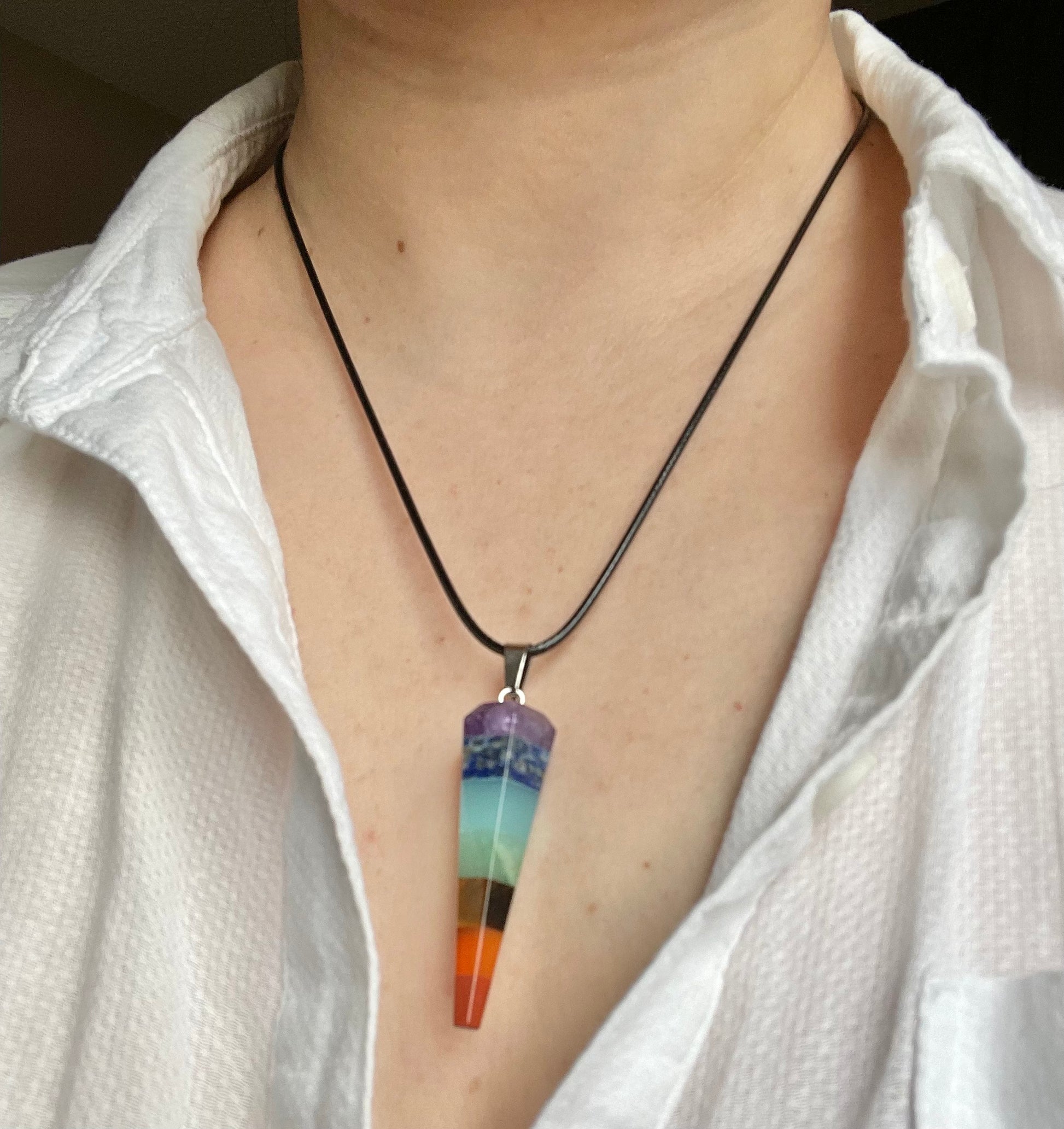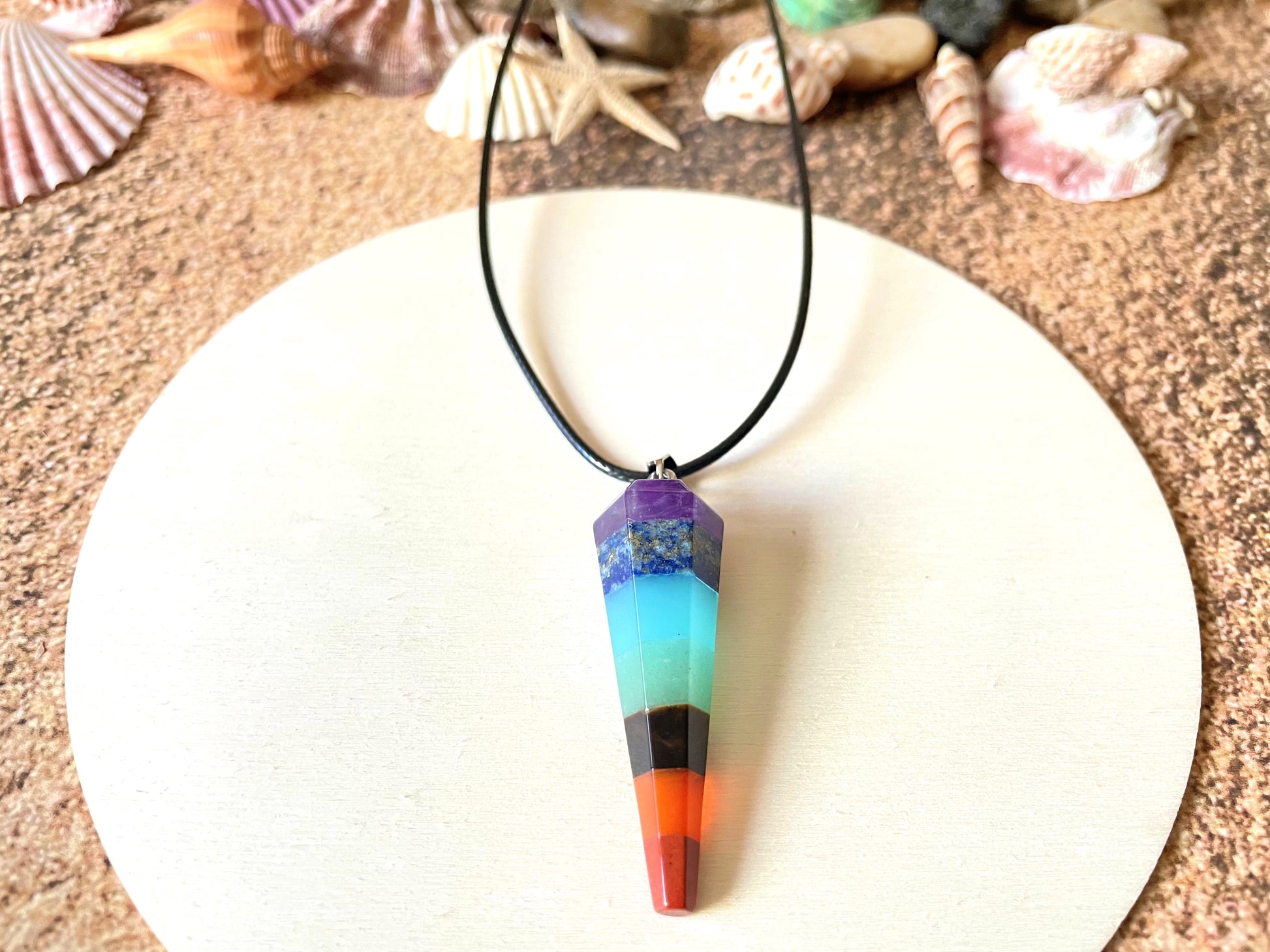 This energy crystals necklace features gleaming stones including amethyst, lapis lazuli, synthetic aquamarine, green aventurine, yellow tiger eye, red agate and red jasper, each of which represents a different chakra, aka energy centers, of human body, bringing you energy and healing you! Choose from different shapes of the crystal pendants from cylindrical, cone or stacked stones and necklace types: black cord or silver metal chain.