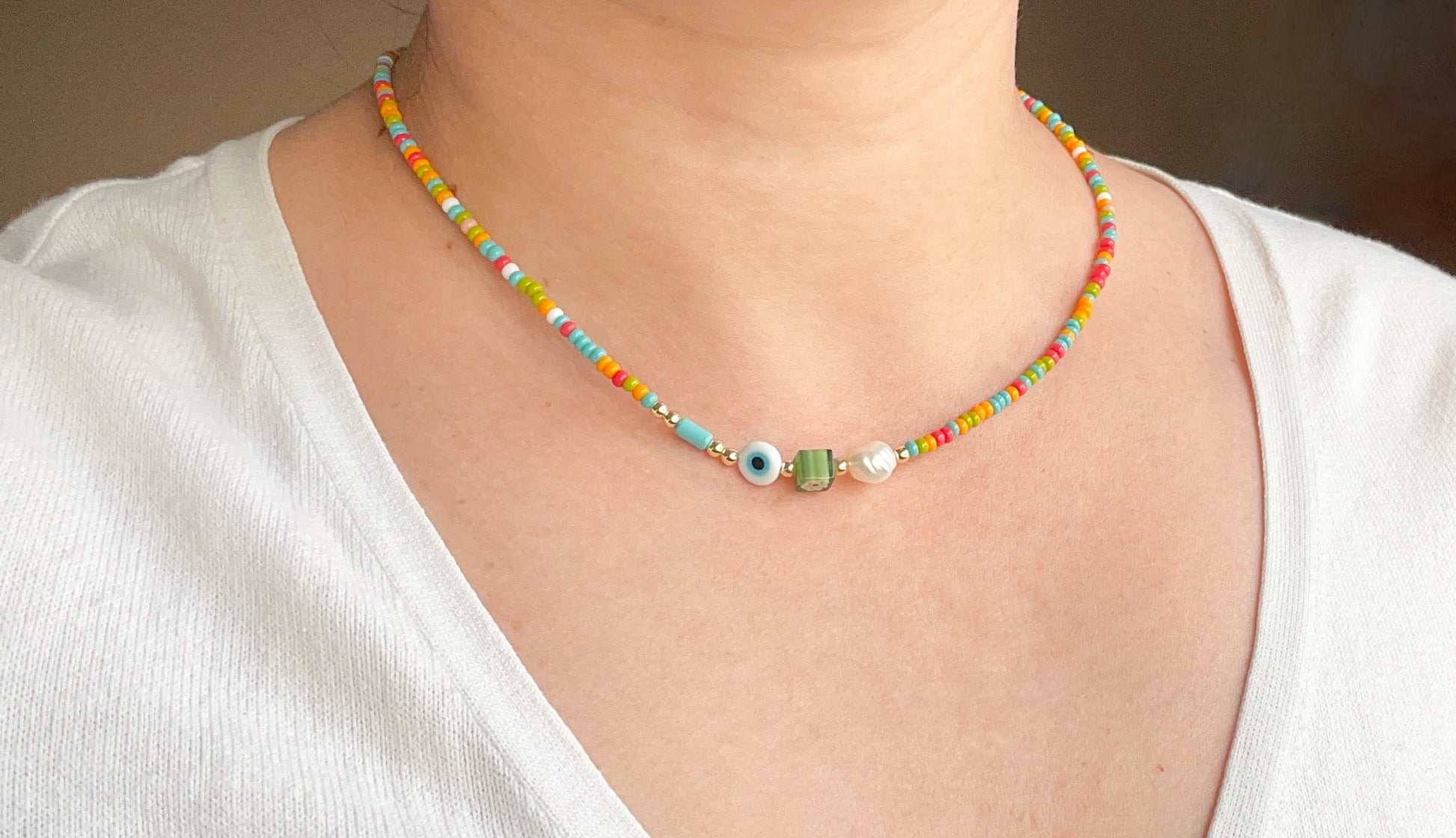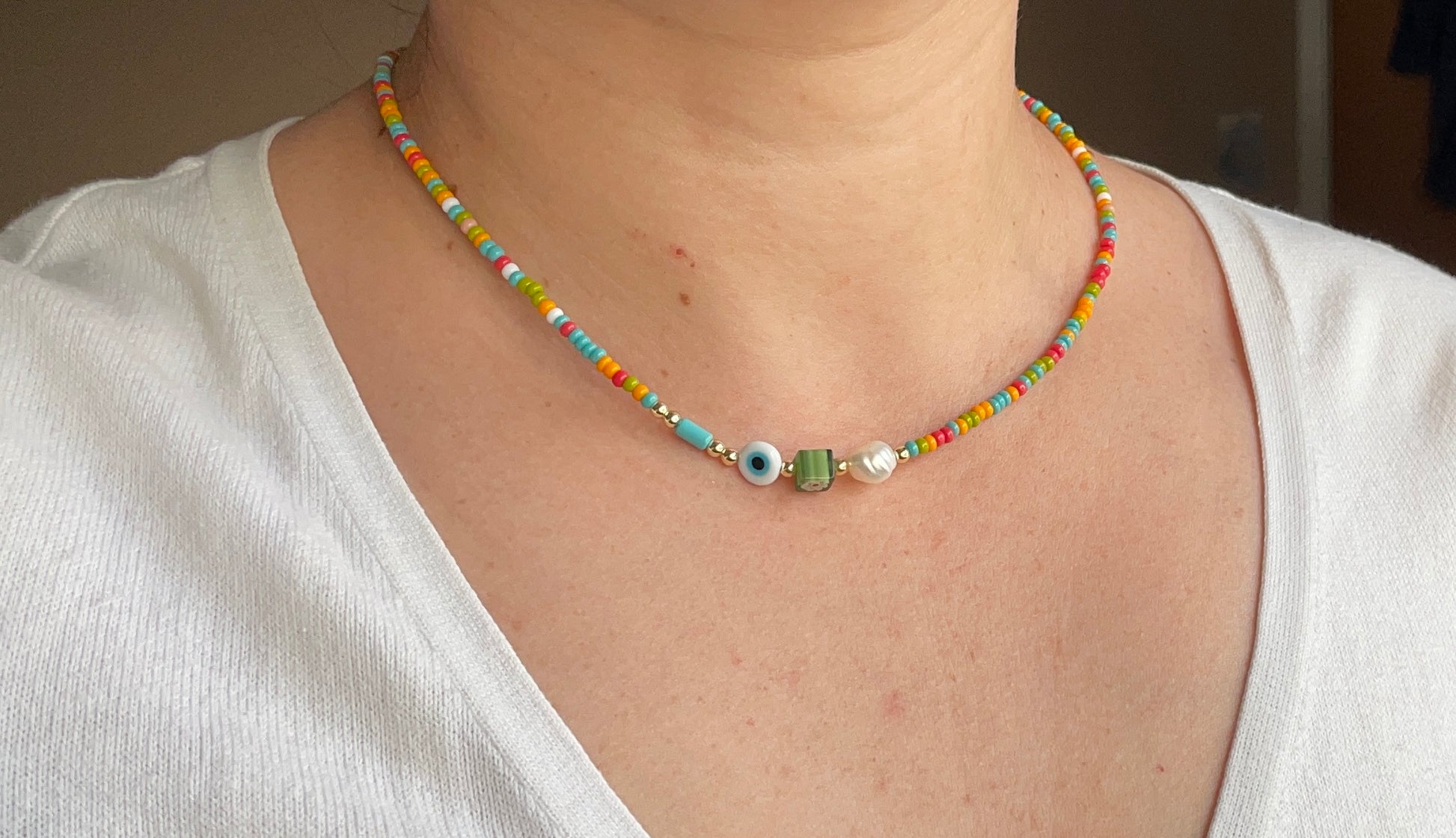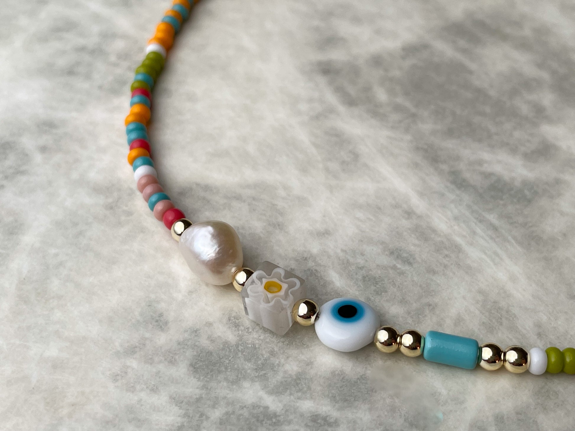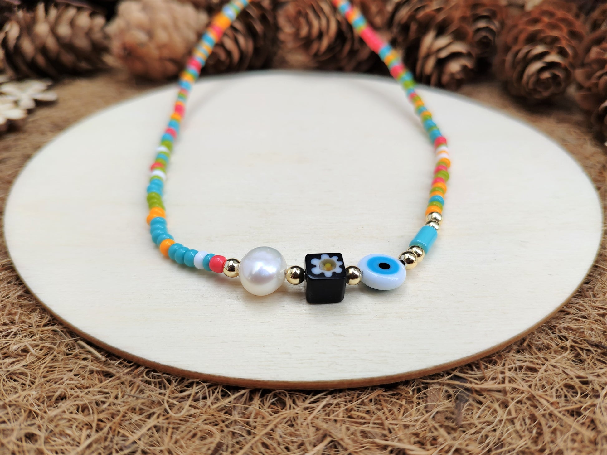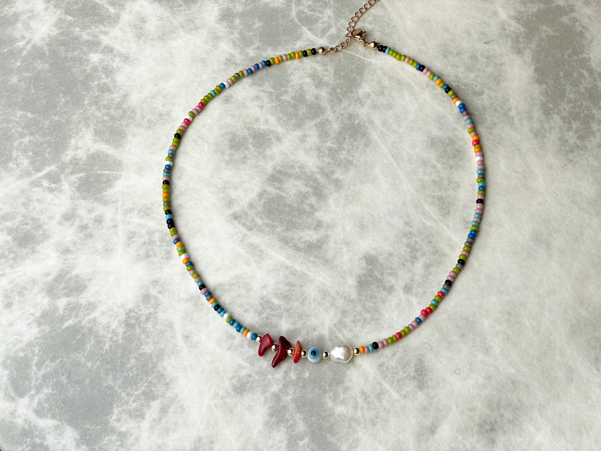 This gorgeous evil eye choker necklace is boho take on traditional evil eye jewelry and a perfect accessory to complement your summer outfit. The necklace comes in two different styles although the seed beads used are the same in both designs. The first design features a freshwater pearl, a flower cube in assorted colors and a flat evil eye bead in white while the second design comes with a freshwater pearl, a sphere evil eye in white and three polished red agate rocks. These one-of-a-kind beaded chokers are a great gift for a loved one.