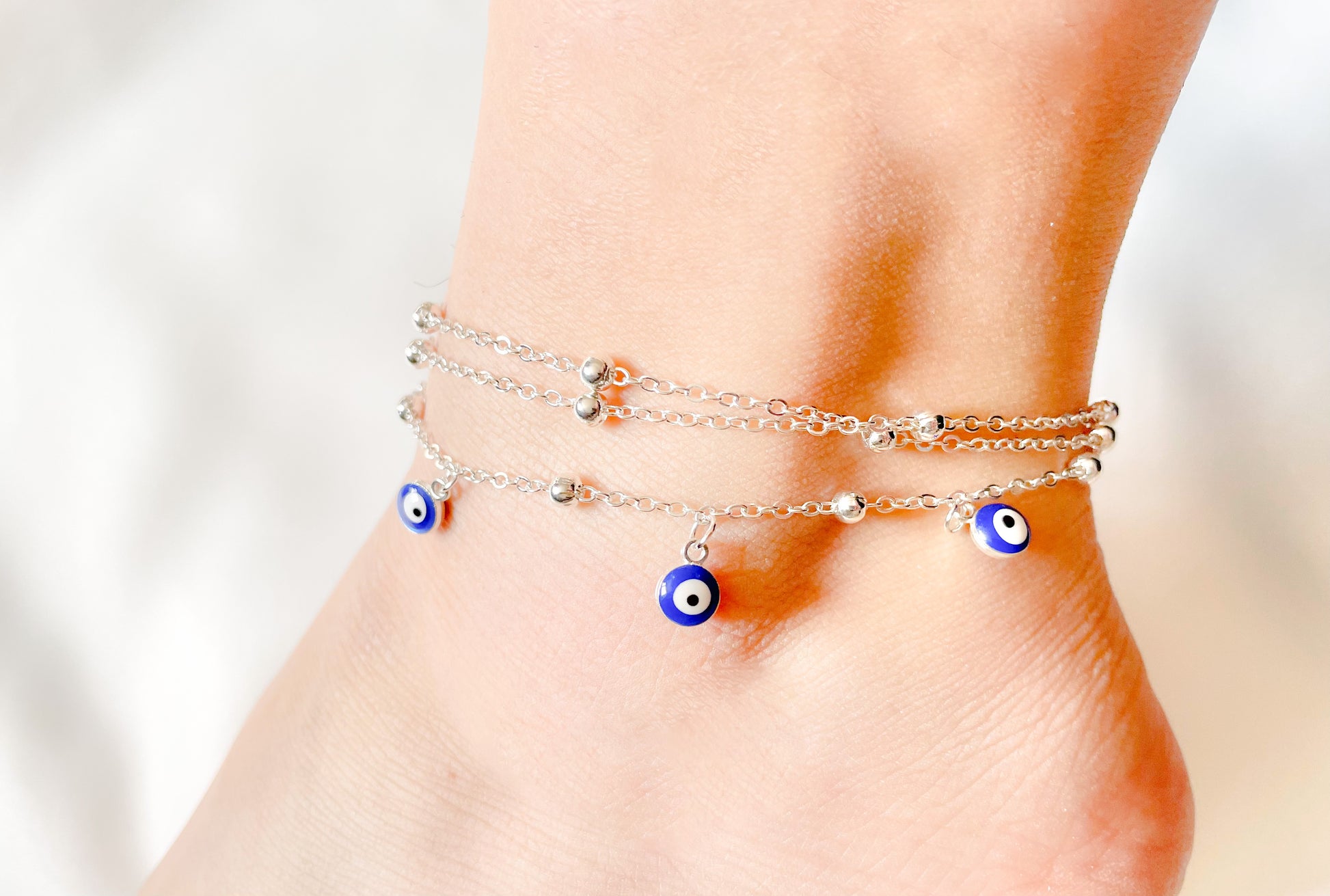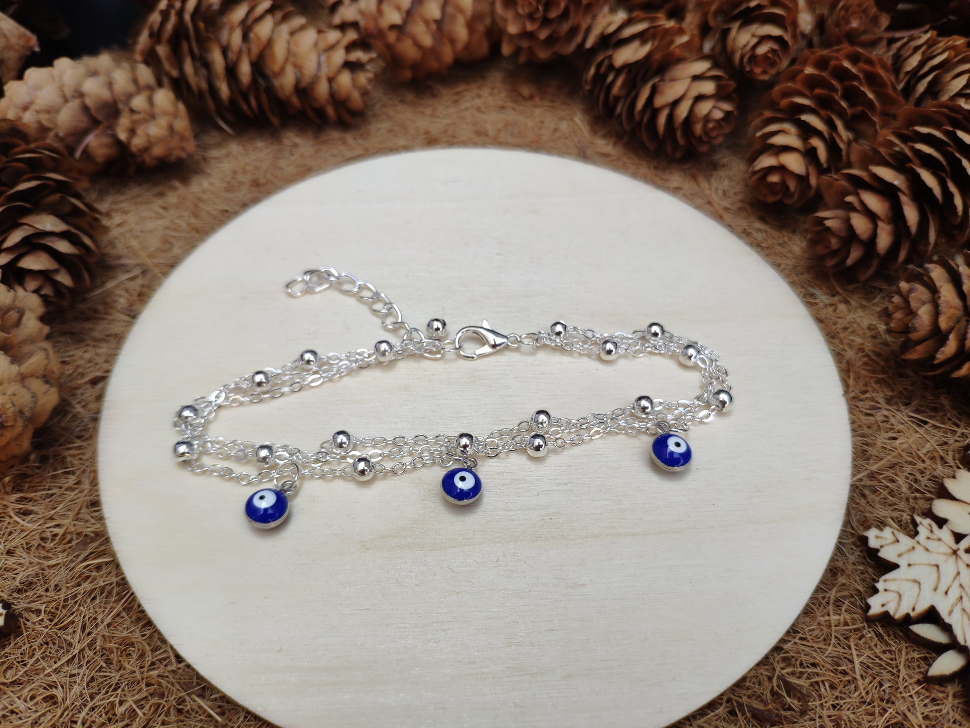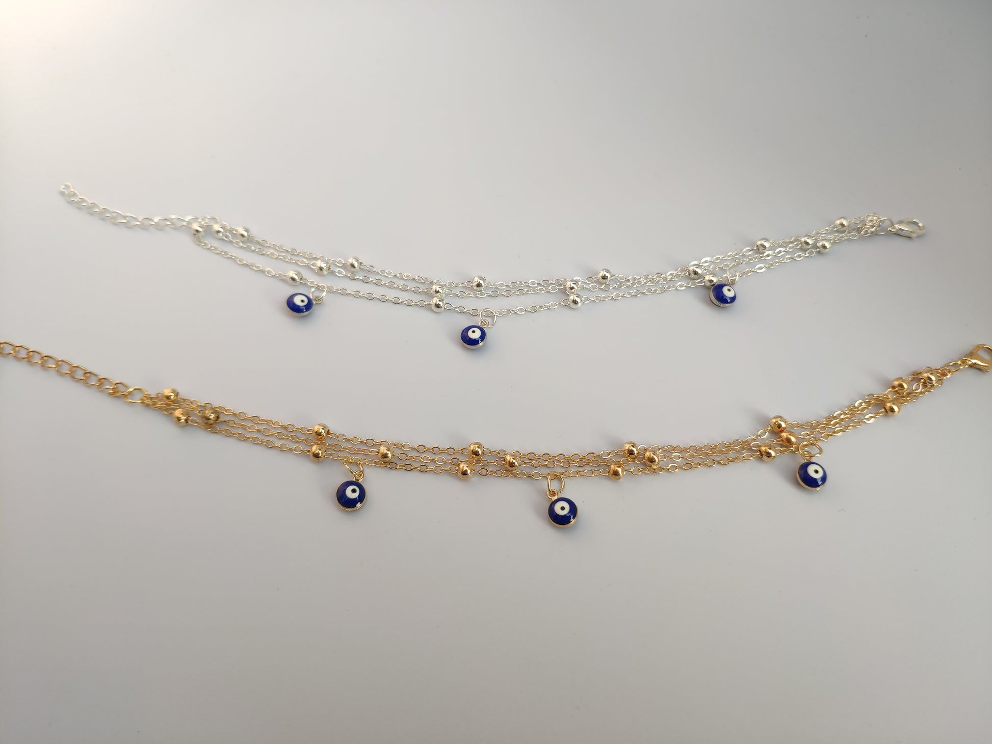 A bohemian take on classic evil eye jewelry, this three layered design features satellite chains and three tiny dangle evil eye charms attached to one of the layers. A symbol of divine protection, this piece will protect you whenever wherever!