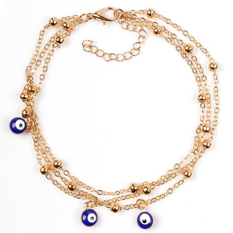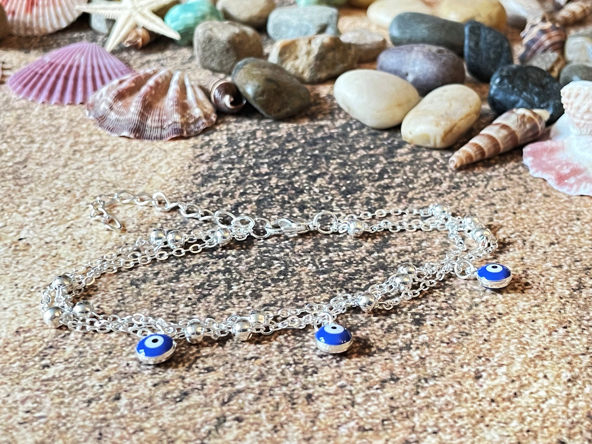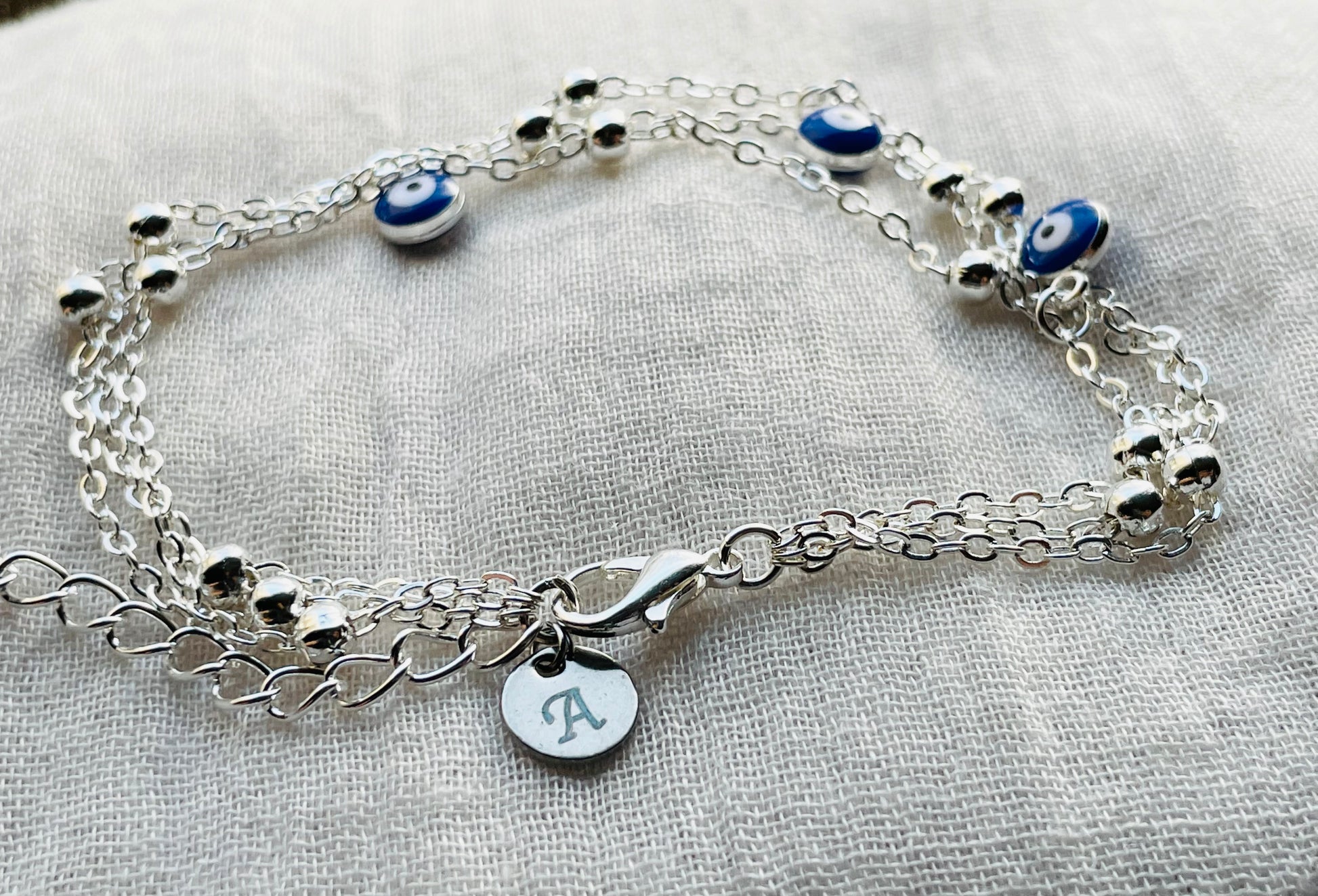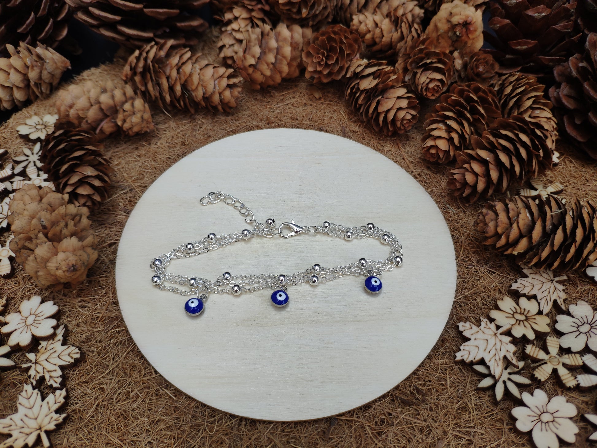 A bohemian take on classic evil eye jewelry, this three layered design features satellite chains and three tiny dangle evil eye charms attached to one of the layers. A symbol of divine protection, this piece will protect you whenever wherever!