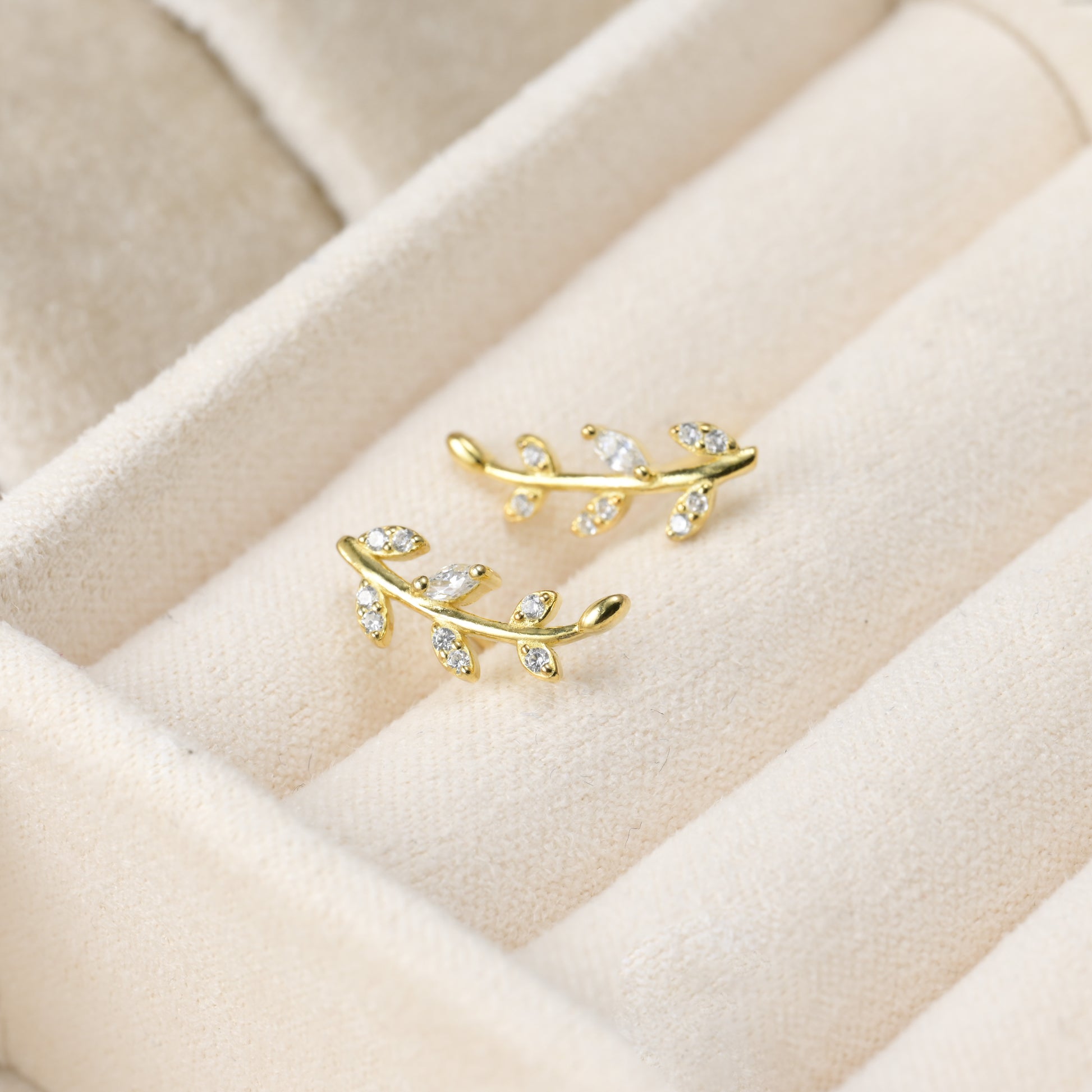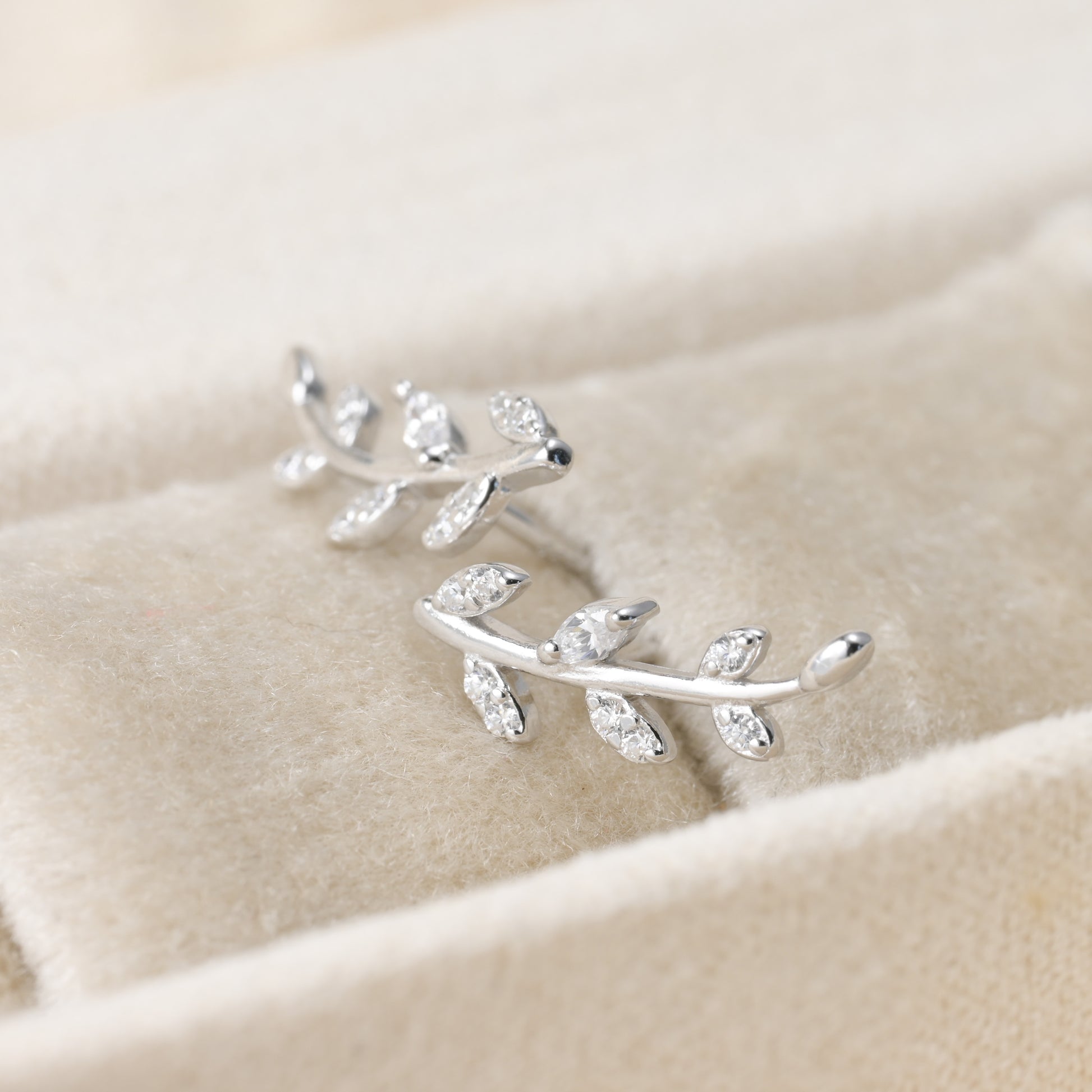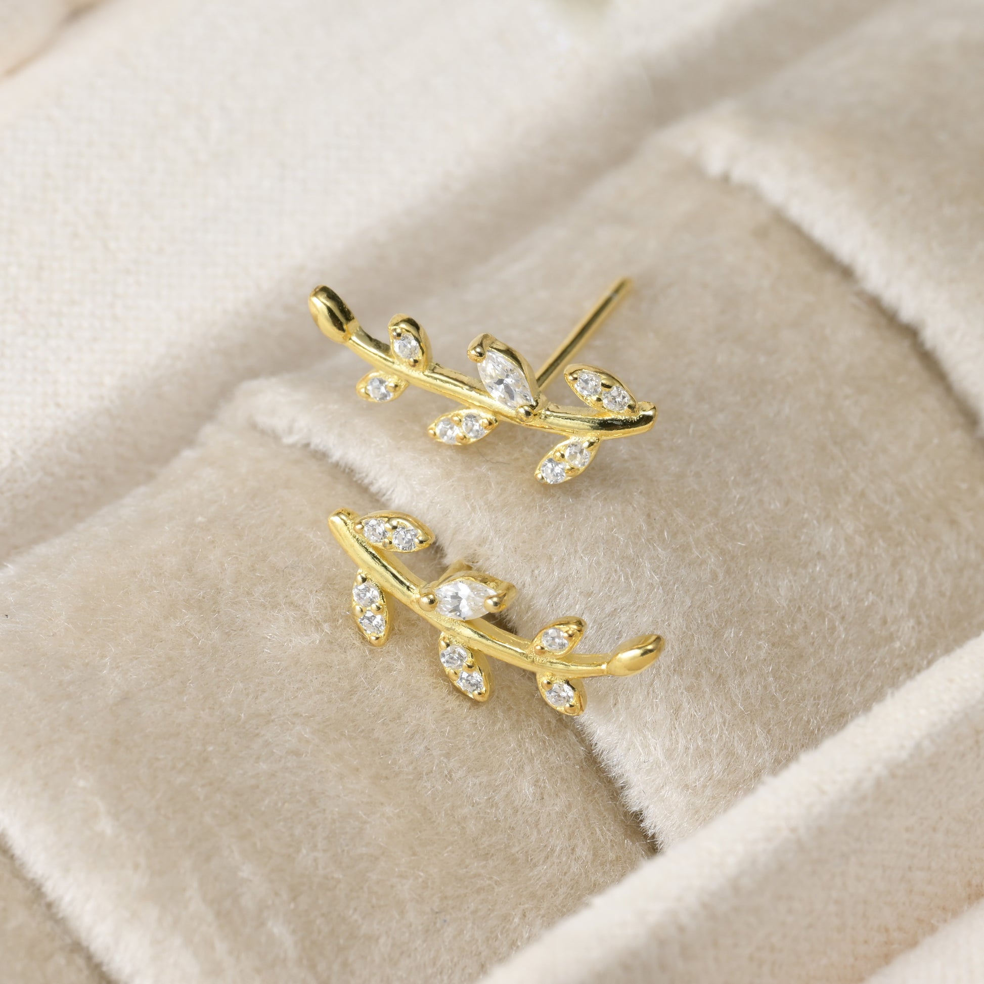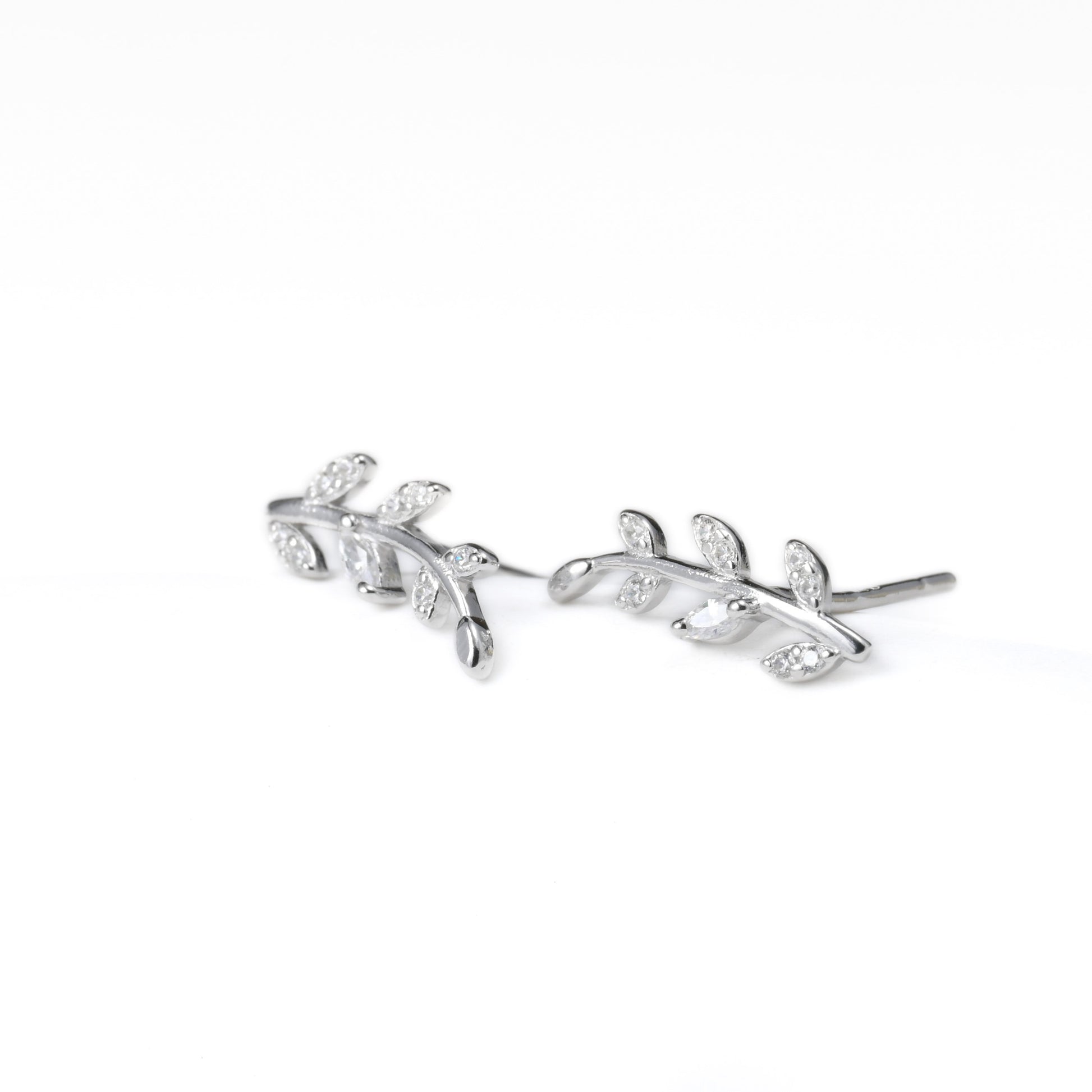Elegant diamond olive branch stud earrings in sterling silver, measuring 5x13mm and adorned with cubic zirconia stones. Available in 18k gold and silver finish.