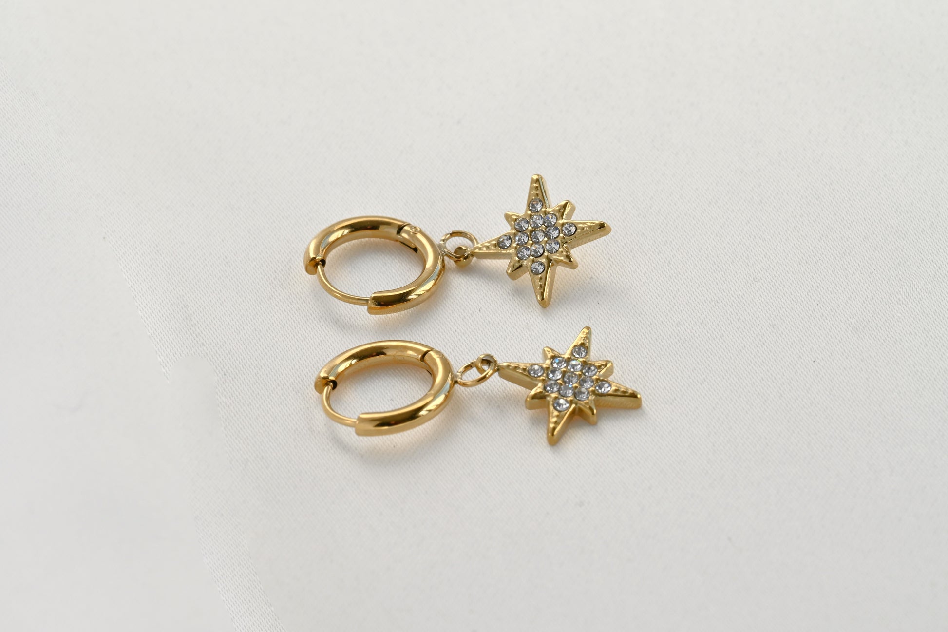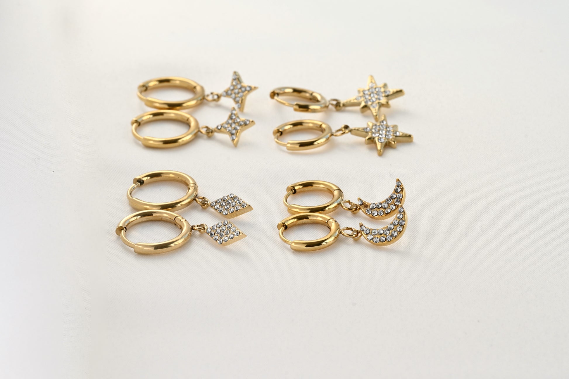These sparkly diamond huggie hoops are perfect for you if you are looking for a jewelry piece that will greatly elevate your outfit. Crafted in 18k gold PVD plated stainless steel and high quality cubic zirconia stones, these celestial hoops come in four different designs: A. diamond; B. sparkle ; C. moon ;and D. north star. Plus, they are tarnish resistant and waterproof; you can wear them to the pool or gym and they won't tarnish.