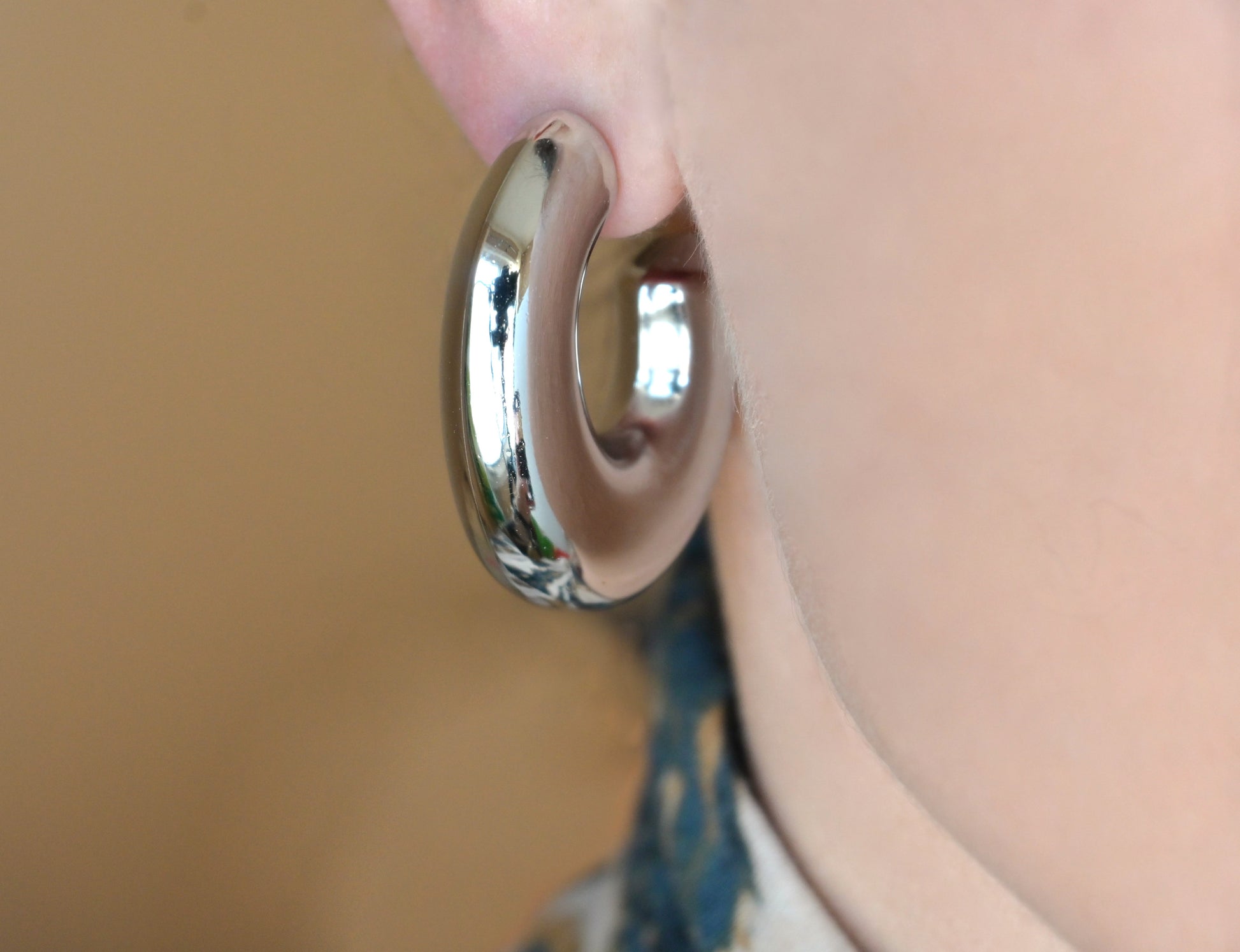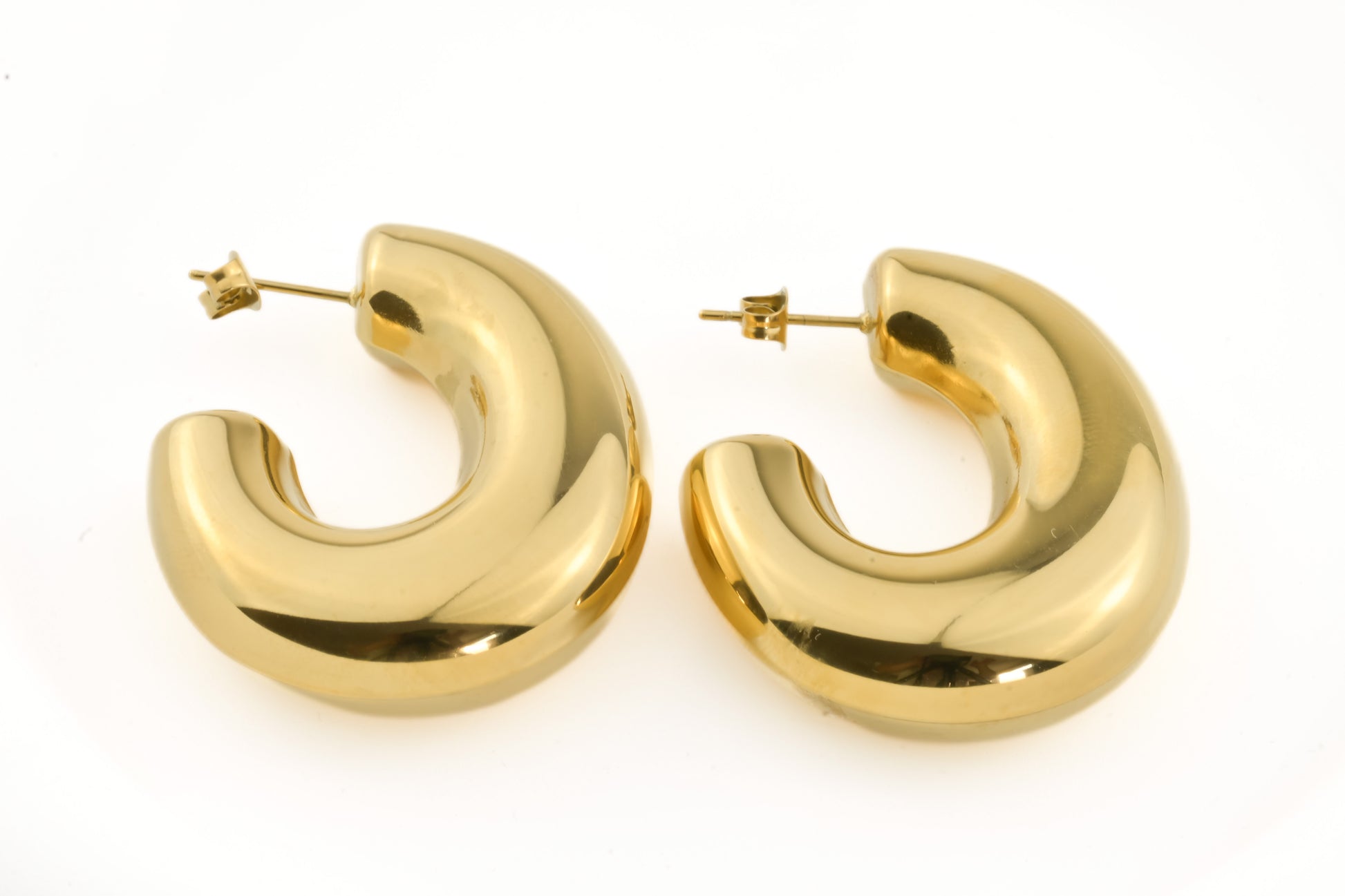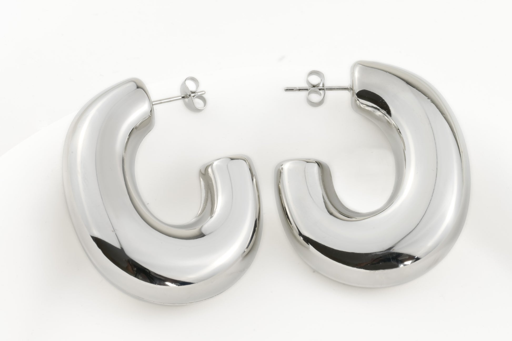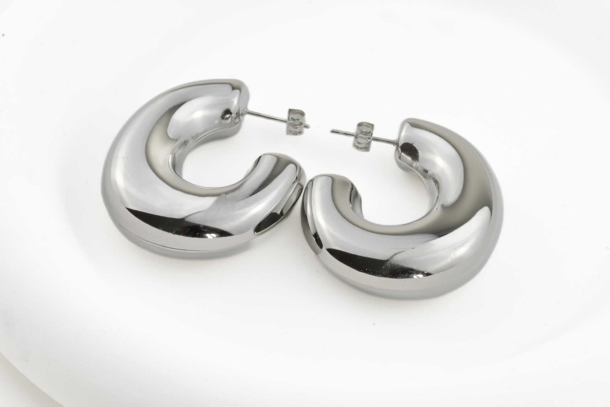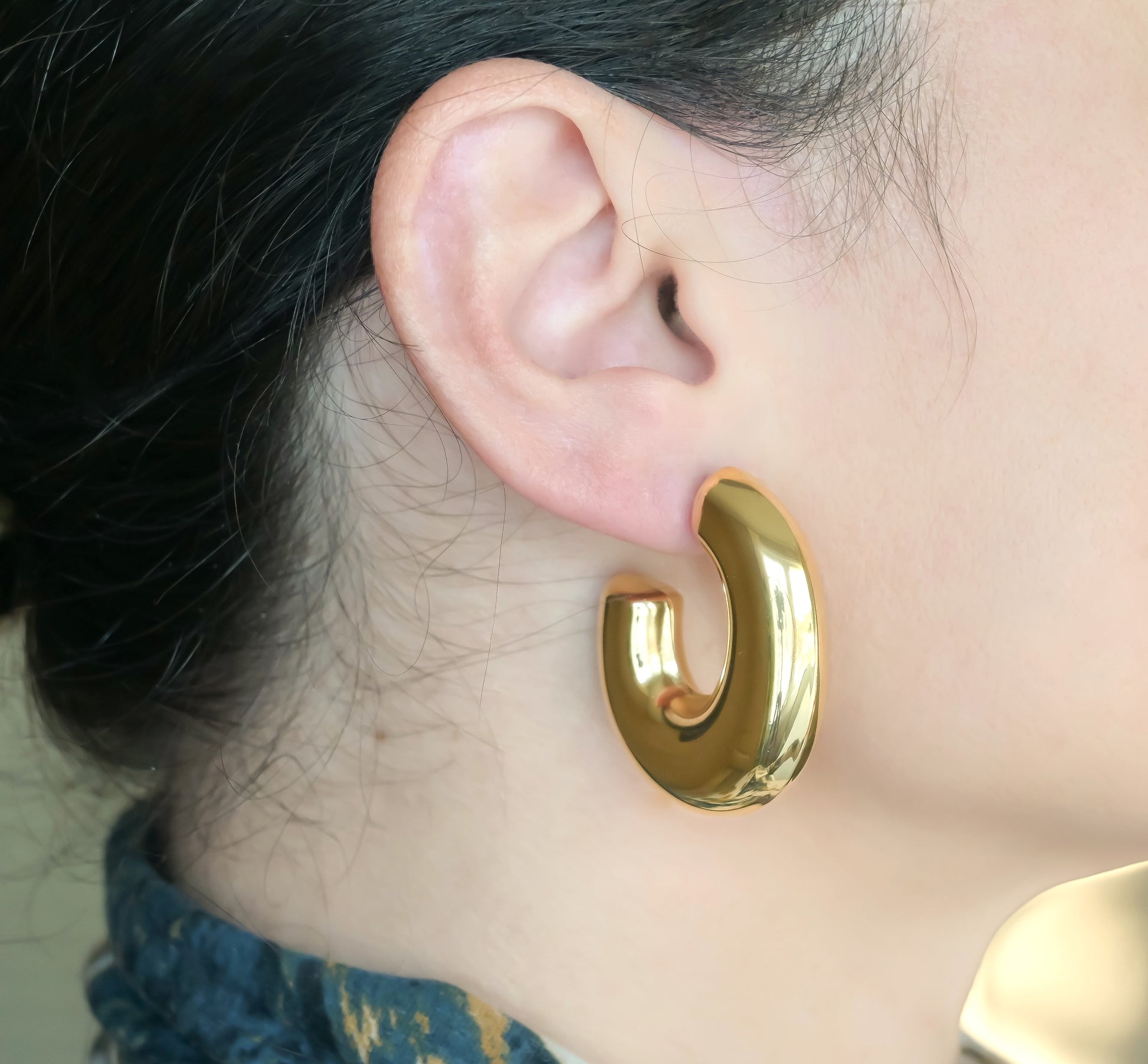 Our Large Chunky Hoop Earrings feature an elongated C shape with a stud closure for secure wear. Crafted from stainless steel and plated with 18k gold PVD finish, they offer durability and style. Complete with butterfly backs, these hoops are a versatile addition to any jewelry collection.