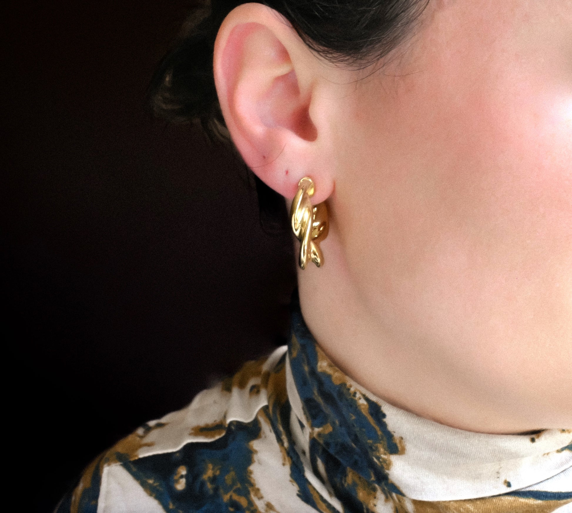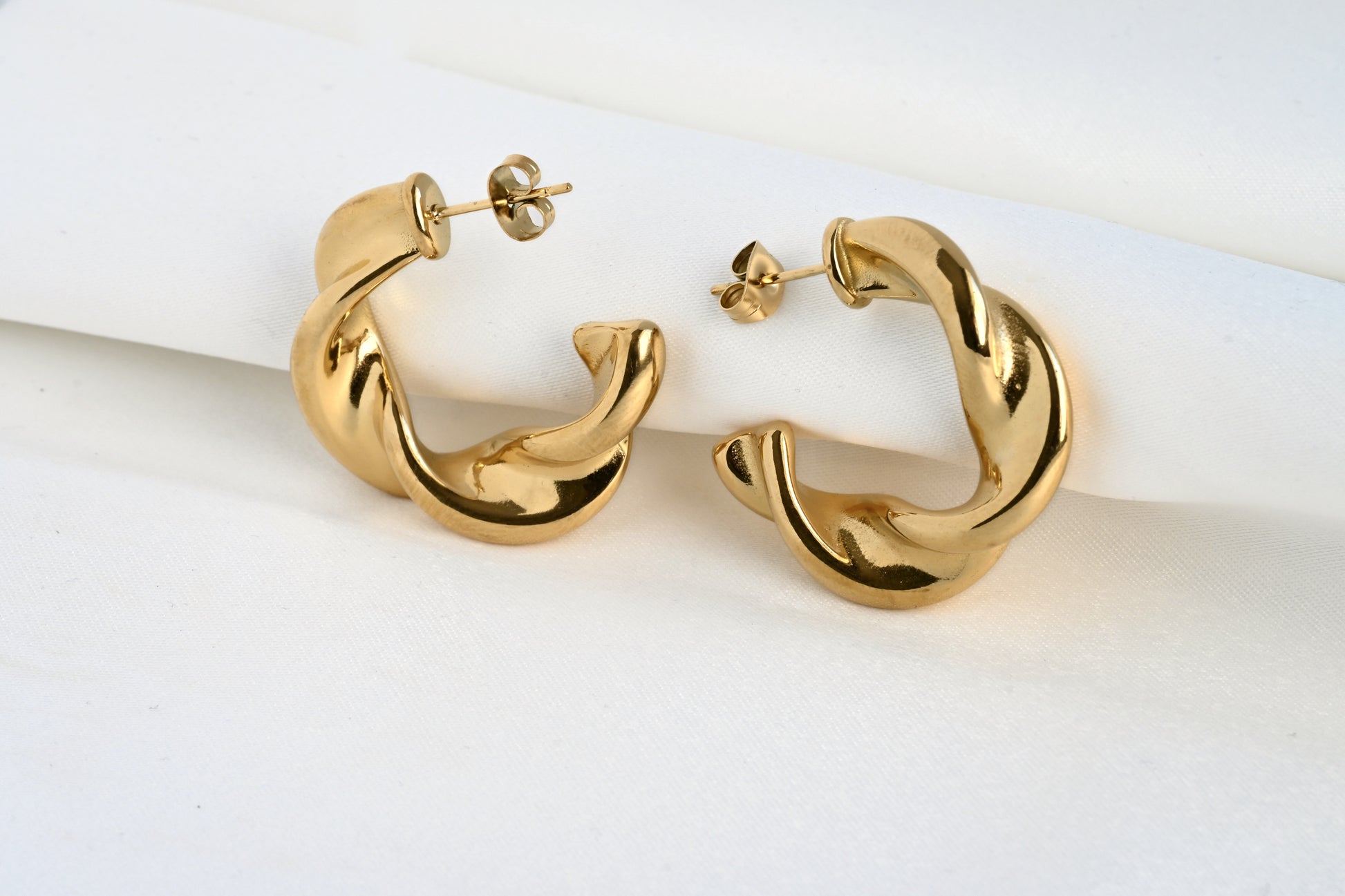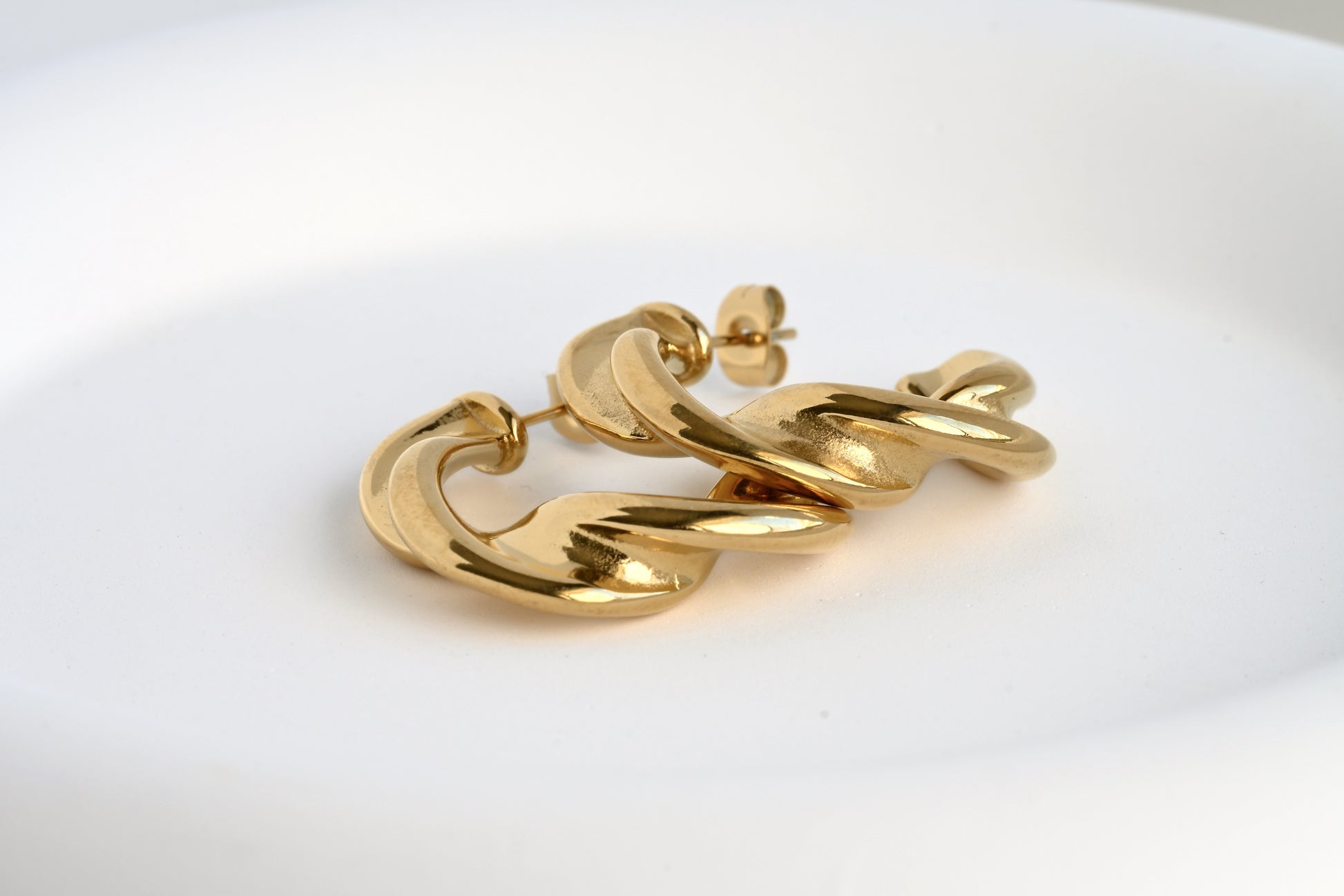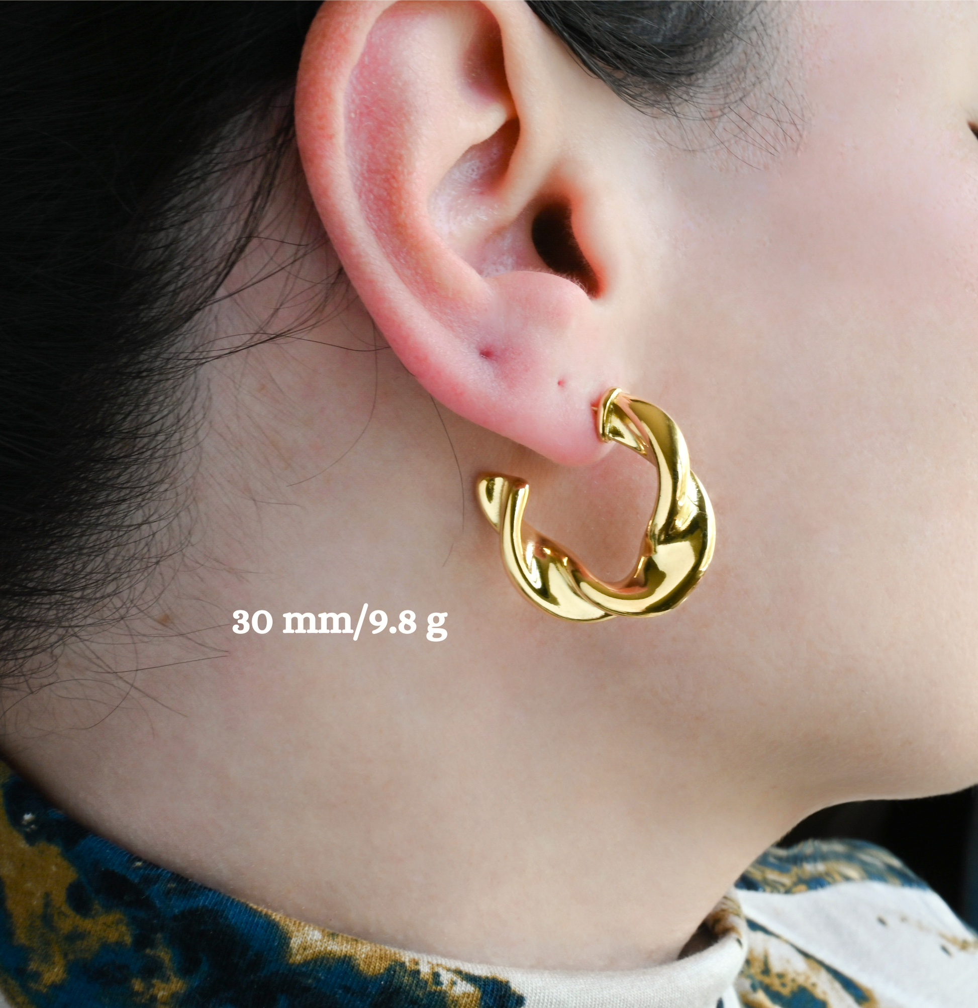 A modern chunky sculptural design, these 30 mm thick twisted hoop earrings will be your new go-to piece. Crafted in high-quality stainless steel, these anti-tarnish waterproof hoops are slightly on the heavier side but will greatly elevate your outfit for a night out! Check out our lightweight hoops if you are looking for earrings you can wear all day.