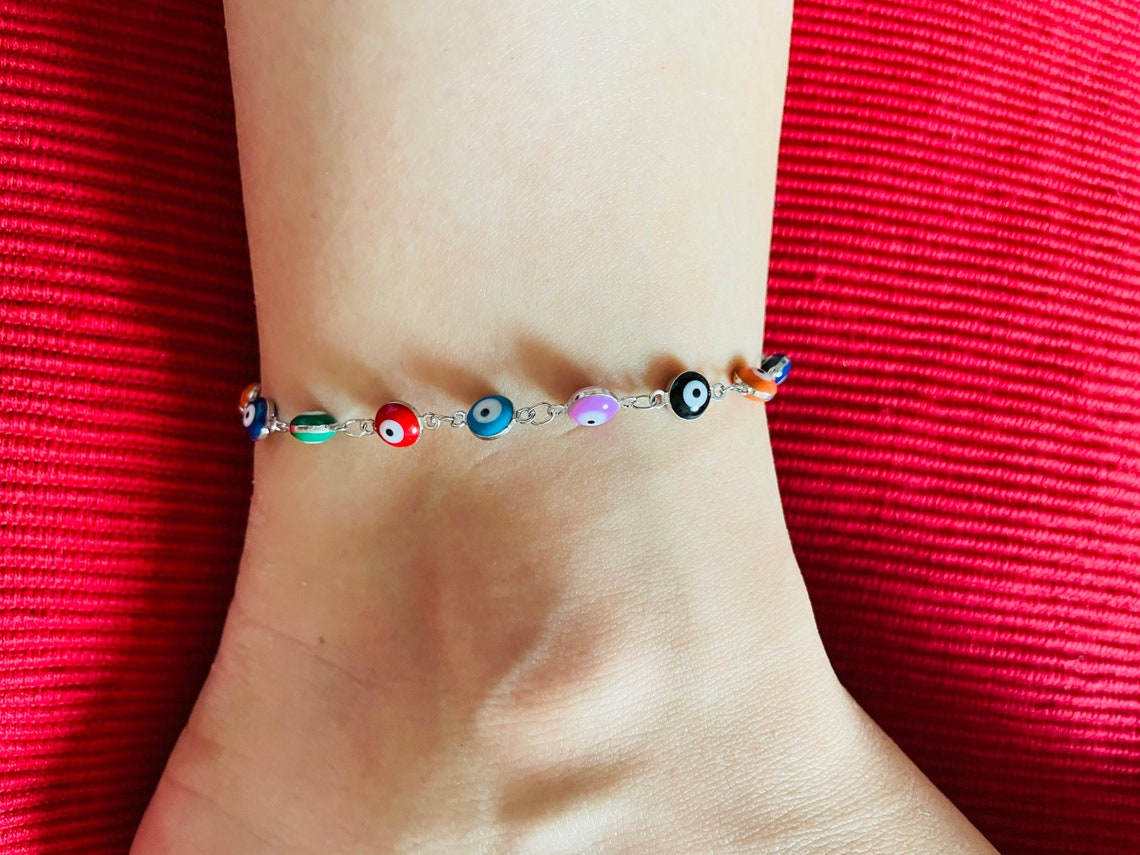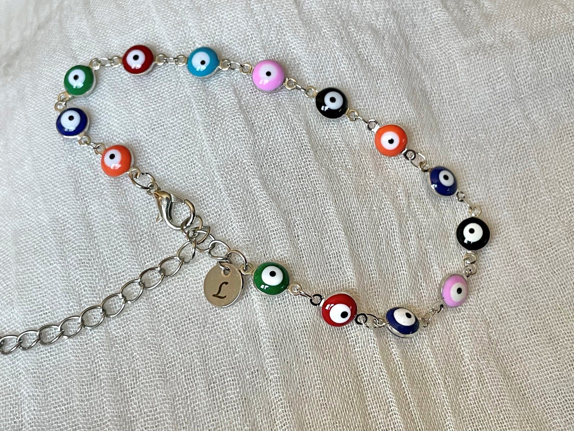 A vibrant colorful evil eye ankle bracelet that will complete your summer outfit! This beautiful evil eye anklet is a boho take on traditional evil eye jewelry. Featuring vibrant mixed-color beads framed in a metal setting, this ankle bracelet is a combination of beaded and chain designs with an adjustable lobster clasp closure. Add a touch of personalization with a letter charm at the clasp area. Available in gold and silver.
