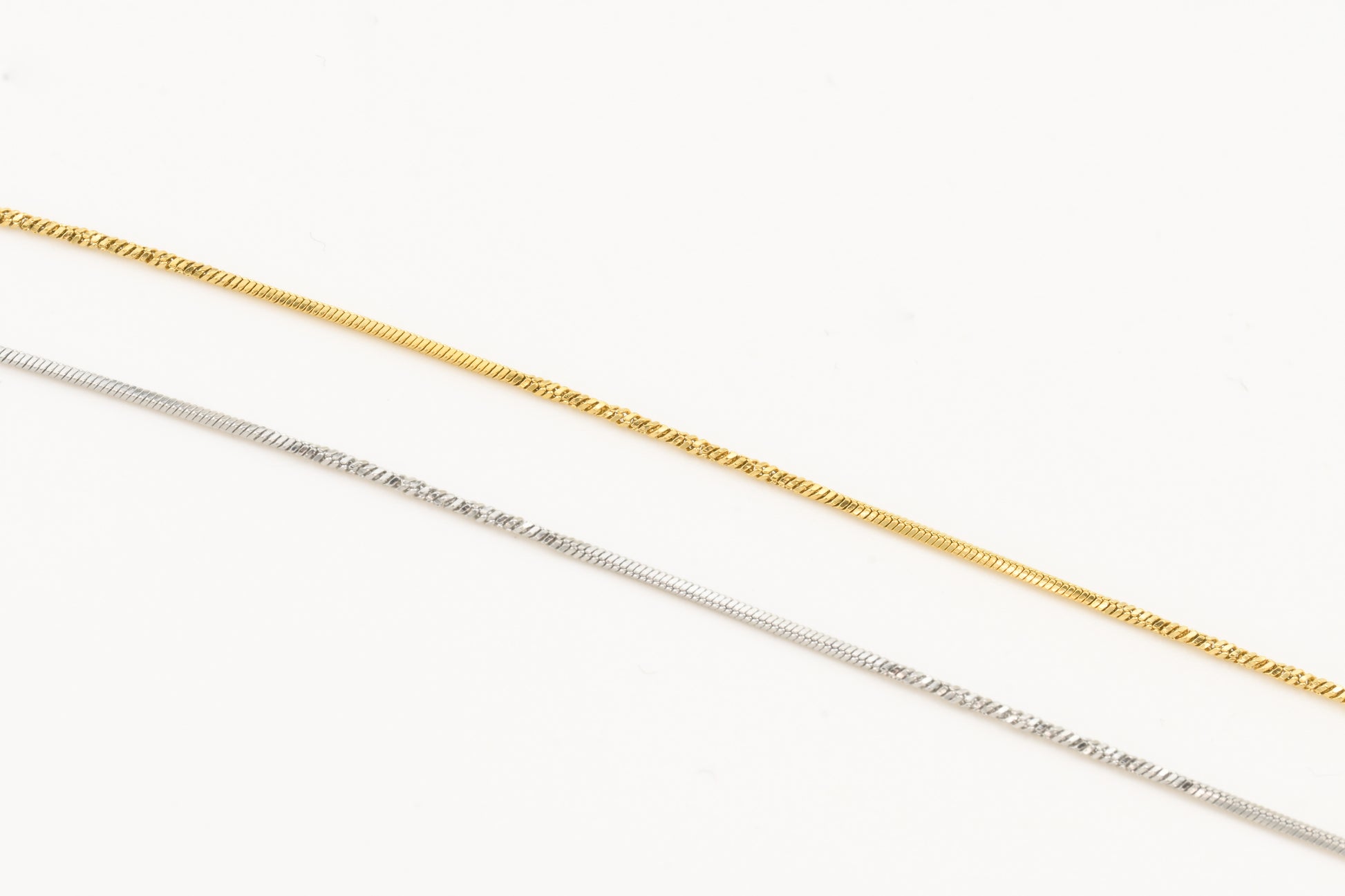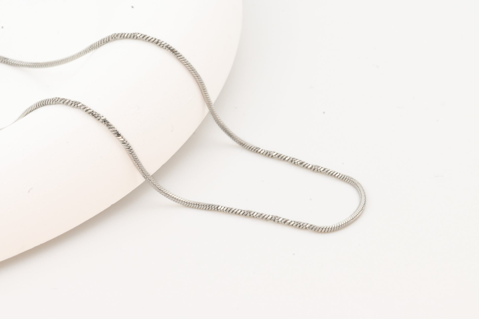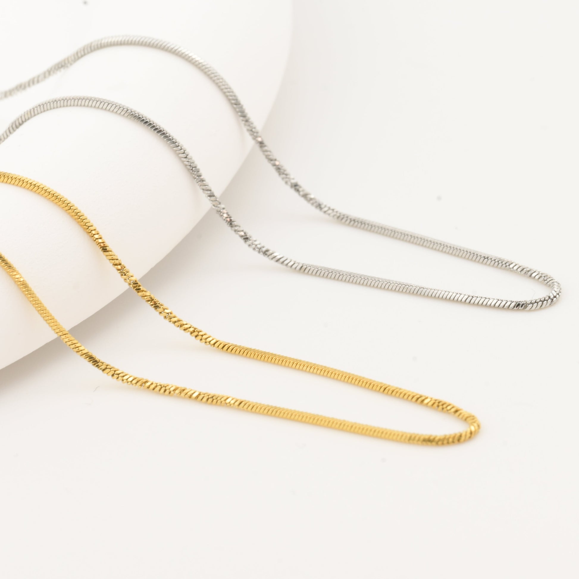 Elevate your style with our Slim Snake Chain Necklace, a unique blend of elegance and sparkle. Twisted accents scattered along the chain create an unusual, captivating allure. Crafted from stainless steel, available in 18k gold PVD plated and silver finish.