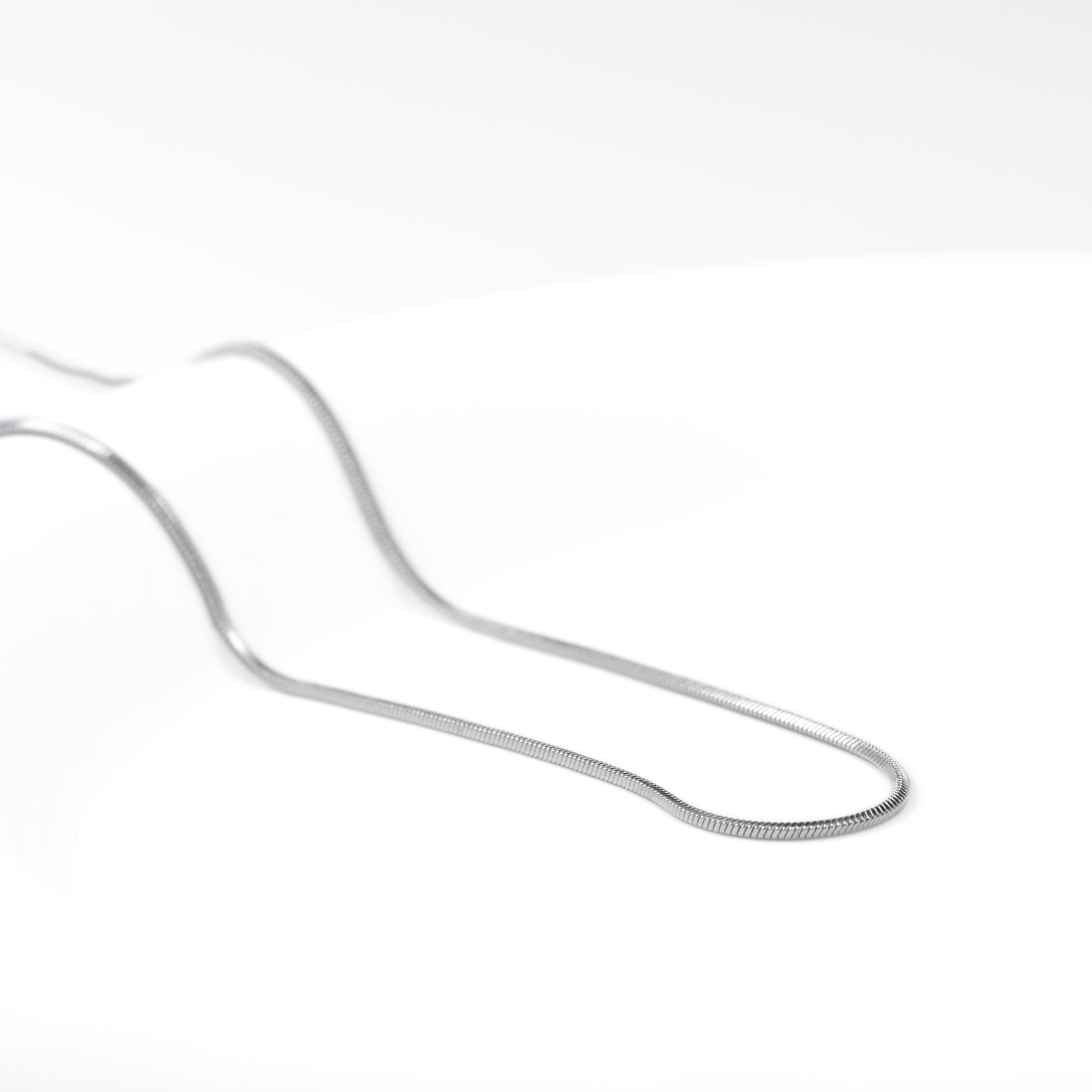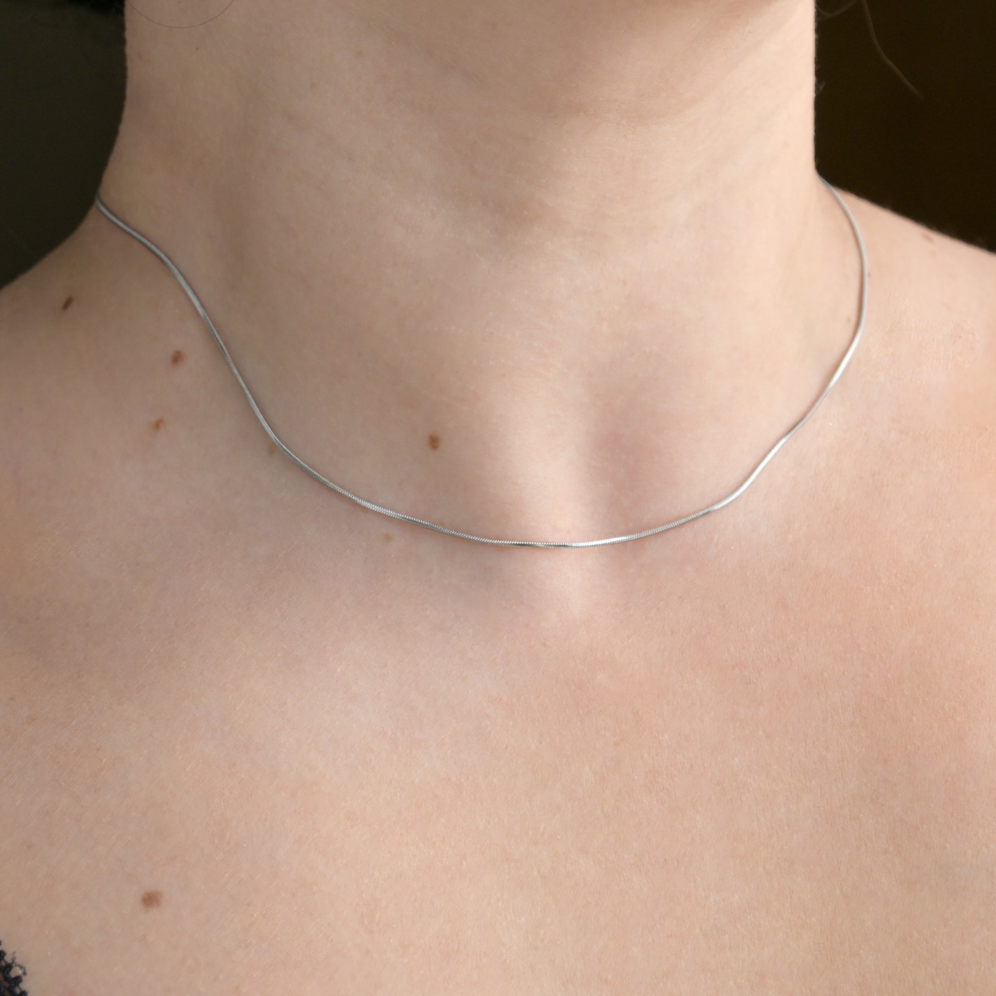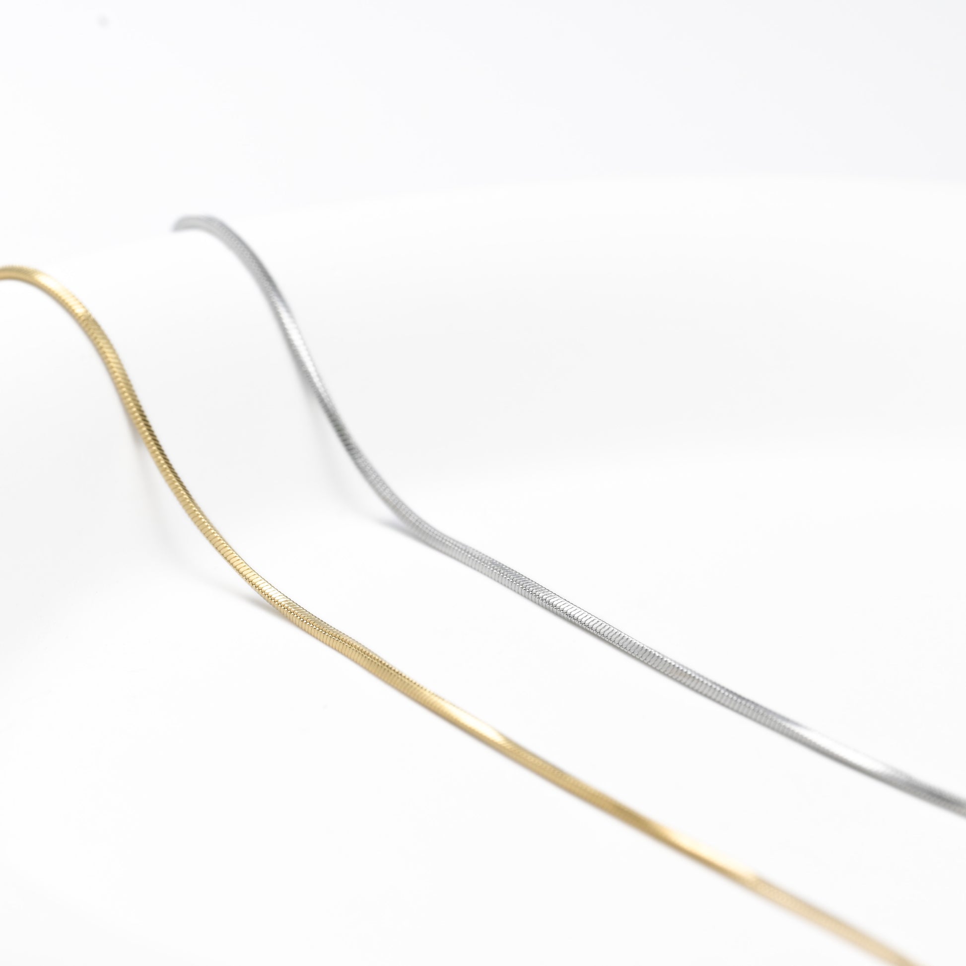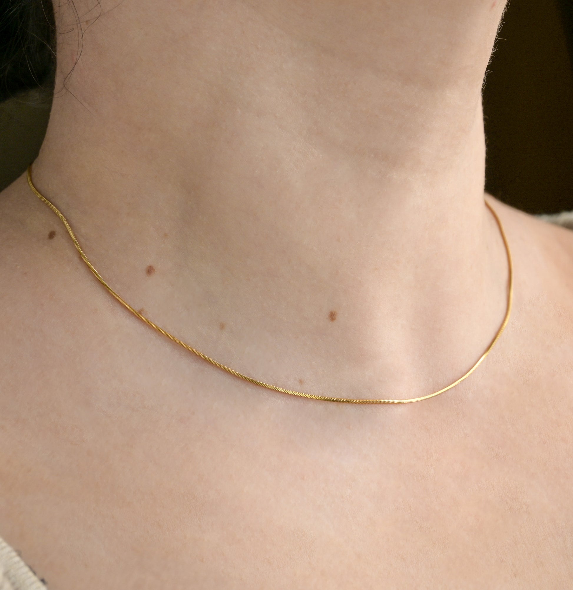 Elevate your style with our Slim Snake Chain Necklace, a unique blend of elegance and sparkle. Twisted accents scattered along the chain create an unusual, captivating allure. Crafted from stainless steel, available in 18k gold PVD plated and silver finish.