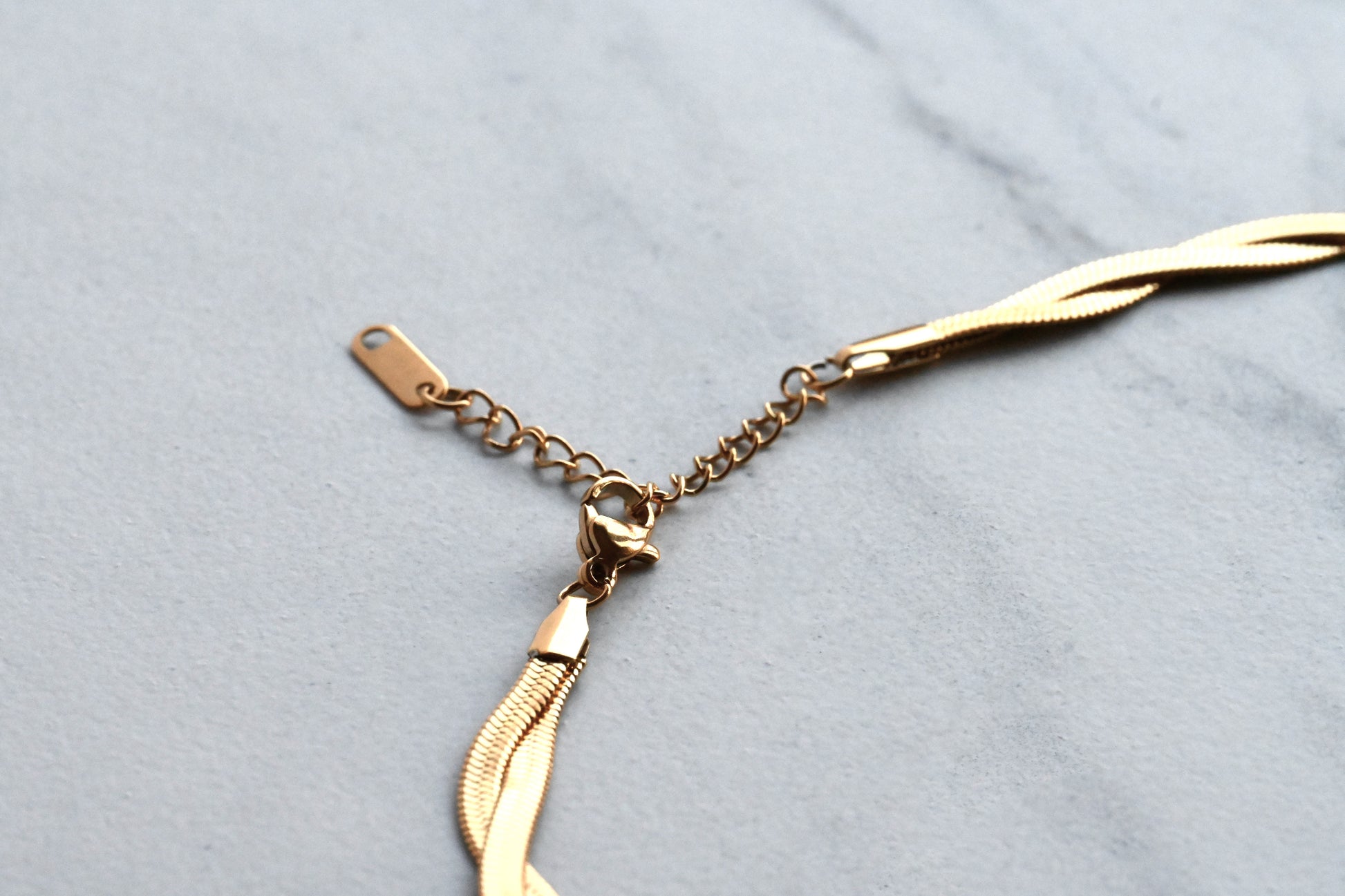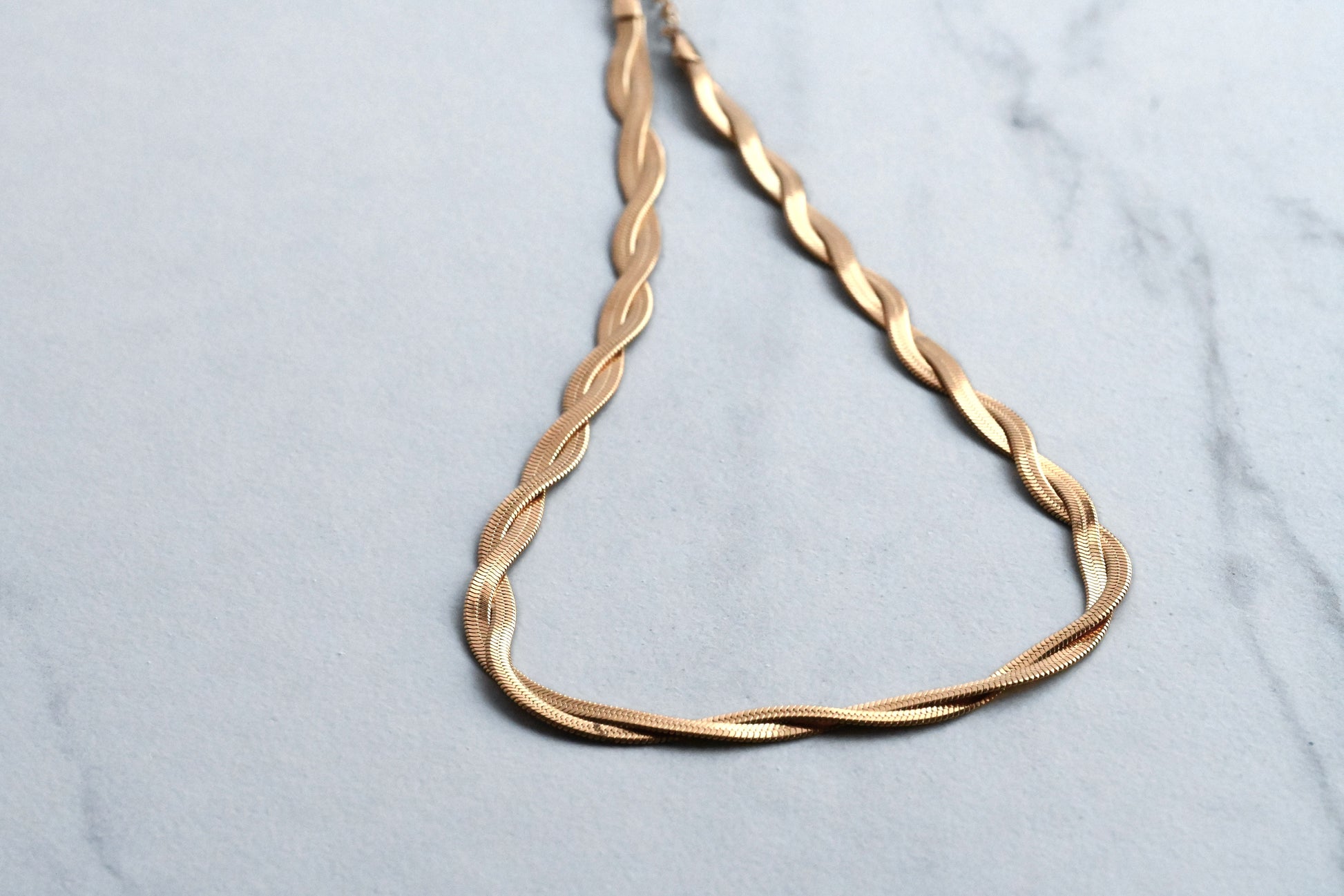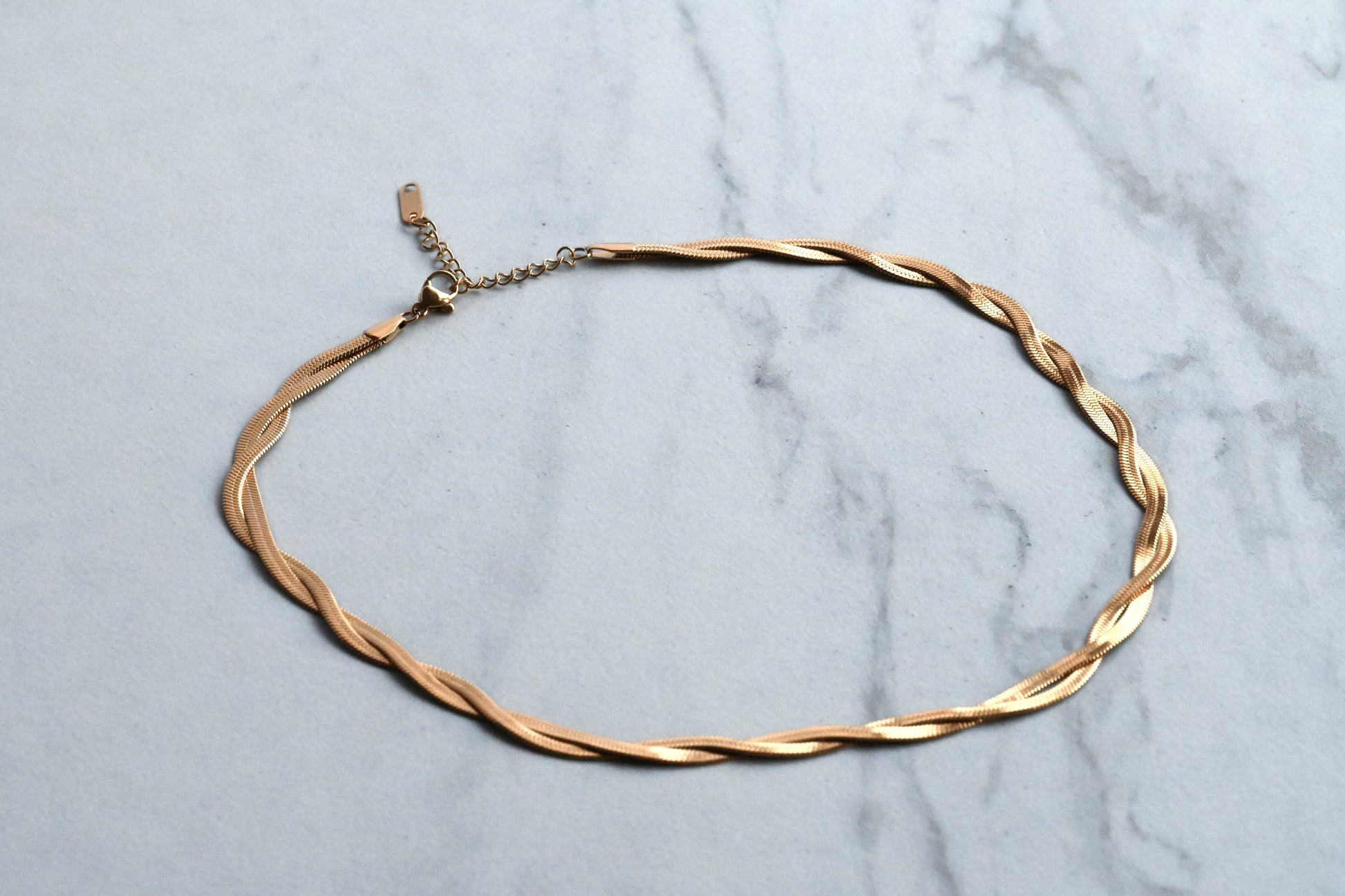 A timeless and sophisticated chain style, this braided herringbone chain choker necklace is in style this season and the perfect piece to add to your collection. It catches light perfectly and has a sleek modern look. This design will complete your look on its own or when layered with other chain necklaces.