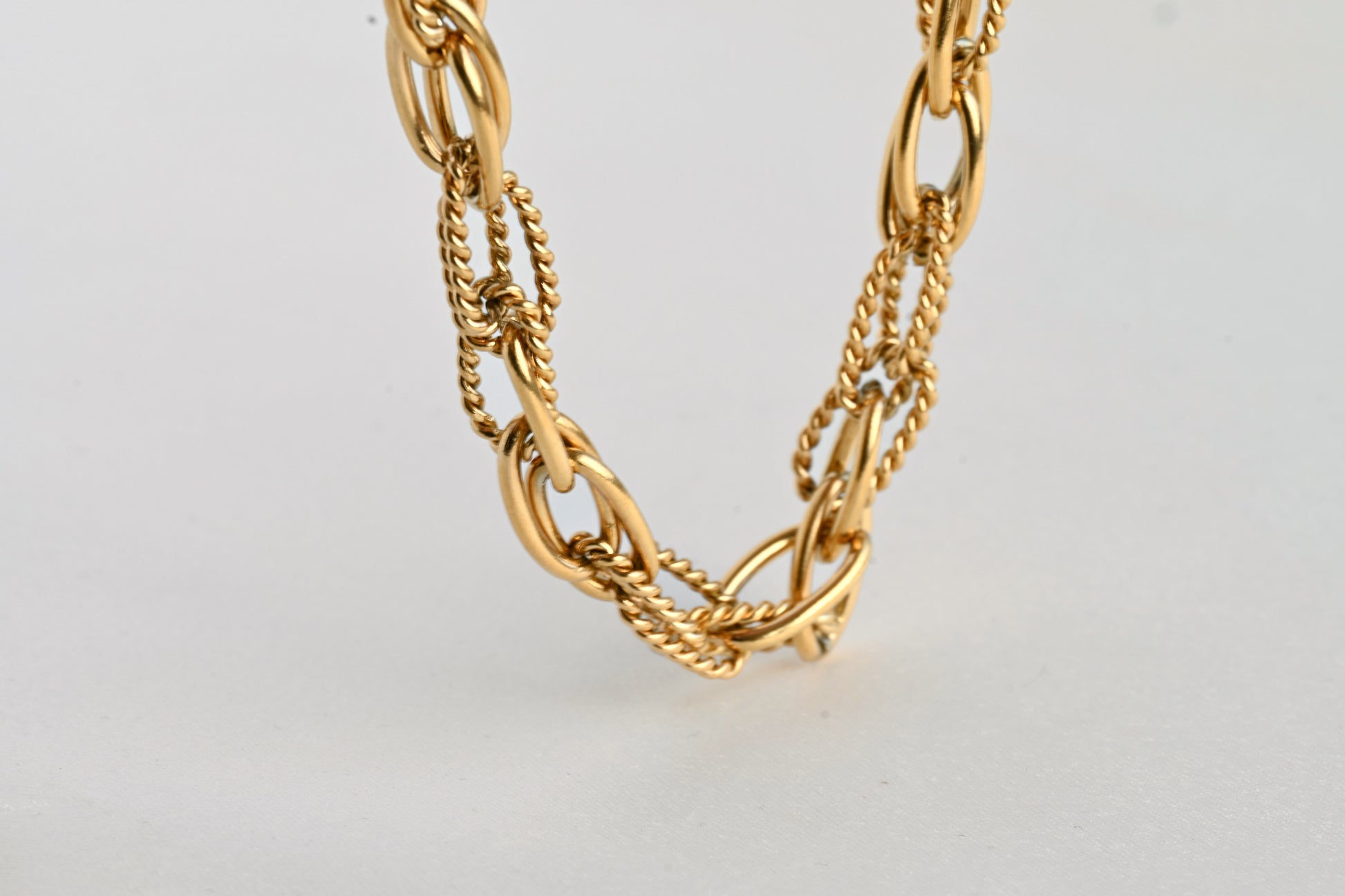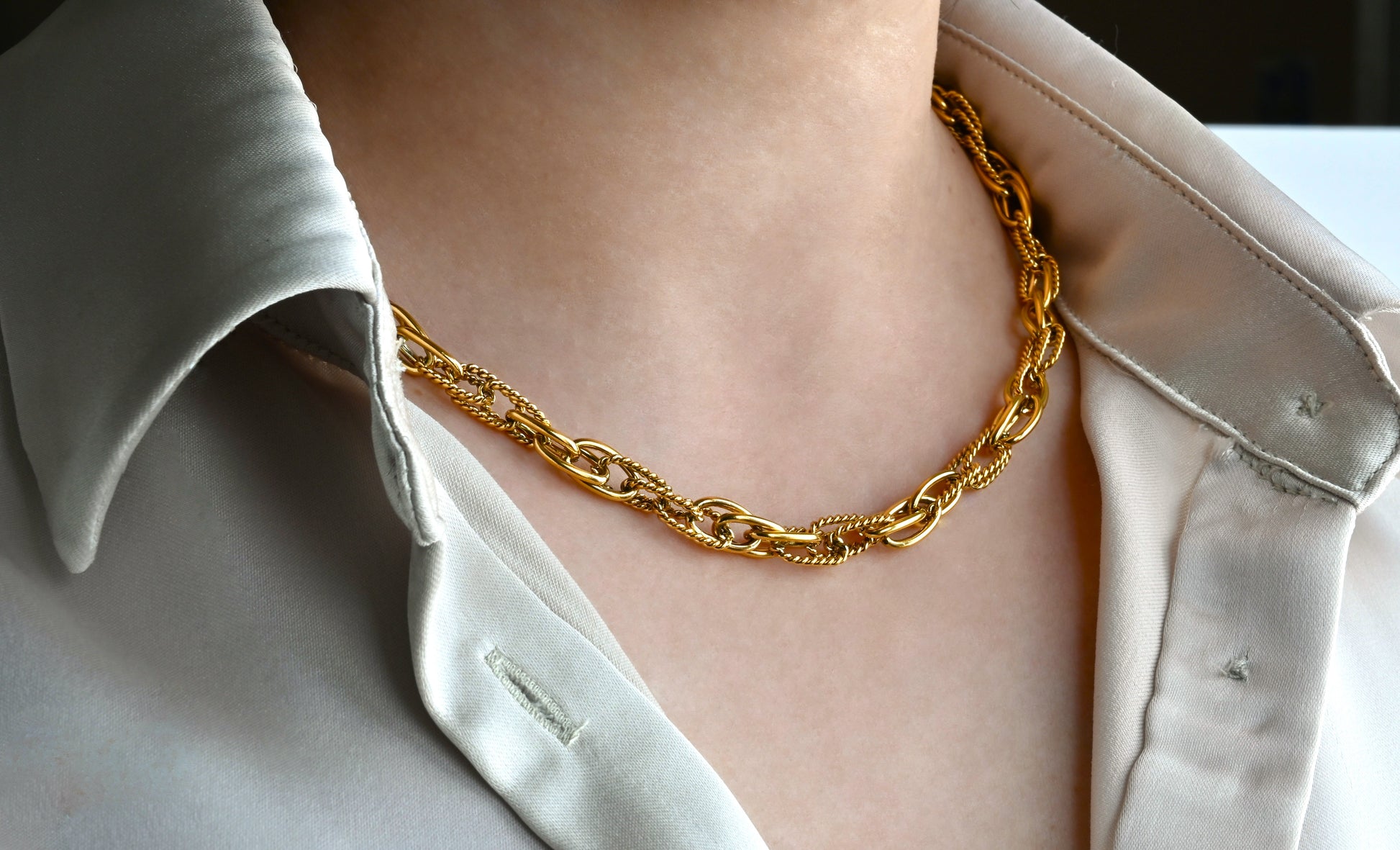 Sophisticated and elegant, this dual chain choker necklace is crafted in 18k gold PVD plated stainless steel. The design features oval twisted and plain links. Available as a bracelet too! Add a touch of personalization with your choice of letter charms.