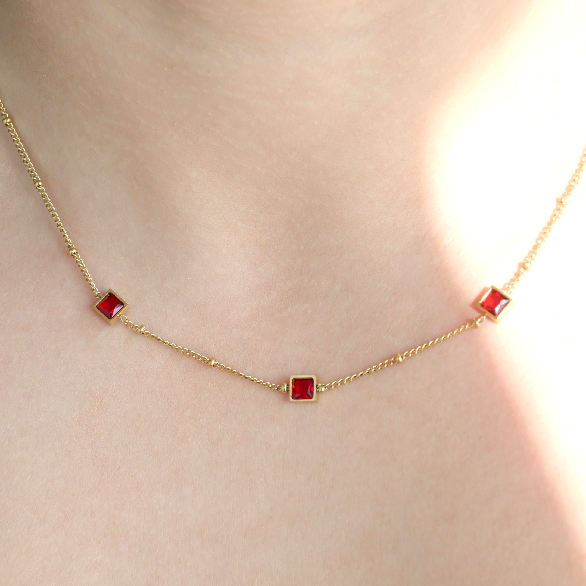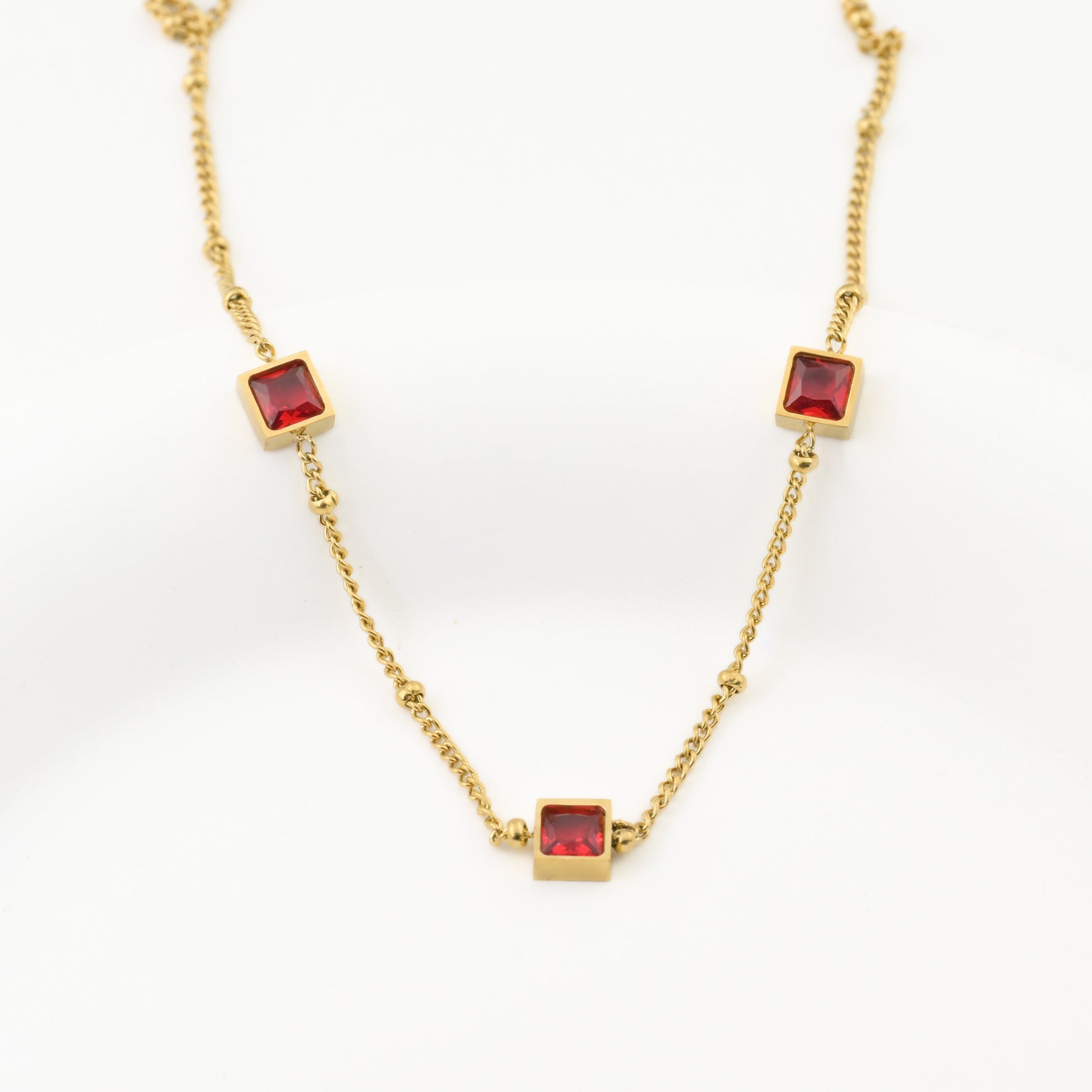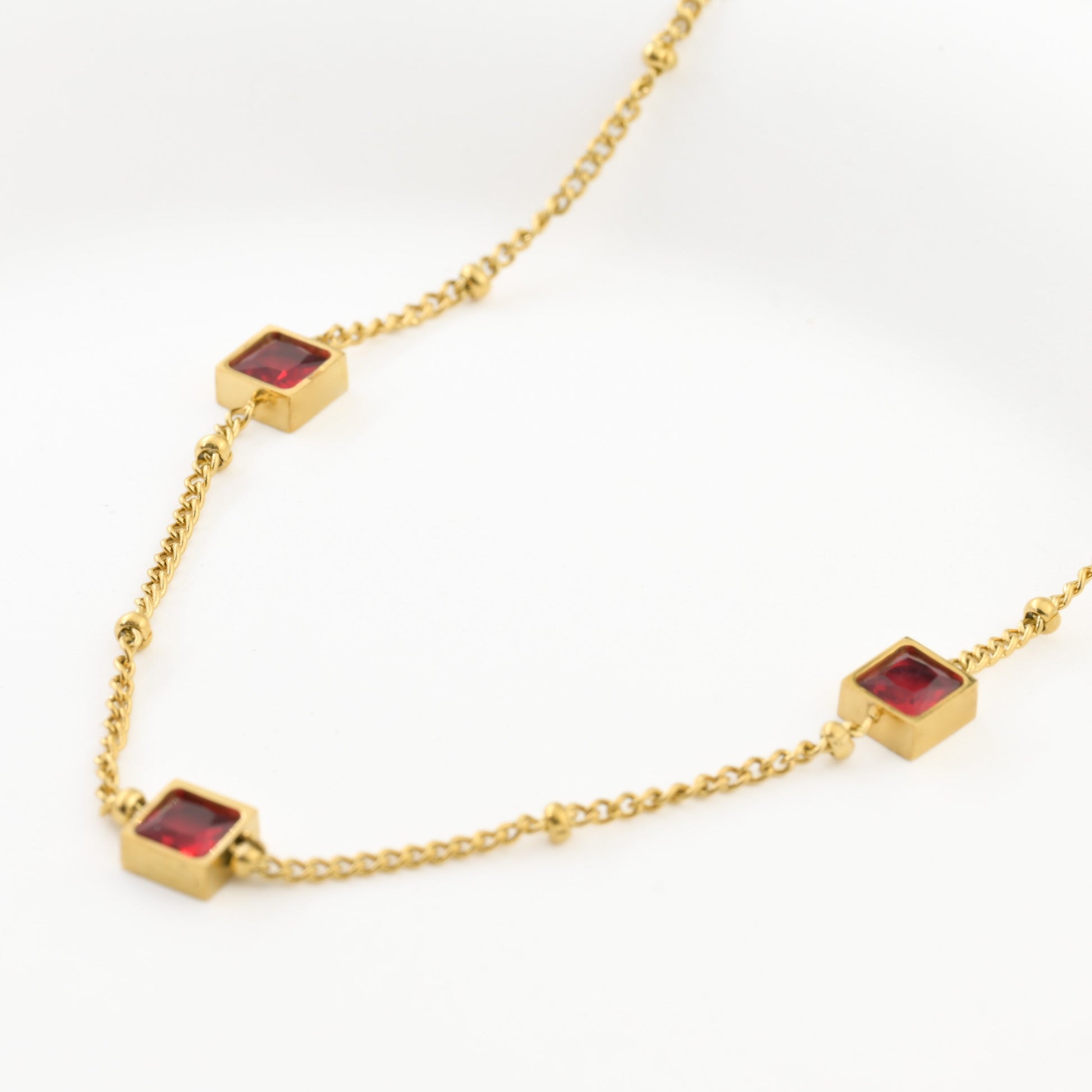 This stainless steel diamond trio necklace boasts a sleek design with a delicate satellite curb chain and three striking 5mm square cubic zirconia stones in a rich garnet hue.
