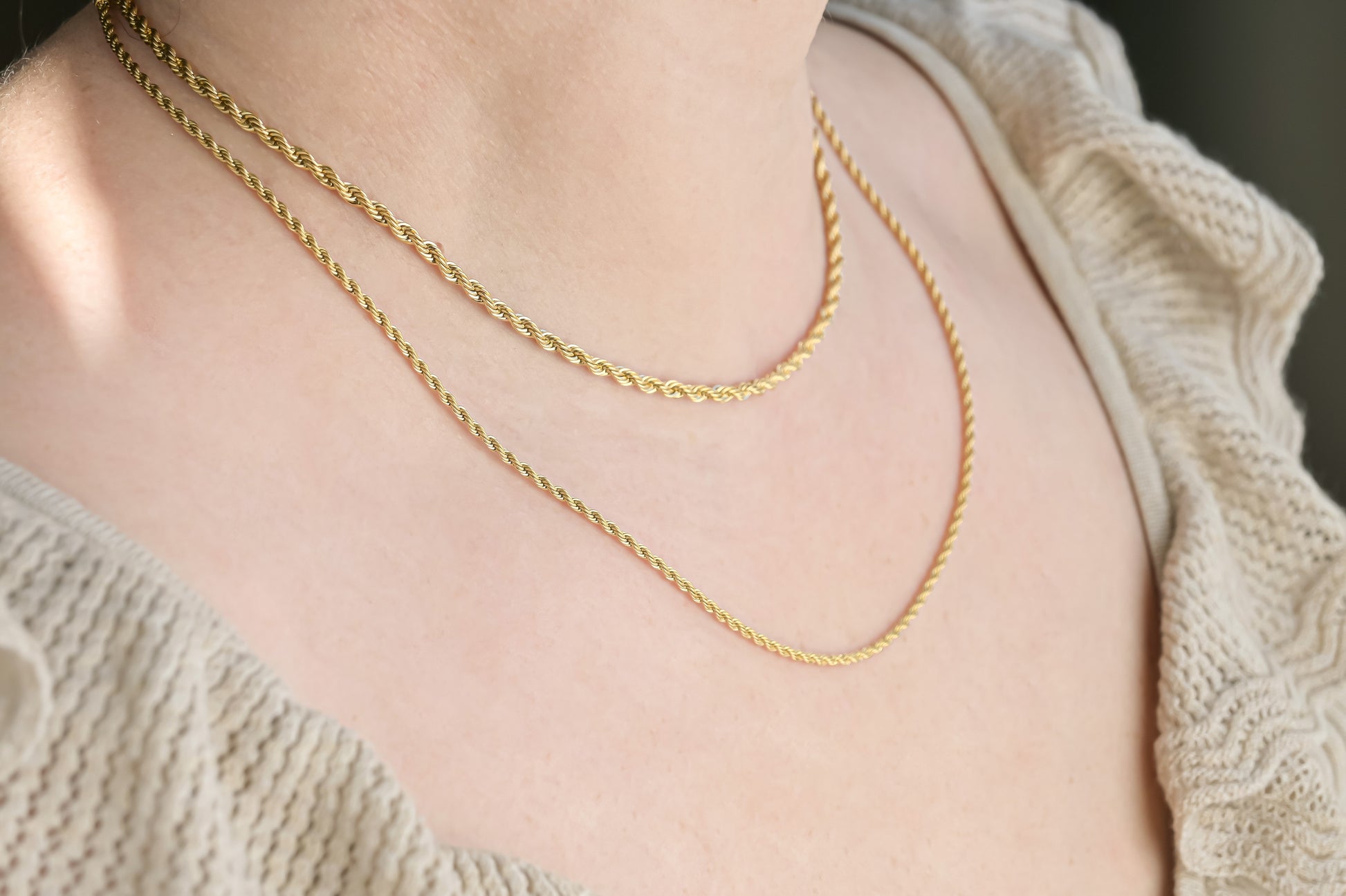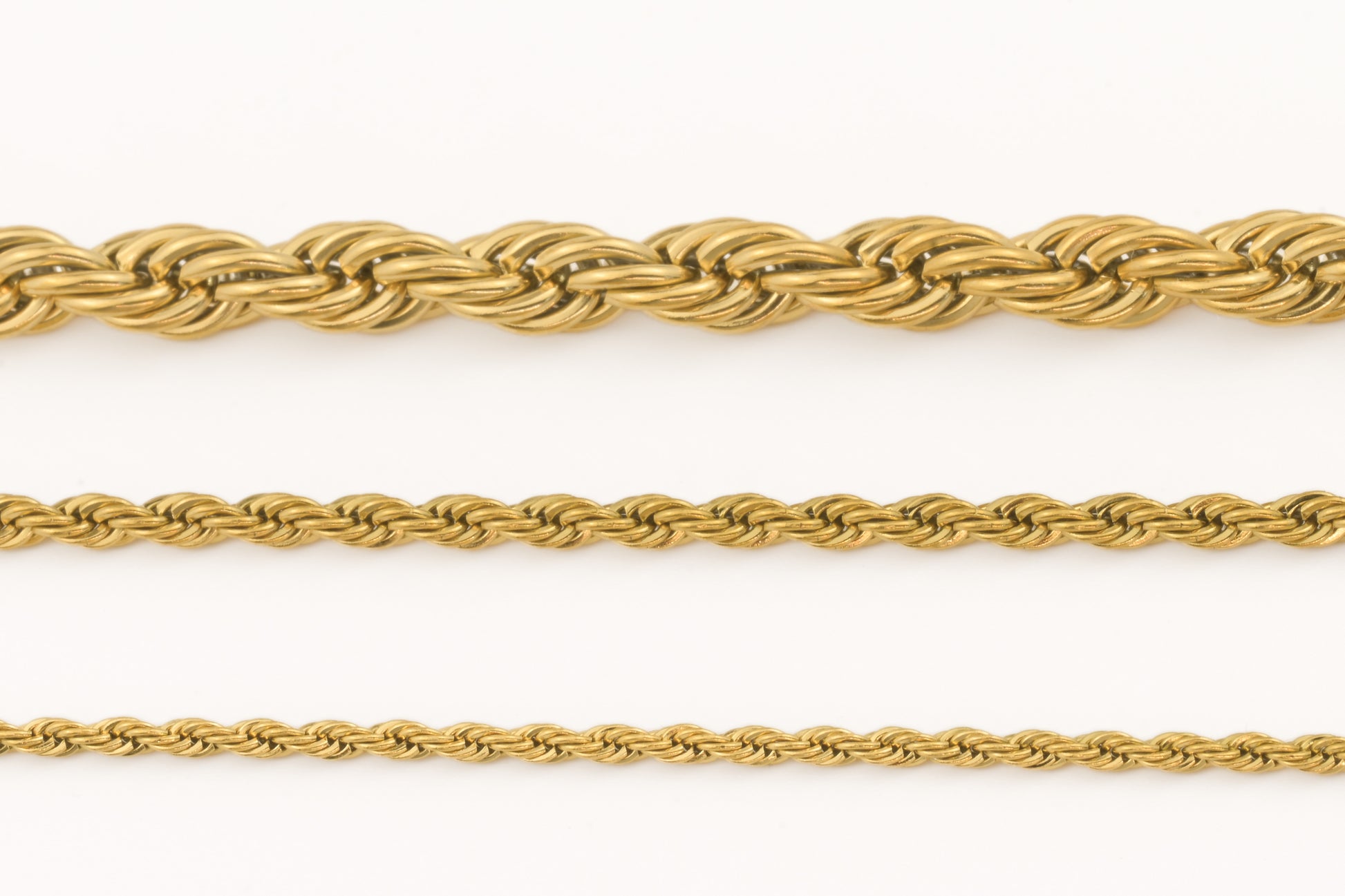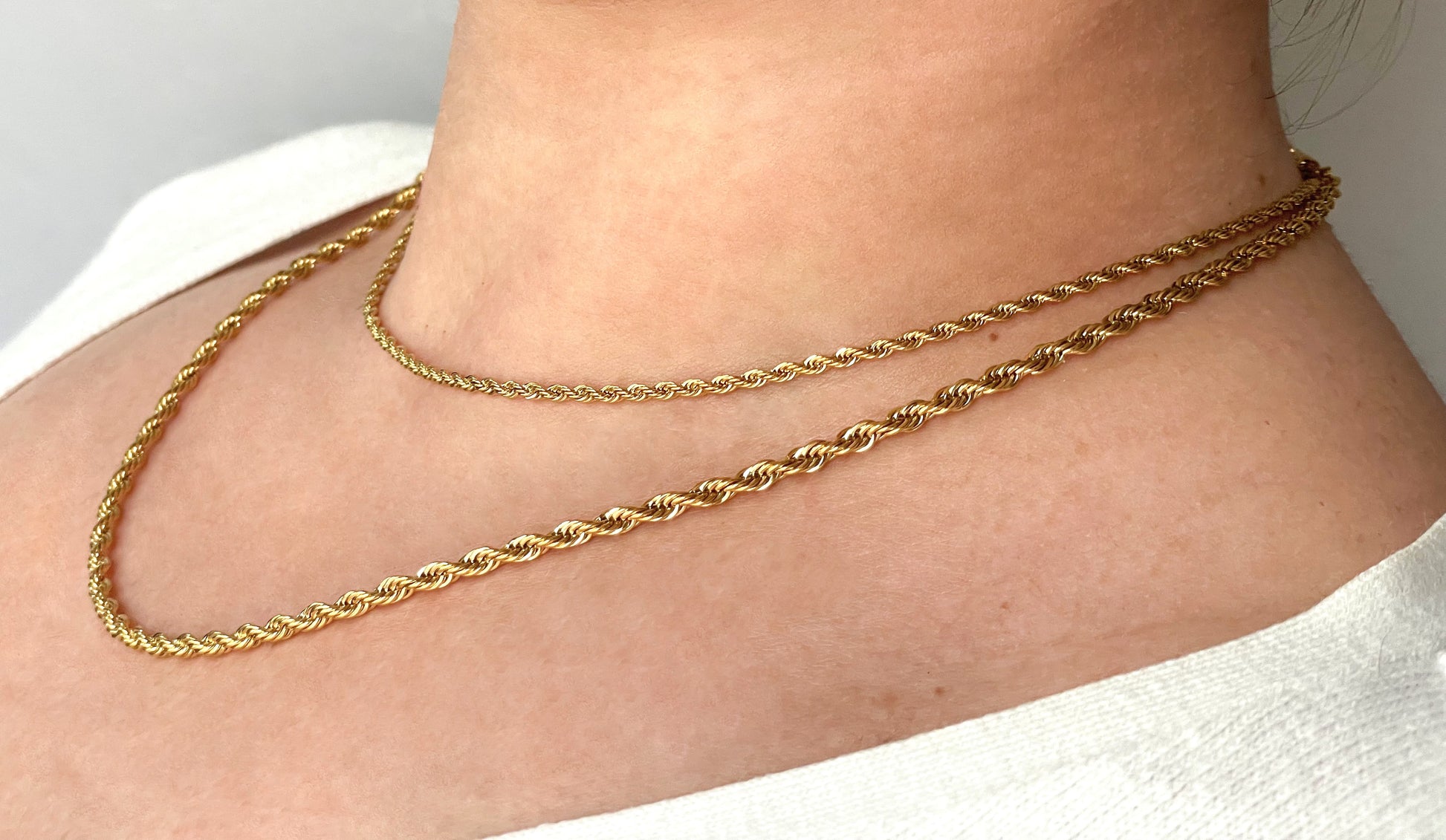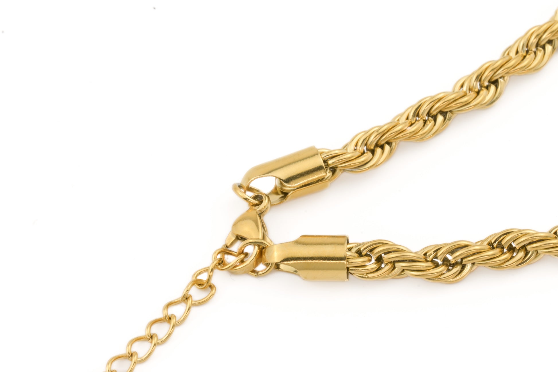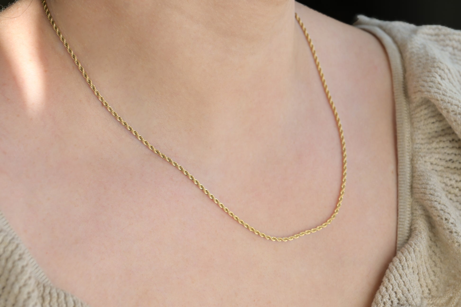 A stylish twisting rope chain design available in gold and silver. This design measures 2 or 3 mm in width and 16 inch or 18 inch in length to choose from. Crafted in stainless steel, this twisted chain necklace is made to last!