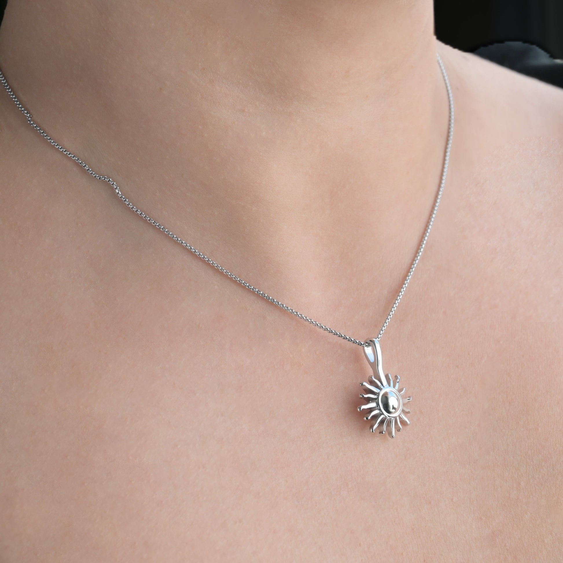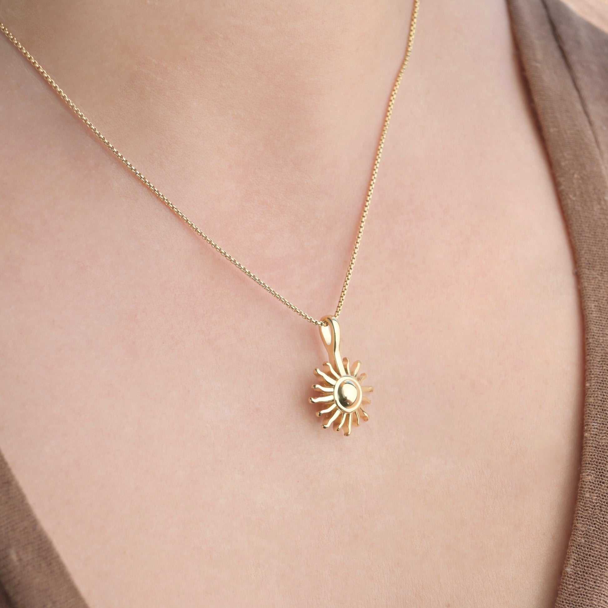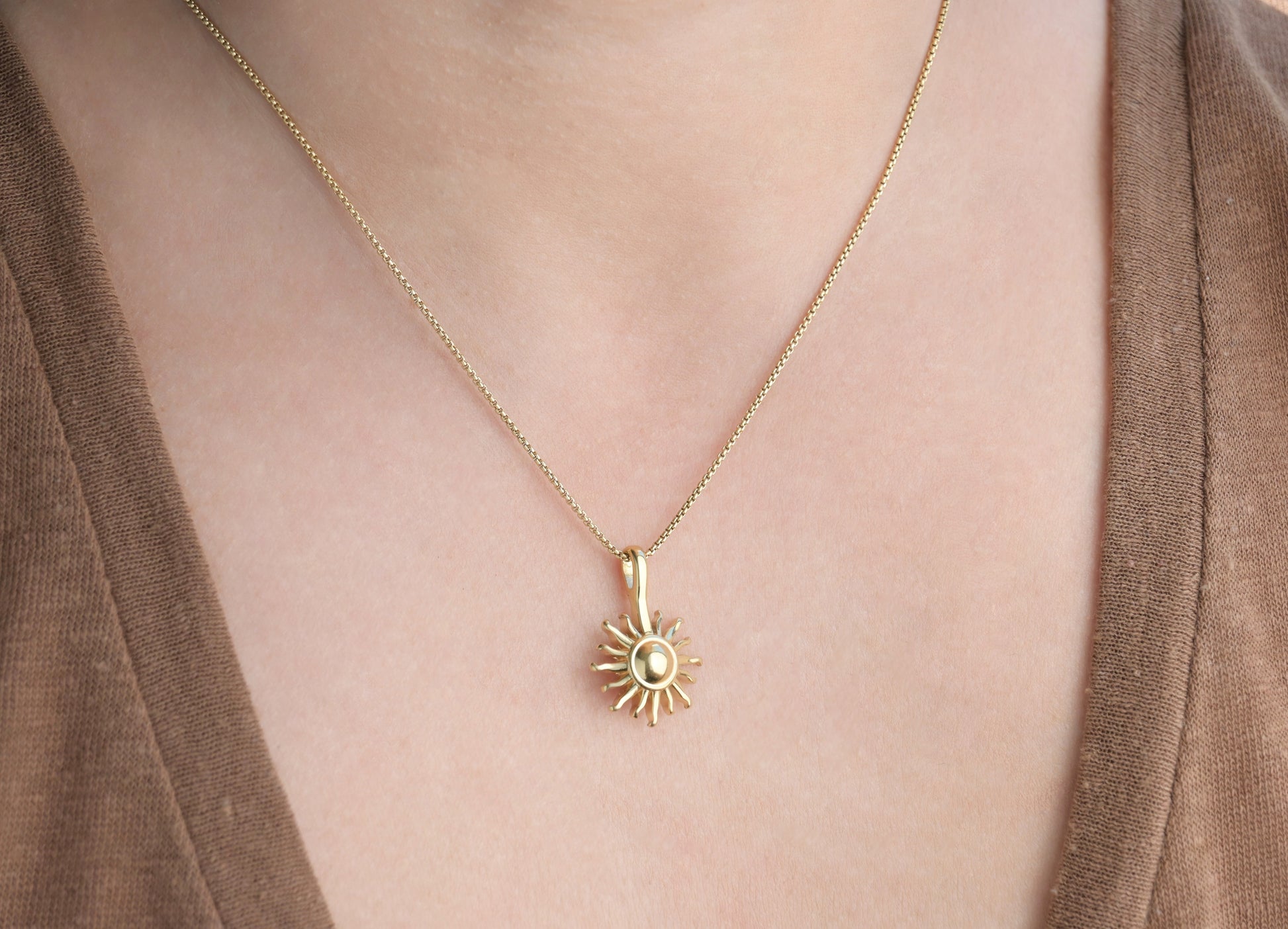 This vintage style sun necklace is crafted in 18k PVD plated stainless steel and feature a sun pendant measuring 20x26mm along a 16.5-inch rounded box chain with an extra 2-inch extender . Available in gold and silver, this necklace is tarnish-resistant and waterproof; you can wear them to the pool or gym and they won't change color or turn your skin green.