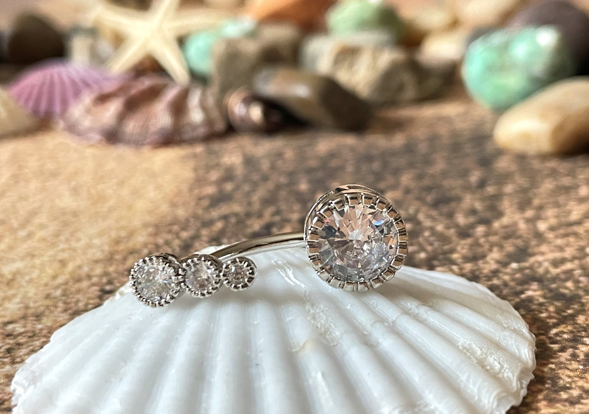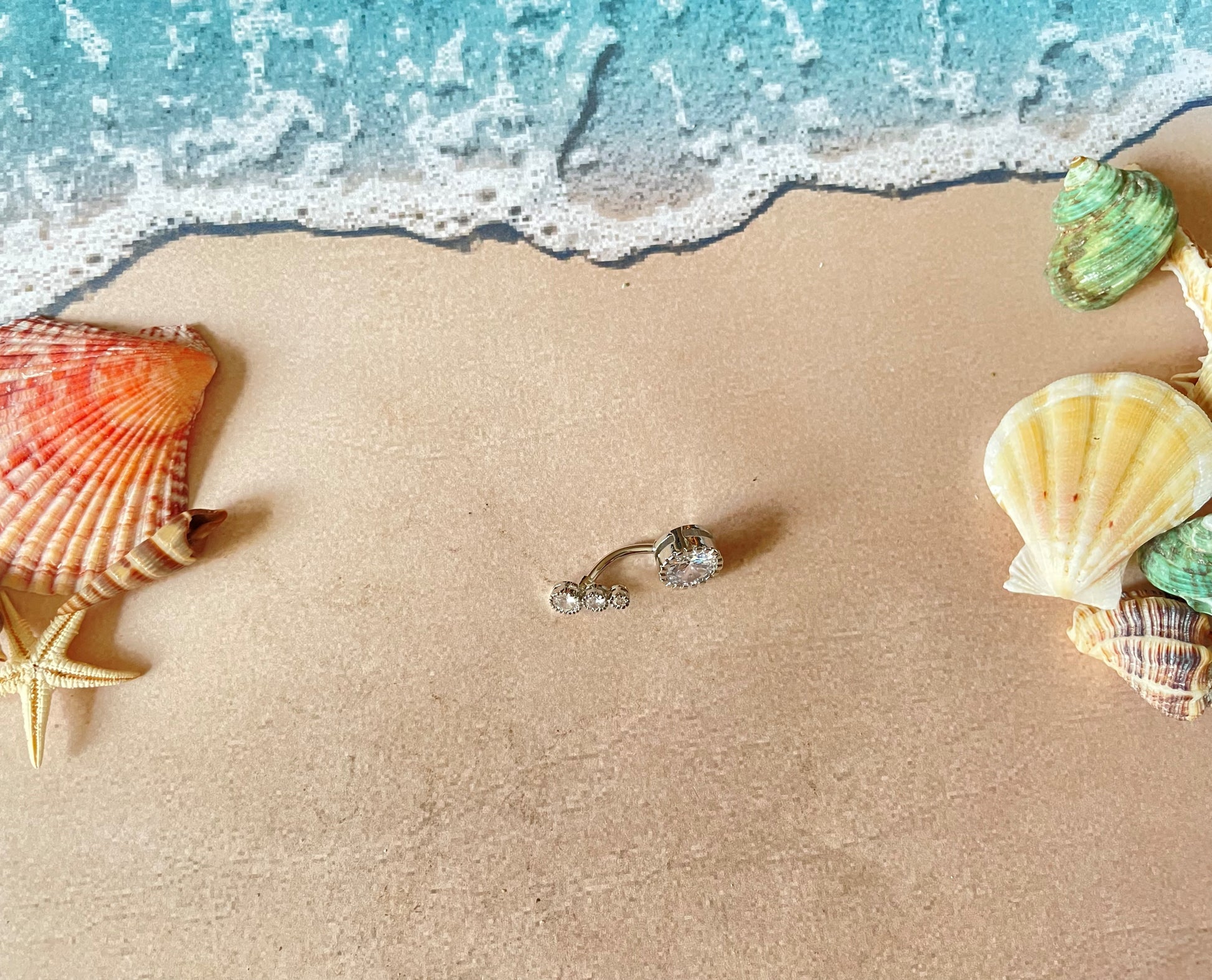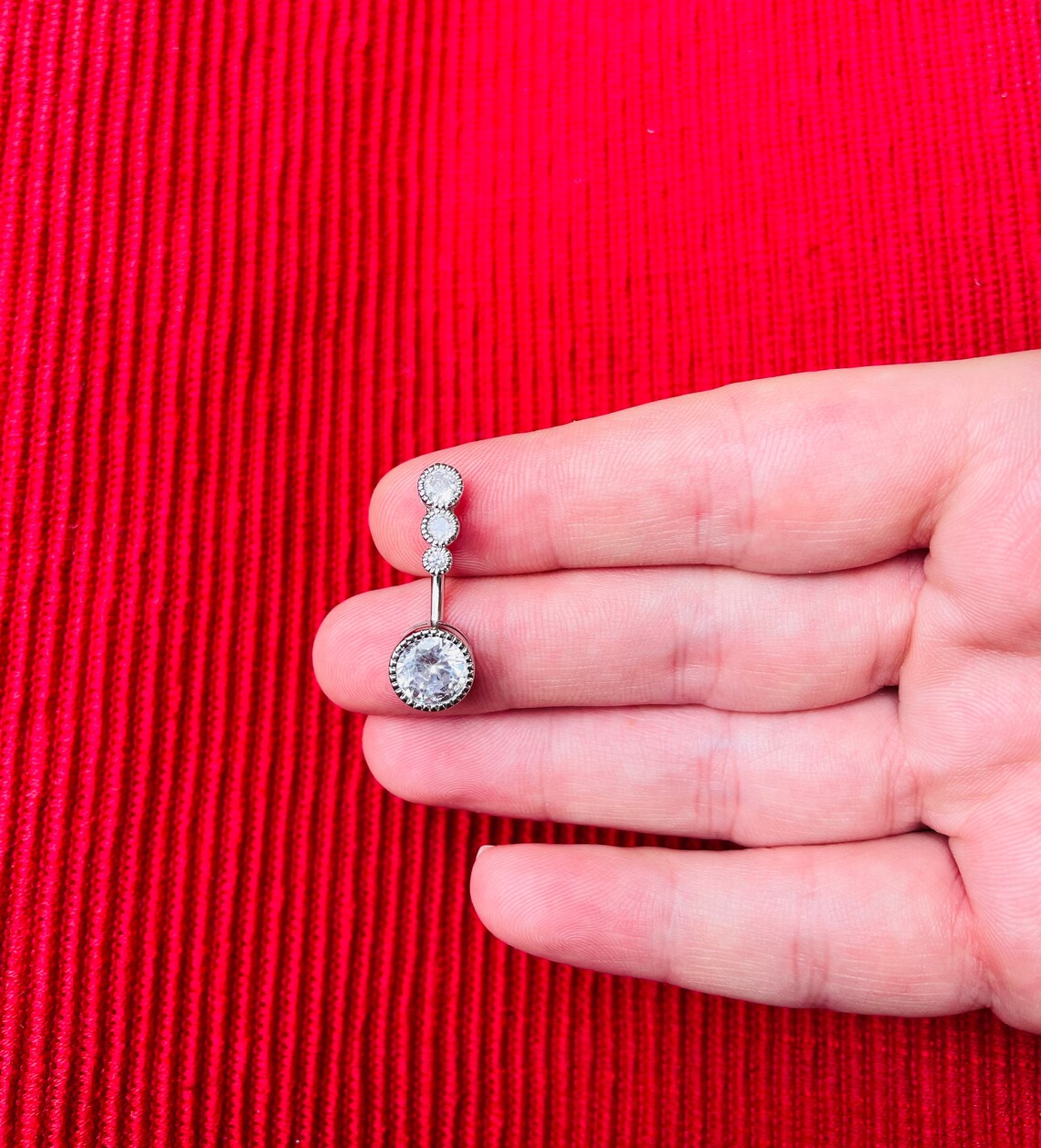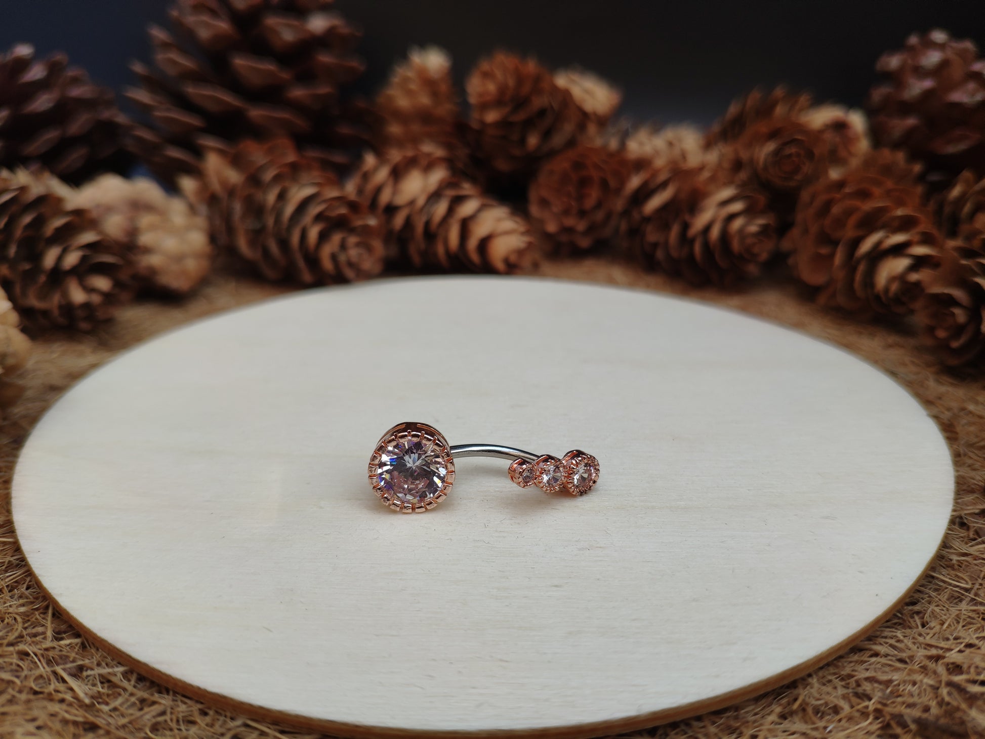 This stunning naval piece features three round crystals of sizes 5 mm, 4 mm and 3 mm and a big 9 mm crystal at the bottom that deliver sparkles. The 16g barbell has a length of 11 mm. Available in rose, silver and gold.