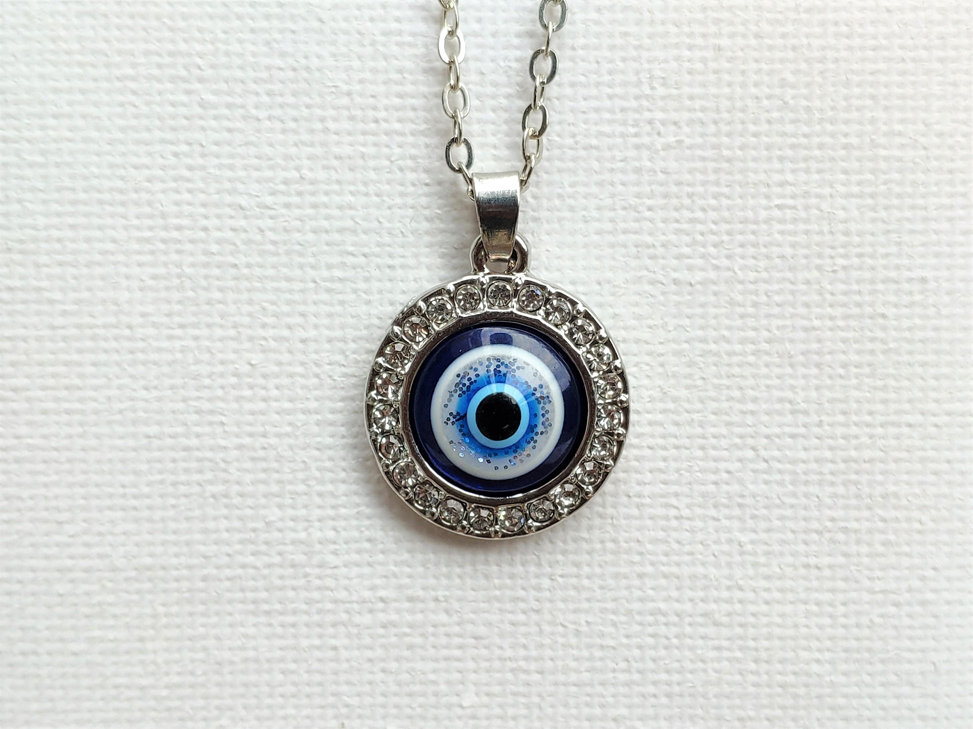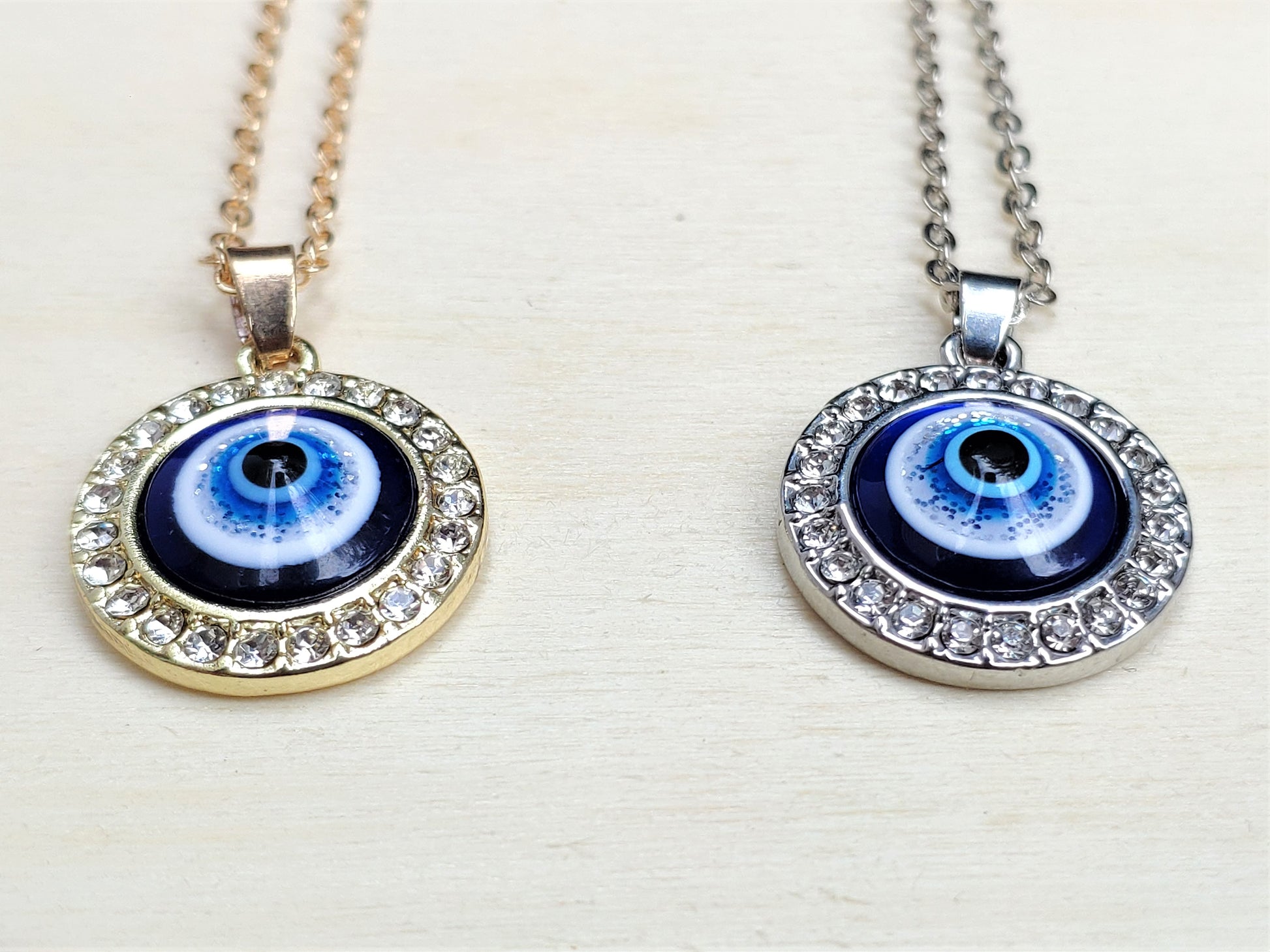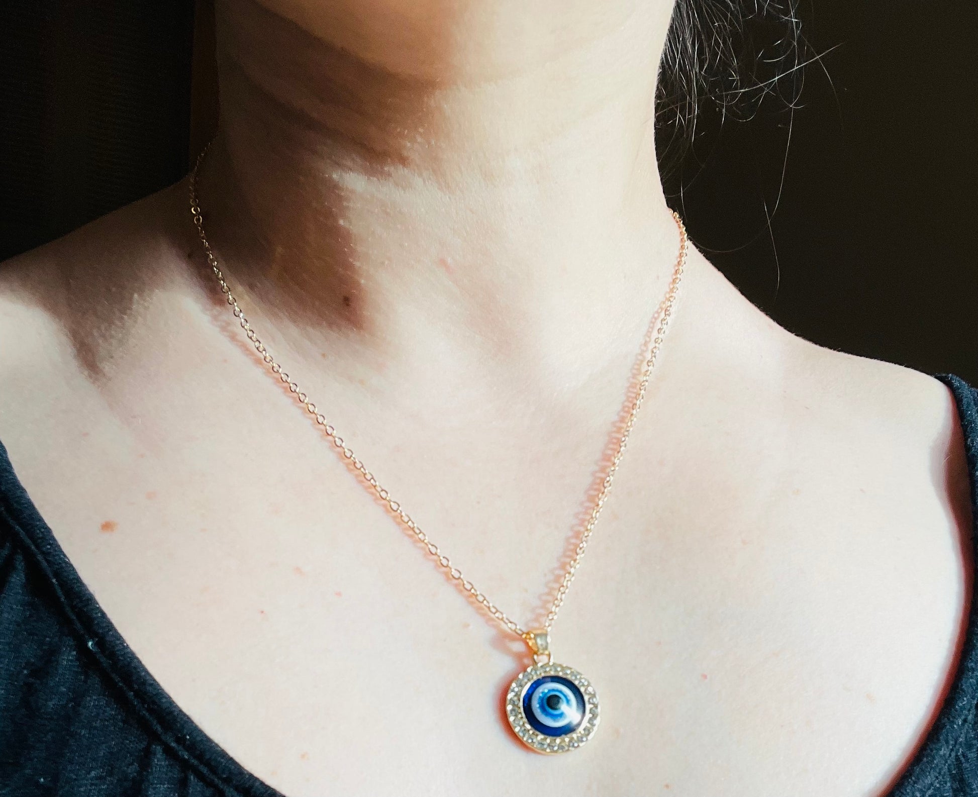 Feel safe and protected while looking stylish with this stunning evil eye pendant necklace! The design features a medium sized blue eye pendant framed by tiny clear rhinestones. A real bohemian aesthetic!