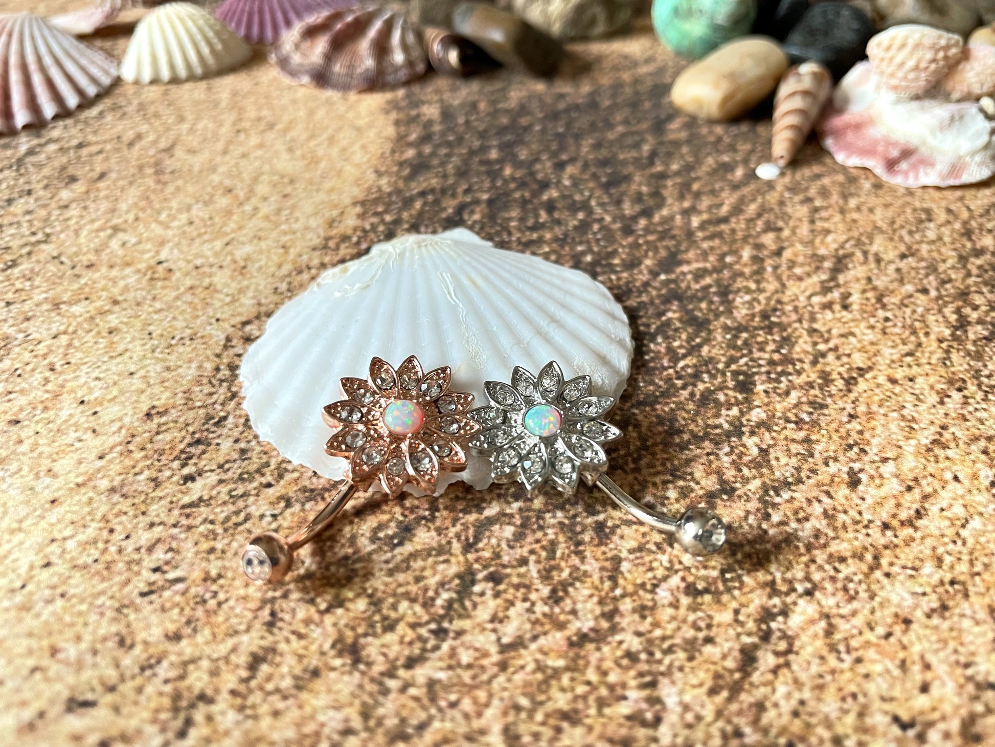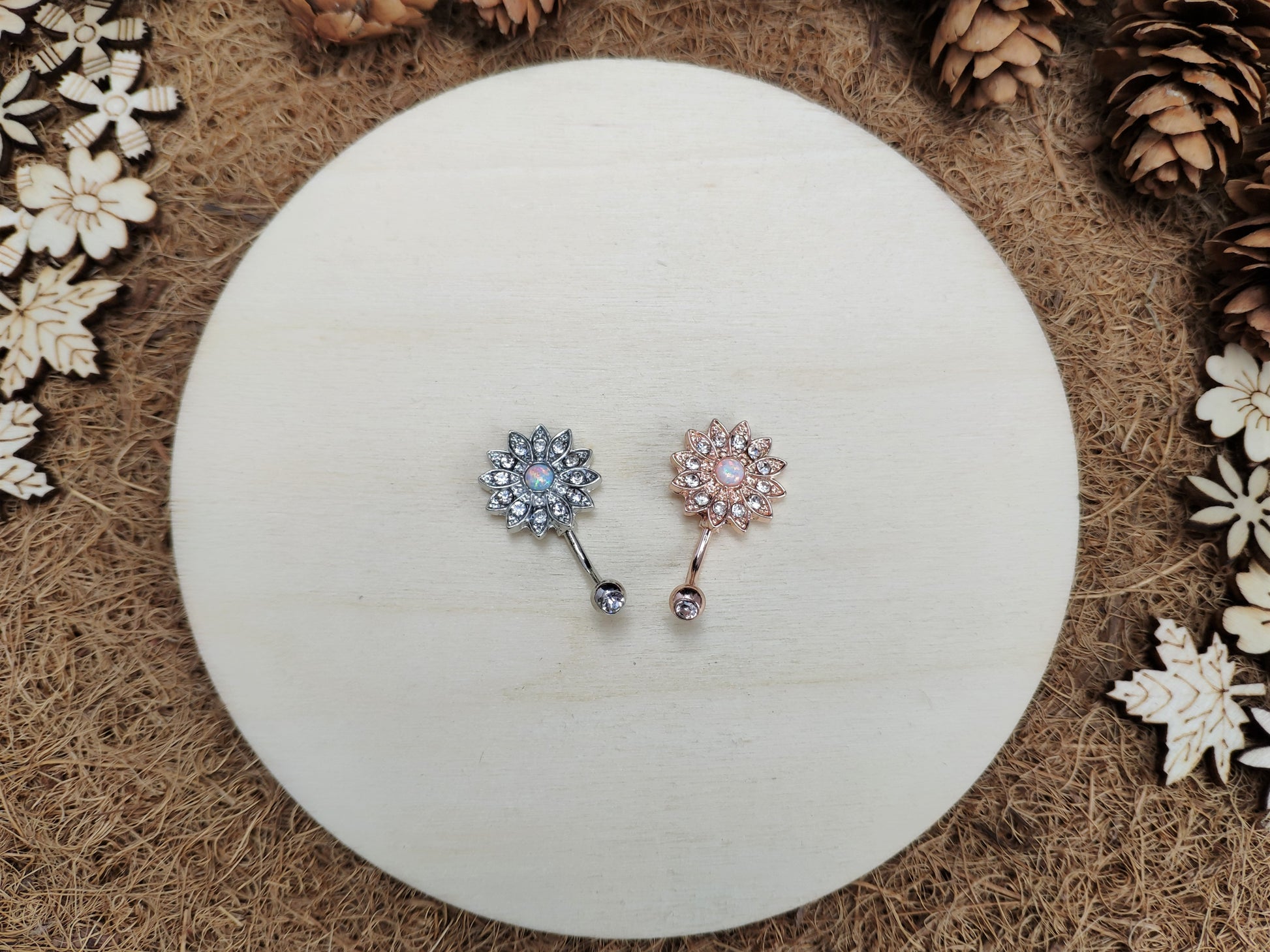 This stunning belly button ring features a 17 mm sunflower adorned with crystals and an opal stone in the center. The barbell is made of surgical steel and hypoallergenic. Available in rose gold and silver.