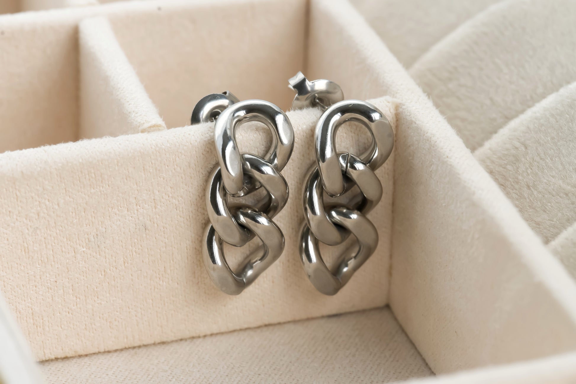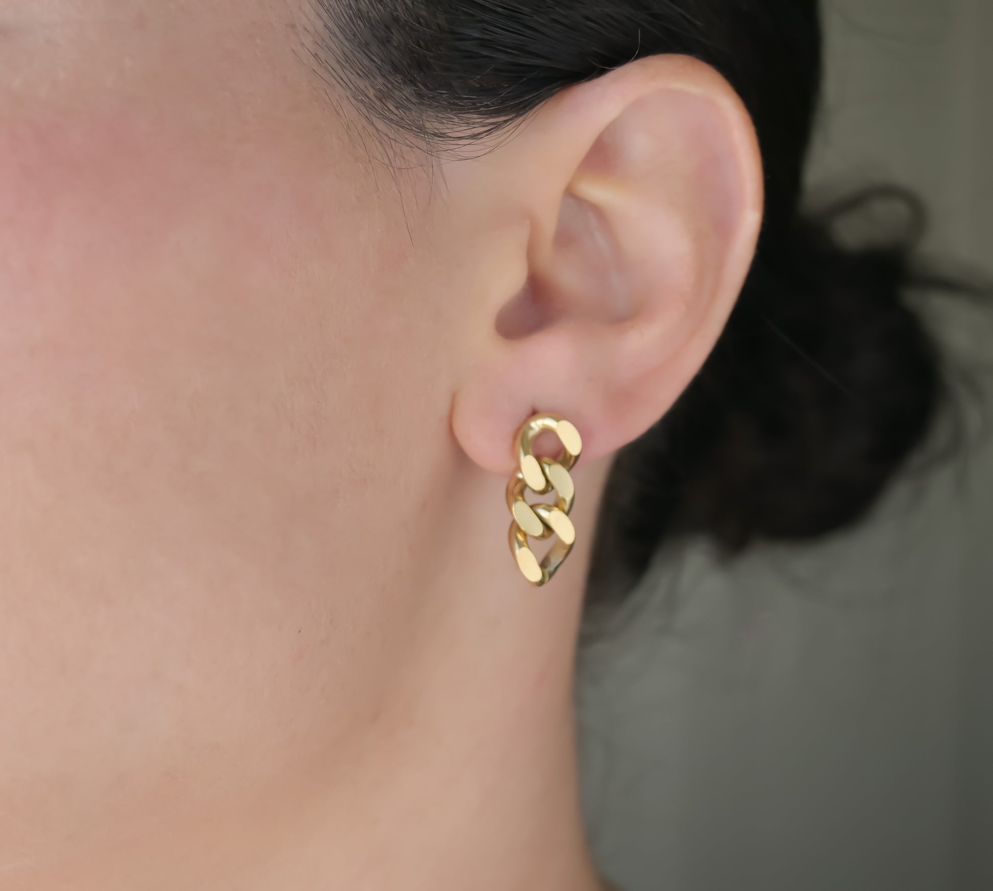 Elevate your style with our stainless steel curb link drop earrings, available in stunning 18k gold and silver finishes. Featuring 3 links per earring, each measures 23mm in height and 8mm in width. A perfect blend of elegance and modern design.