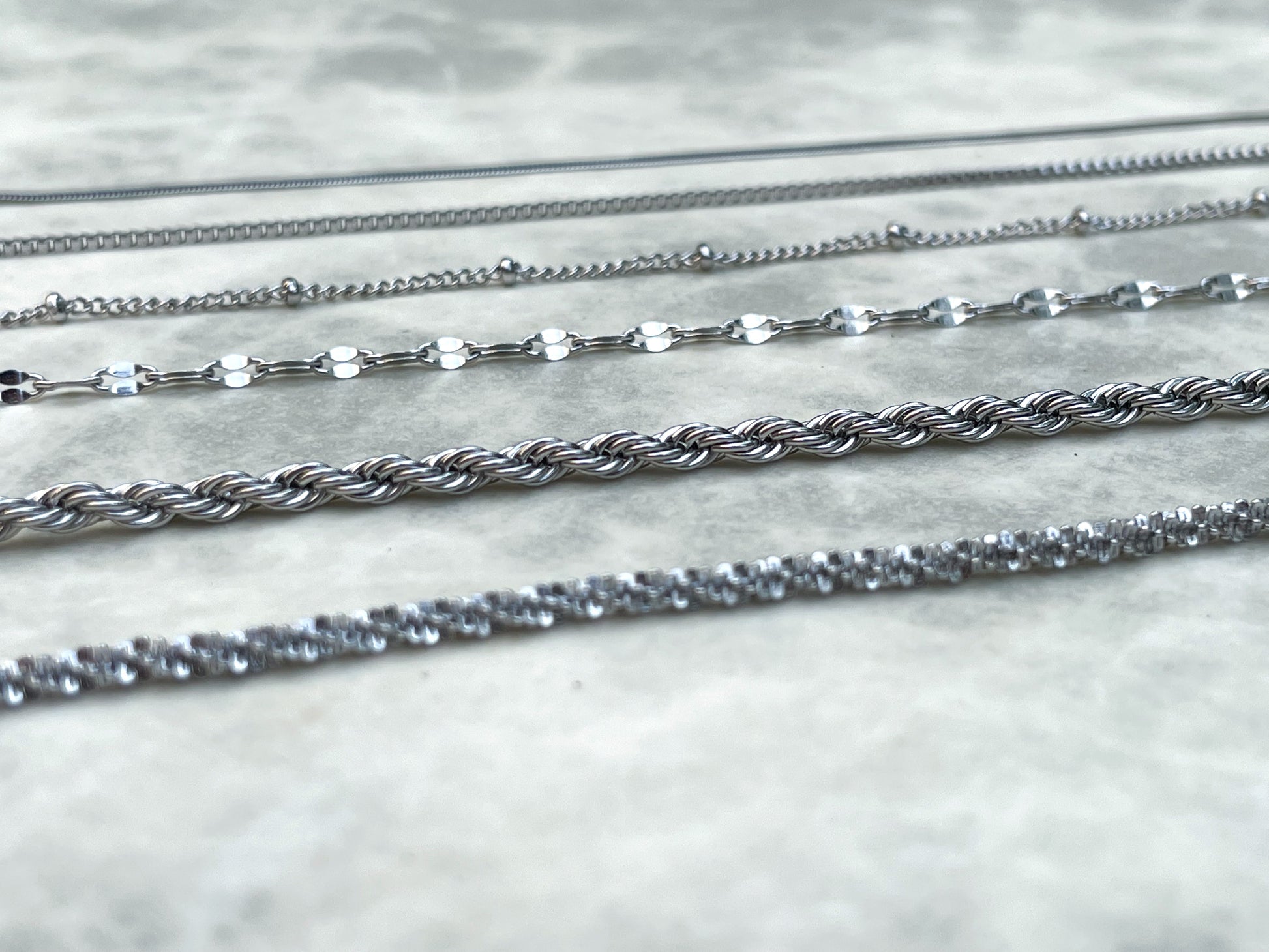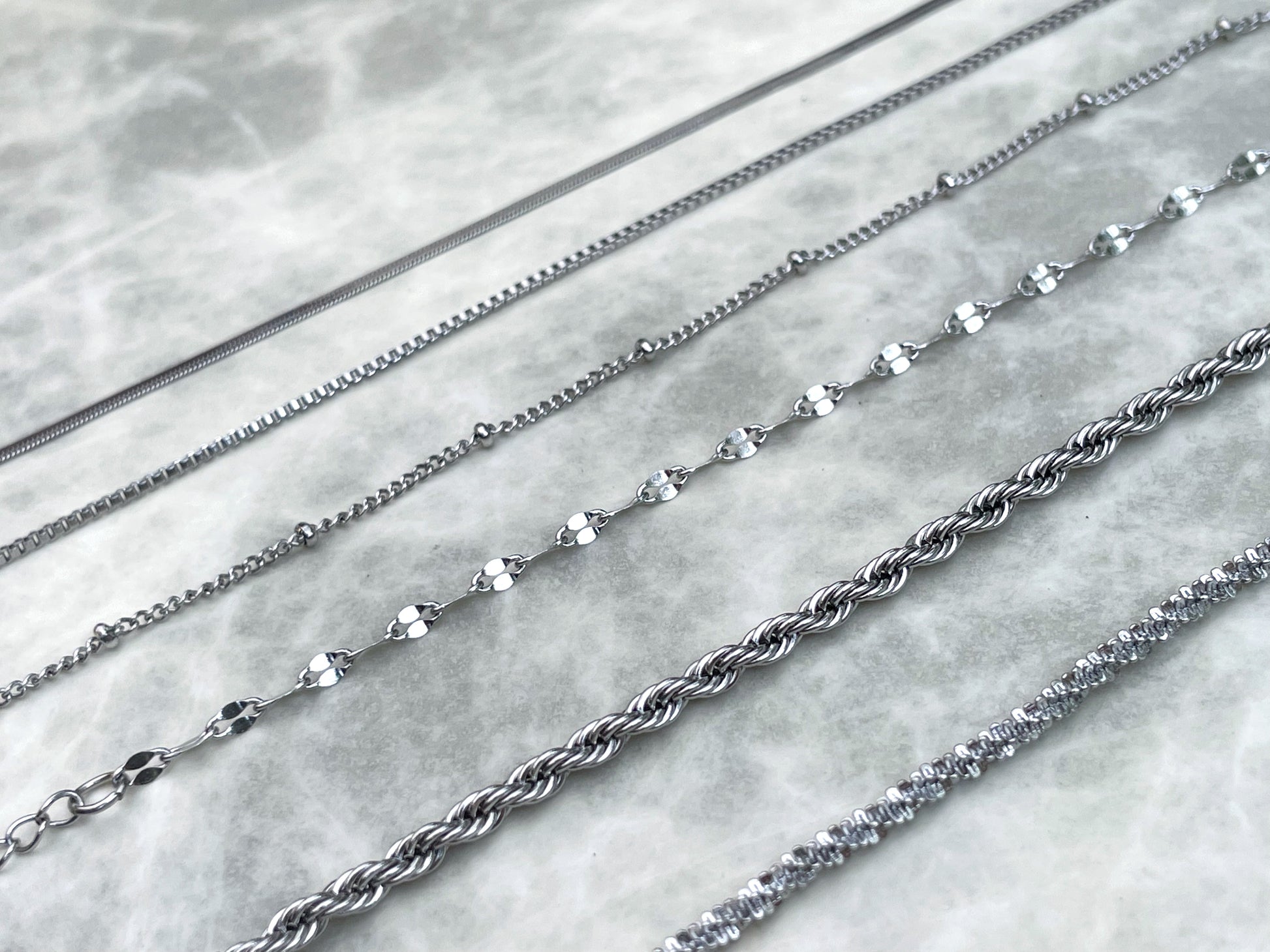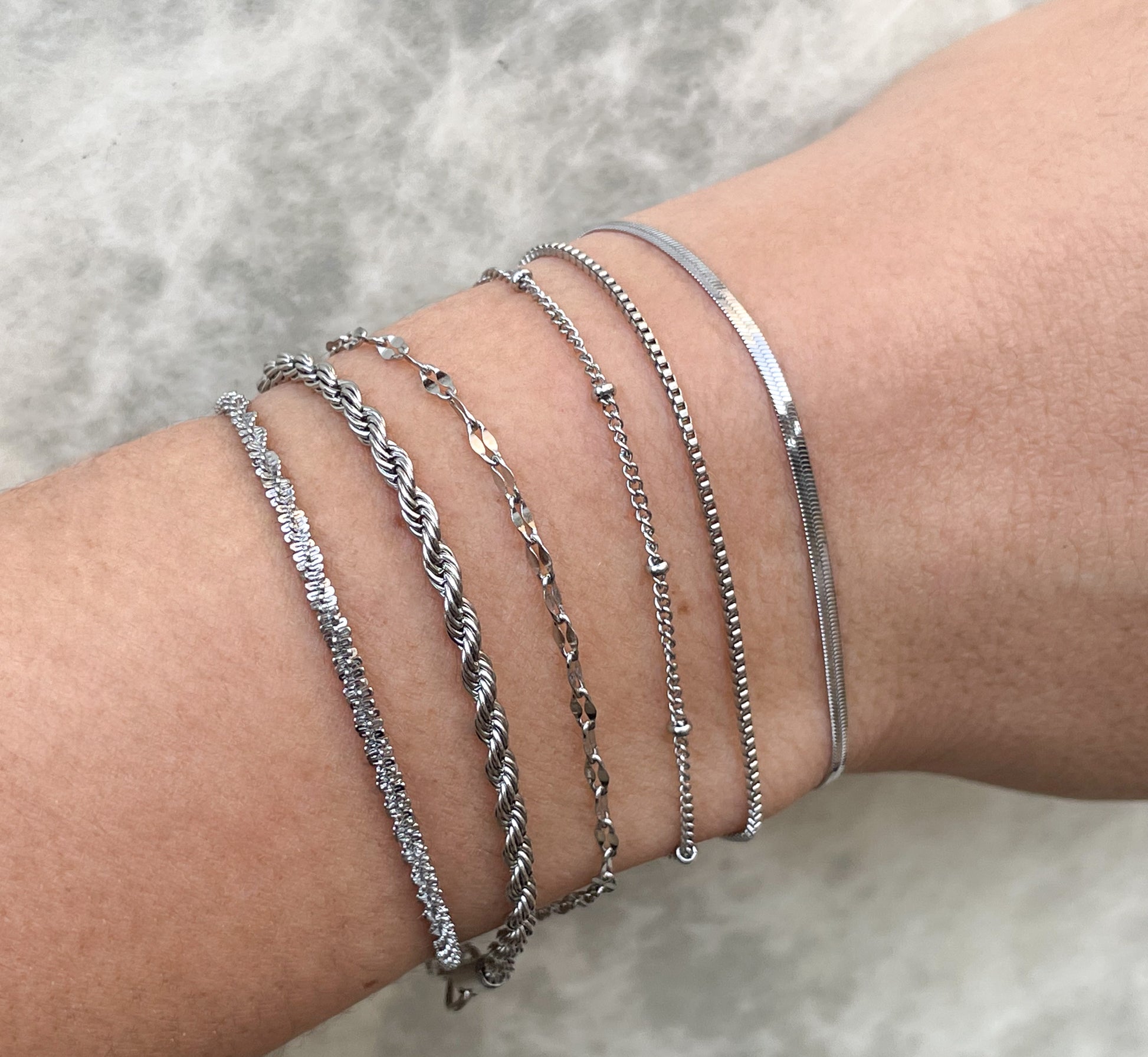 Minimalist and dainty stainless steel bracelets that can be layered / stacked are ideal for mixing and matching! Combine your favorite silver link chains to create a seamless look. Plus, they are tarnish resistant and waterproof; you can wear them to the pool or gym and they won't tarnish. Remember to add an initial charm for a touch of personalization!