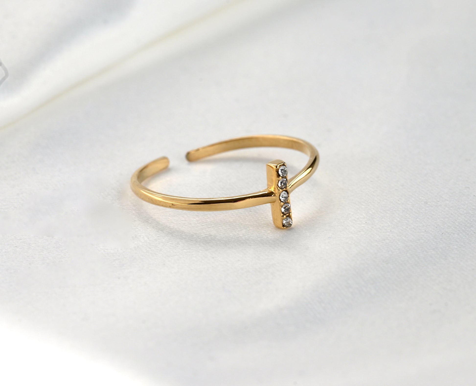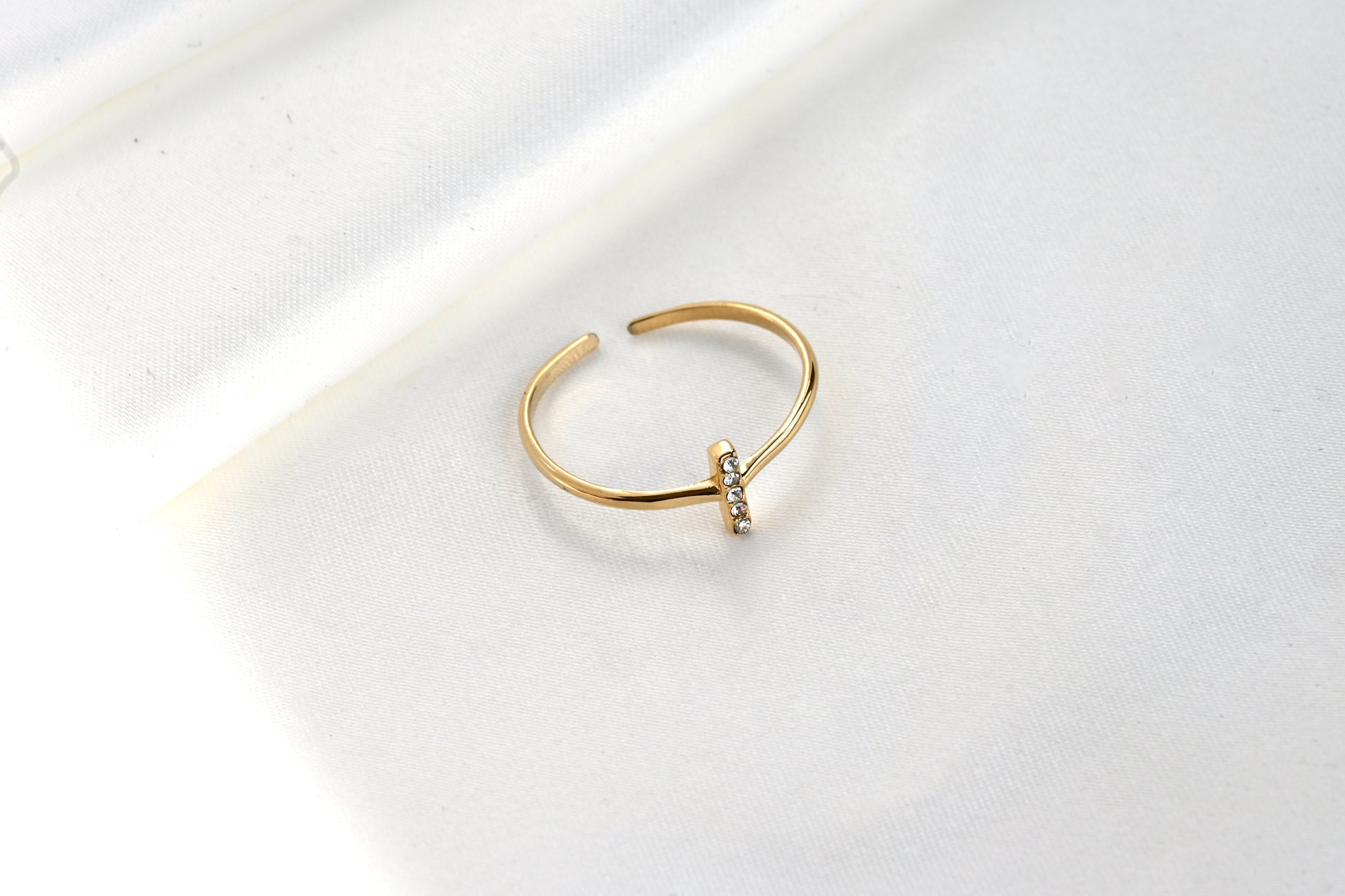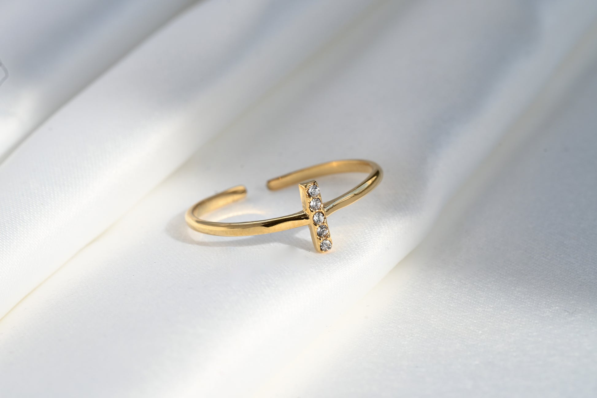 Made in 18k Gold PVD plated stainless steel and set with high-quality Cubic Zirconia stones in a pave setting, this waterproof sleek bar ring has an open design and is a piece you will hold on to forever.