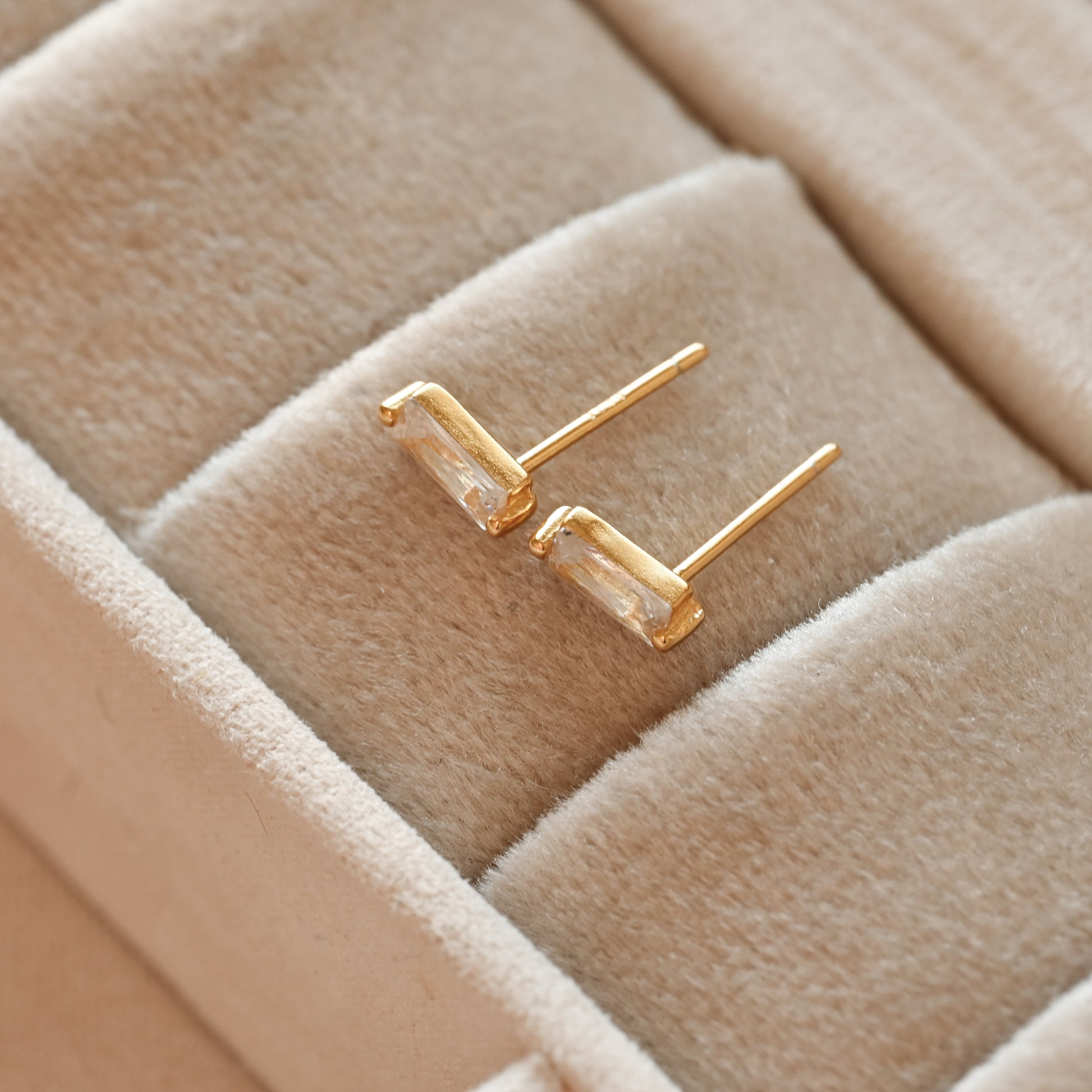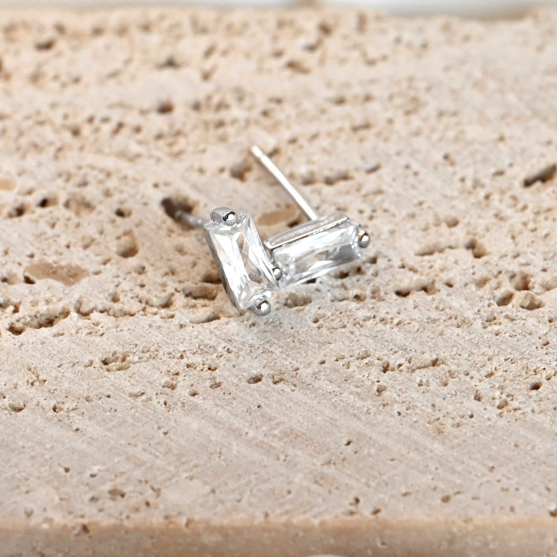 These 4x8mm diamond bar studs in sterling silver, offered in both silver and gold-plated finishes, feature a baguette diamond for a bit of shine. Perfect for those who love minimalist jewelry or simple, everyday earrings that add a subtle touch of style.