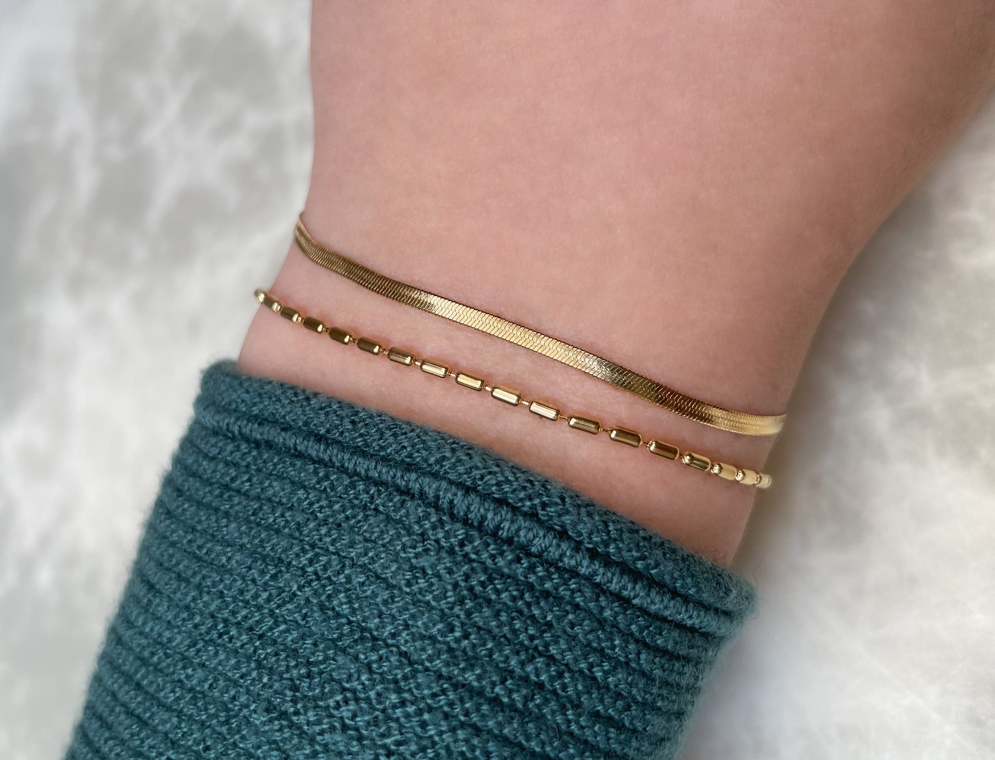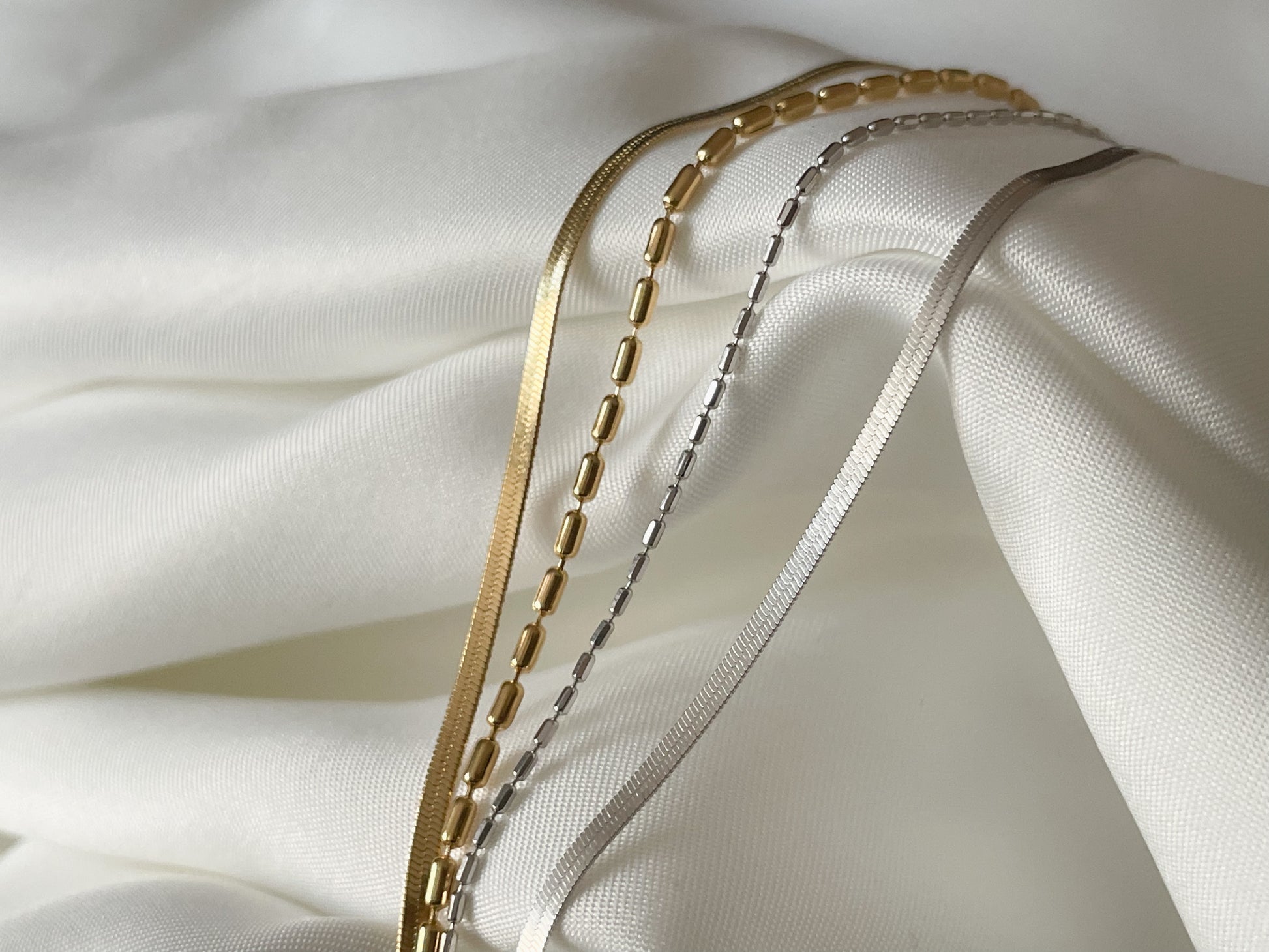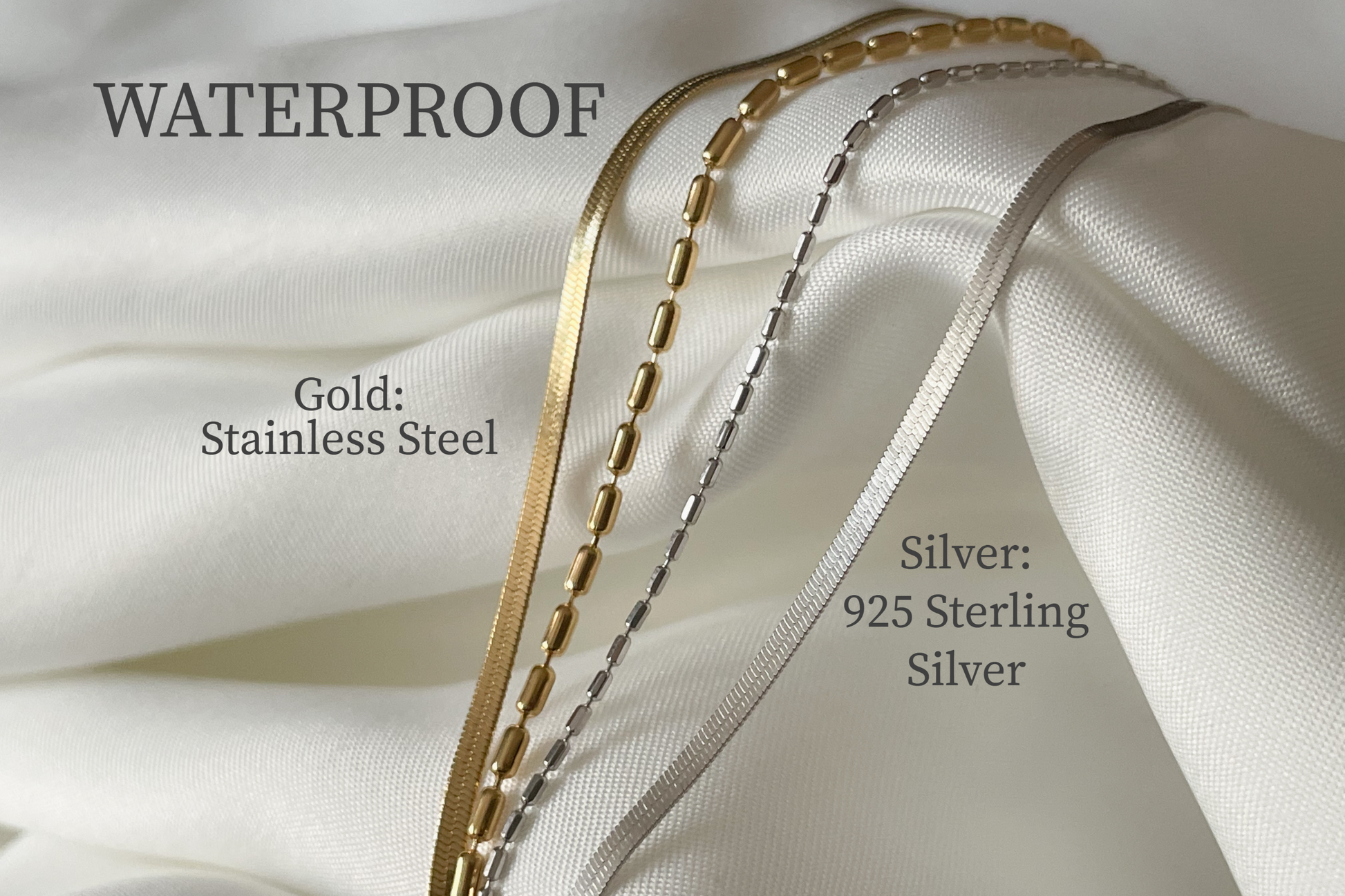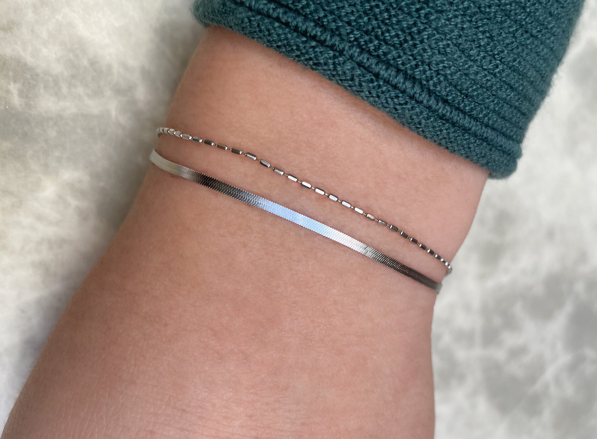 Lovely design, dainty and perfect for any special occasion ! Handcrafted in stainless steel in gold and 925 sterling silver in silver, this layered design features a 2 mm herringbone chain and a delicate ball chain secured with a lobster clasp. Add a touch of personalization with your choice of letter charms which will be placed at the clasp area.