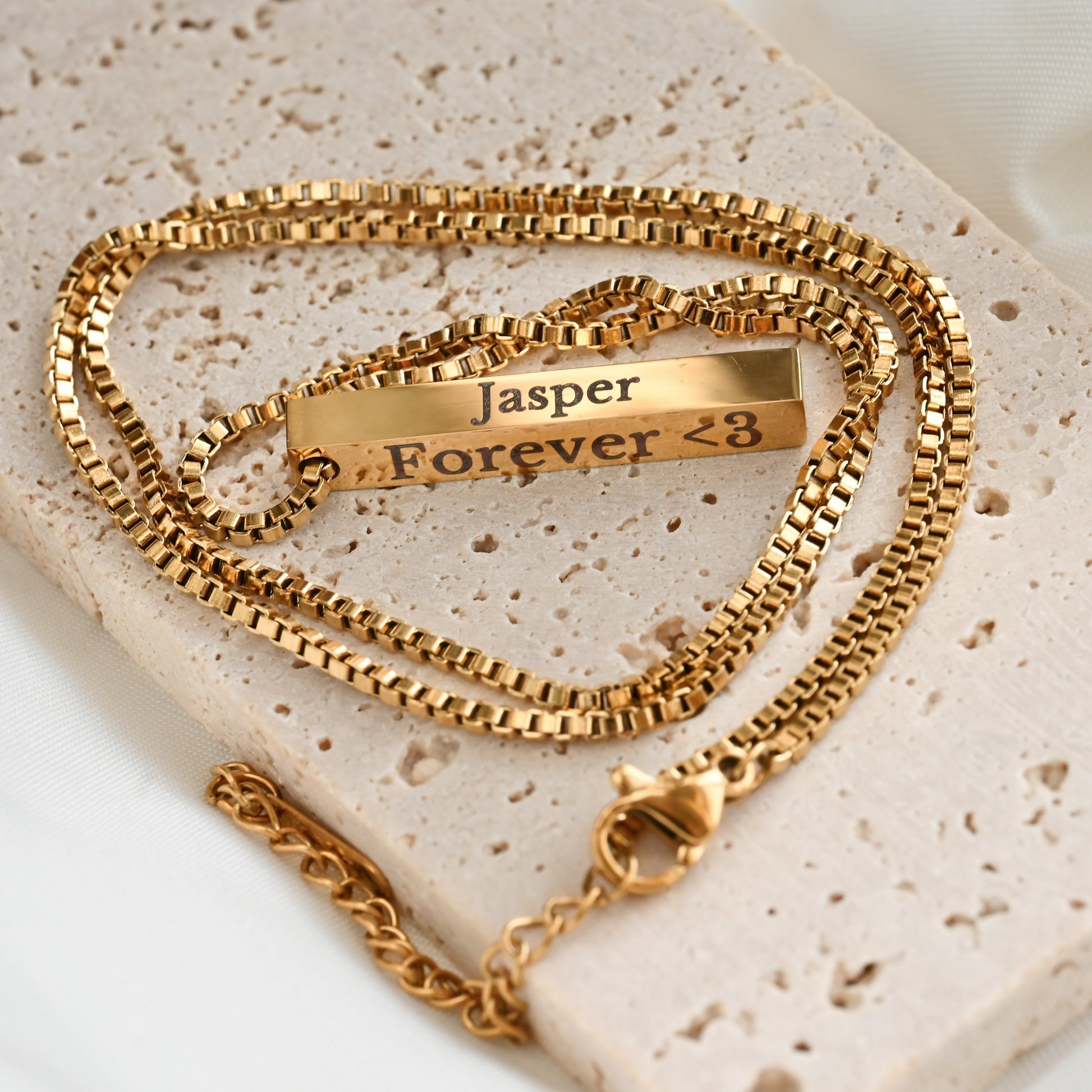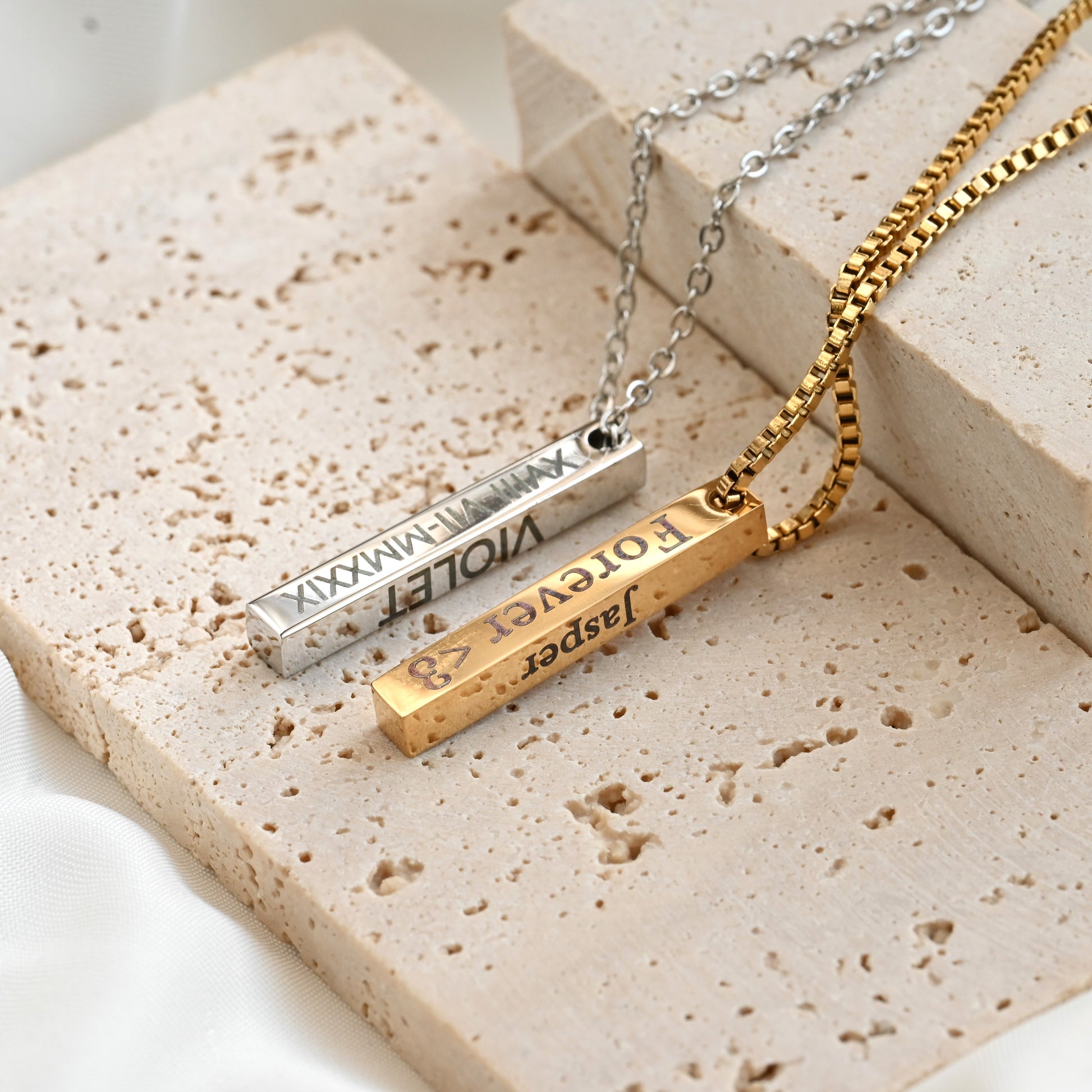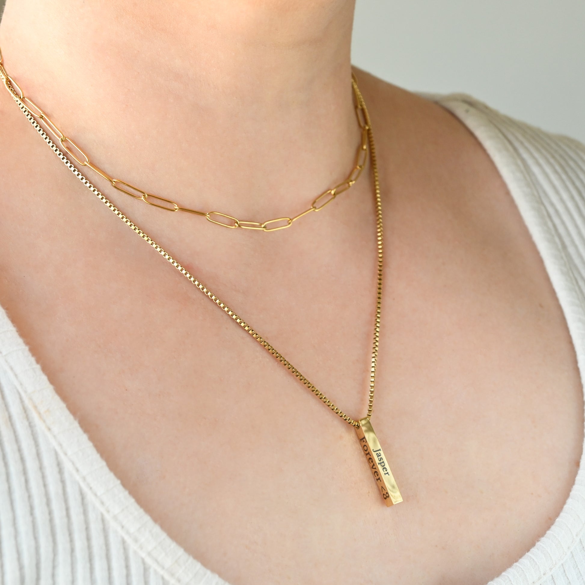 Our Engraved Vertical Bar Necklace lets you wear your loved ones close. Choose one or more sides of the bar and pick your chain style: box or cable, available in 16", 18" and 20" lengths, plus a 2" extender. Made from stainless steel with 18k gold PVD plating or a silver finish, this necklace is waterproof and tarnish-free.