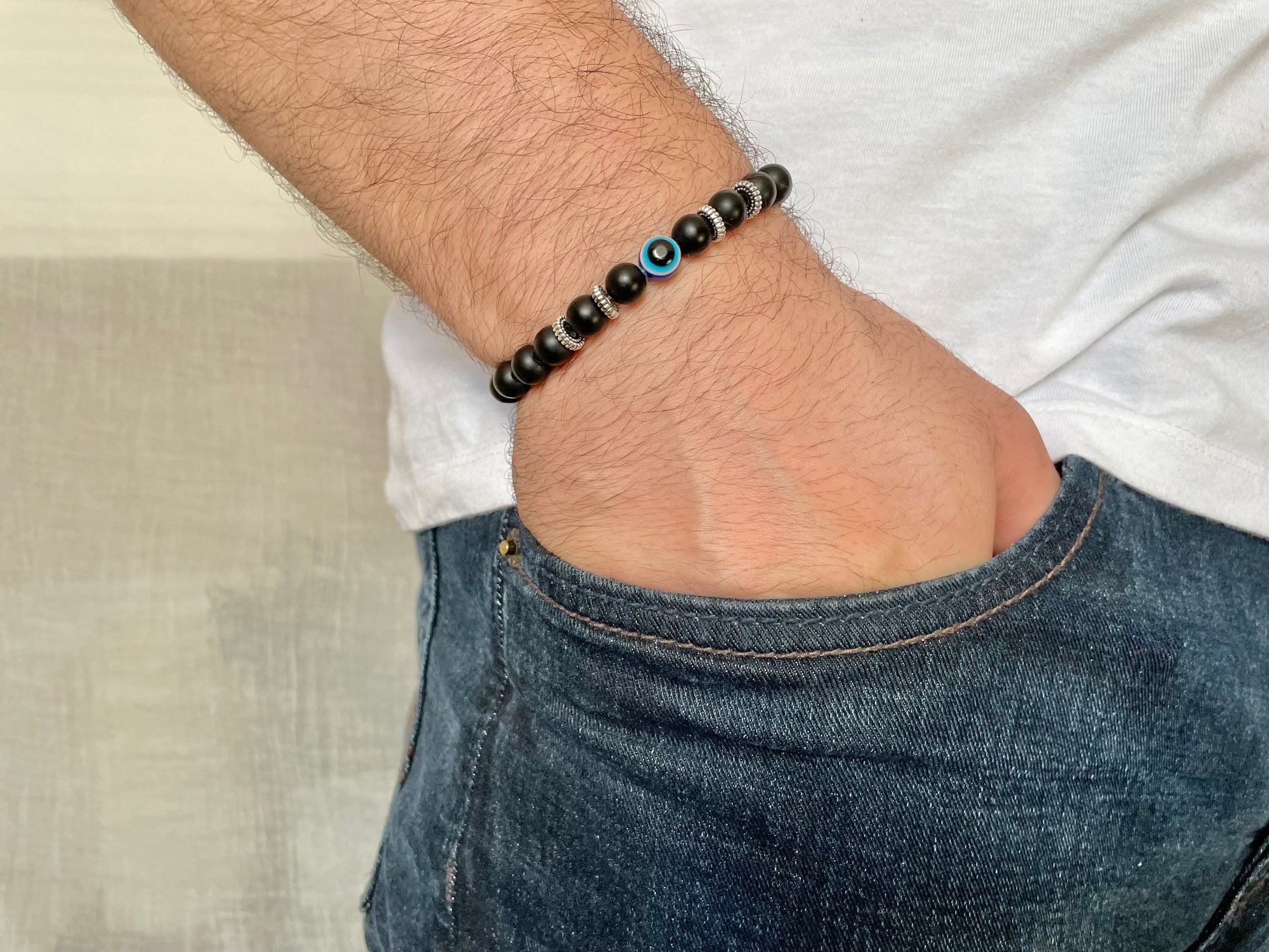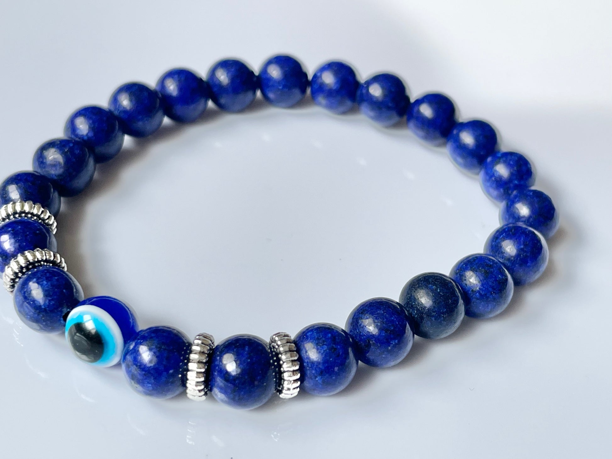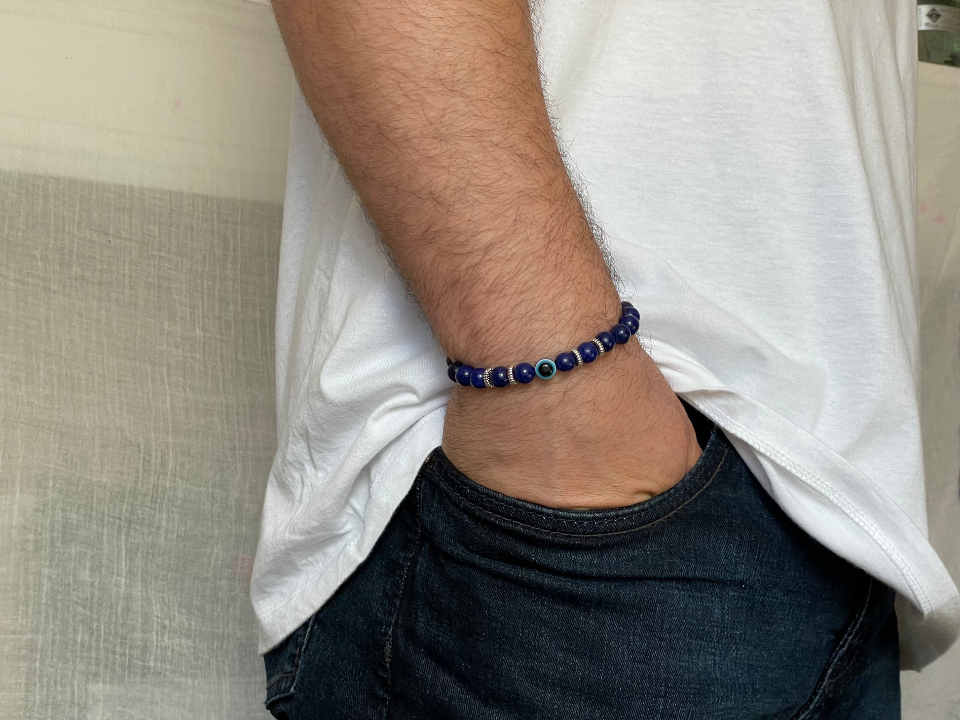 Semi precious 6 mm stones finished on a strong elastic cord come together with the powerful symbol of the evil eye. This stretch bead bracelet features and evil eye bead and natural stones including lava rocks, lapis lazuli, granite and blue tiger eye. Perfect stretch bracelet for men for extra protection, mental health and wellness as these stones are believed to reduce anxiety, promote calmness and relaxation and heal you..