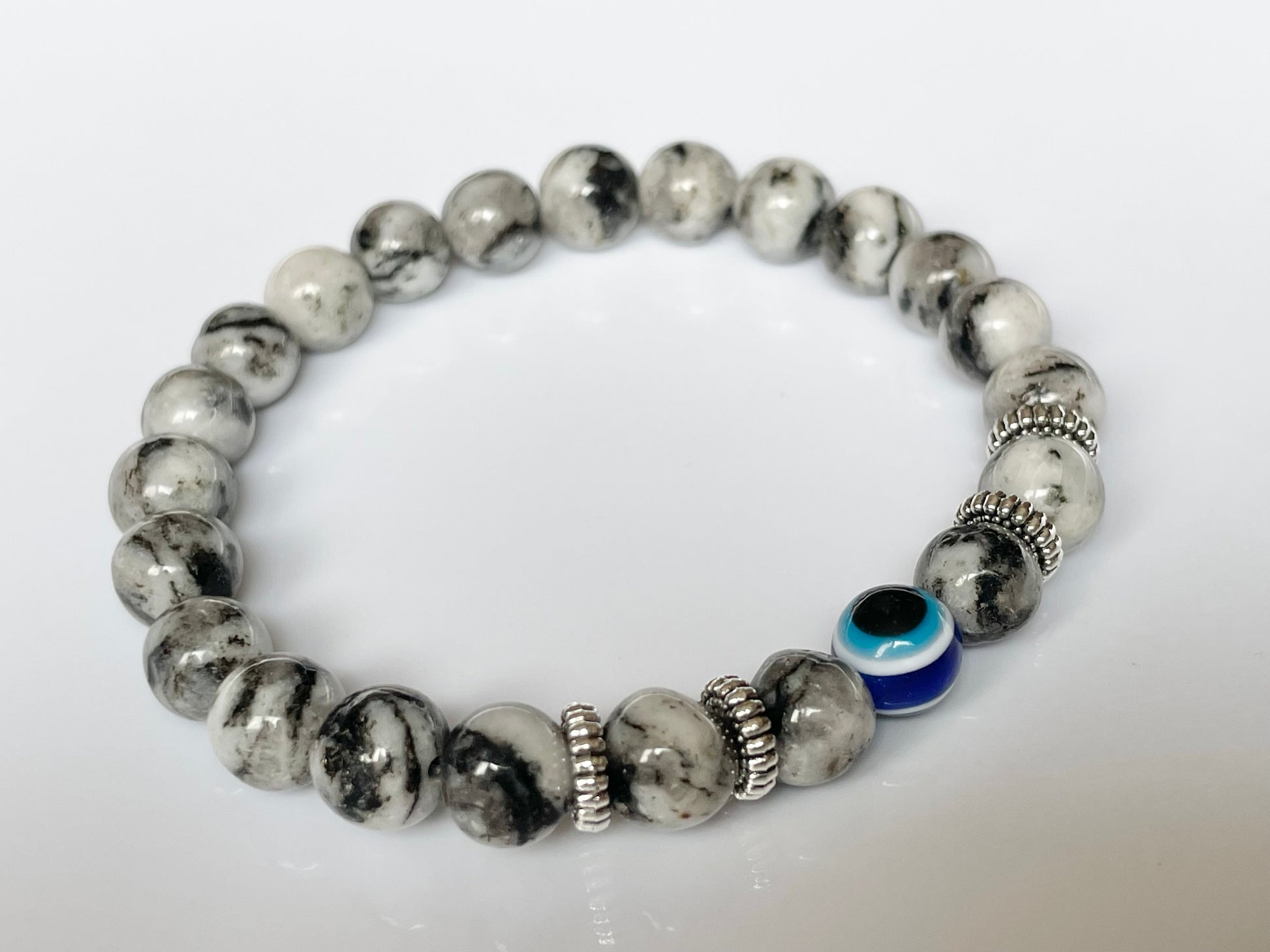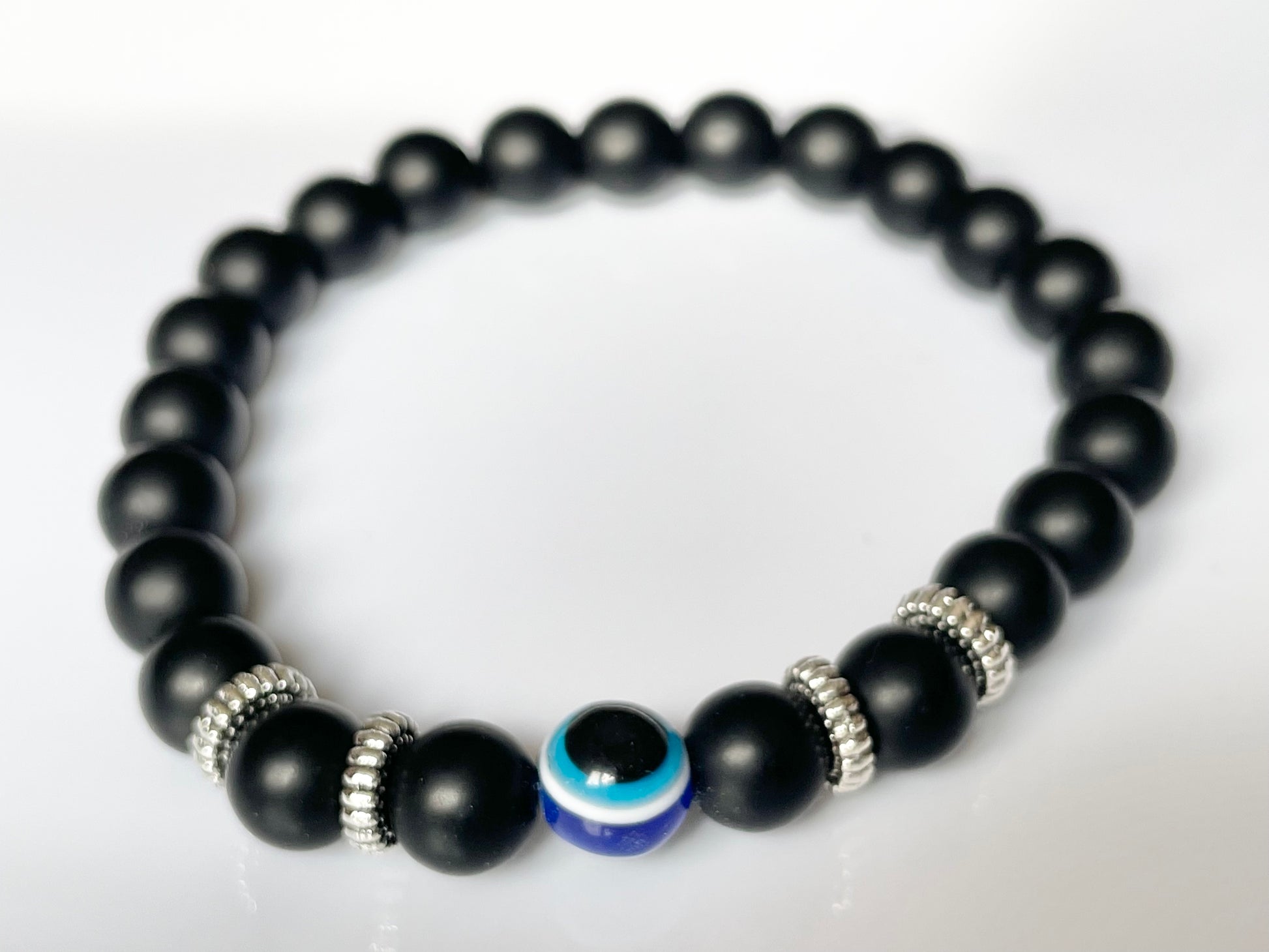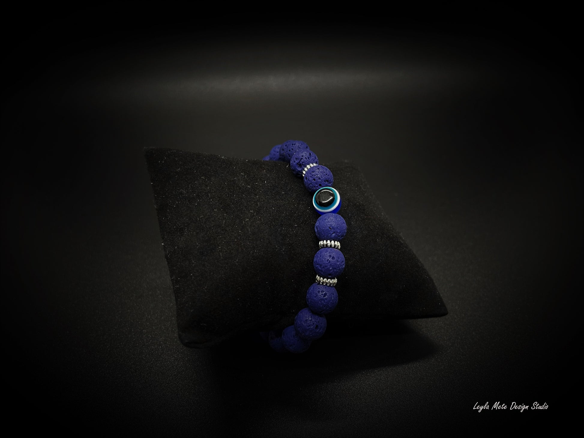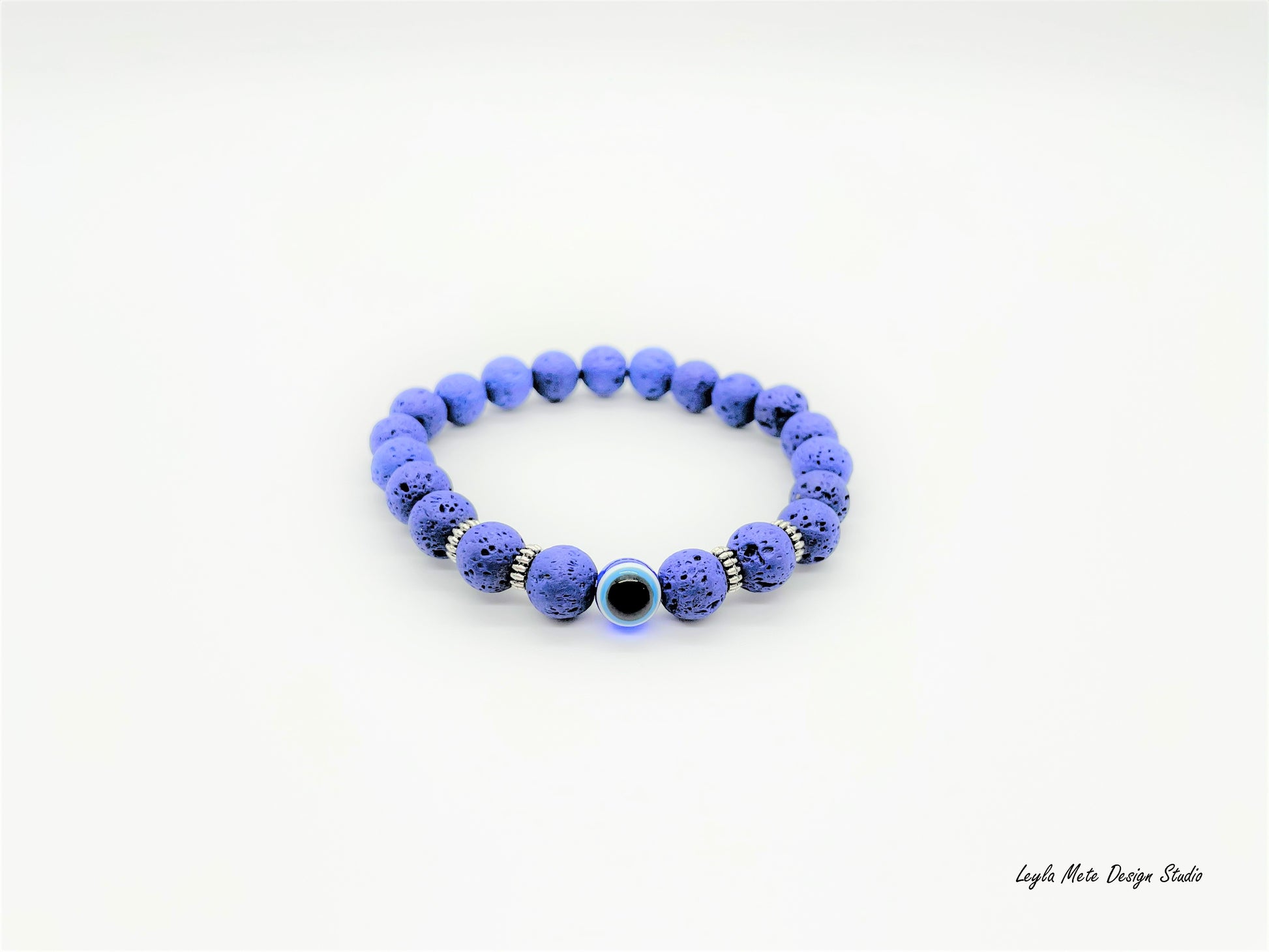 Semi precious 6 mm stones finished on a strong elastic cord come together with the powerful symbol of the evil eye. This stretch bead bracelet features and evil eye bead and natural stones including lava rocks, lapis lazuli, granite and blue tiger eye. Perfect stretch bracelet for men for extra protection, mental health and wellness as these stones are believed to reduce anxiety, promote calmness and relaxation and heal you..
