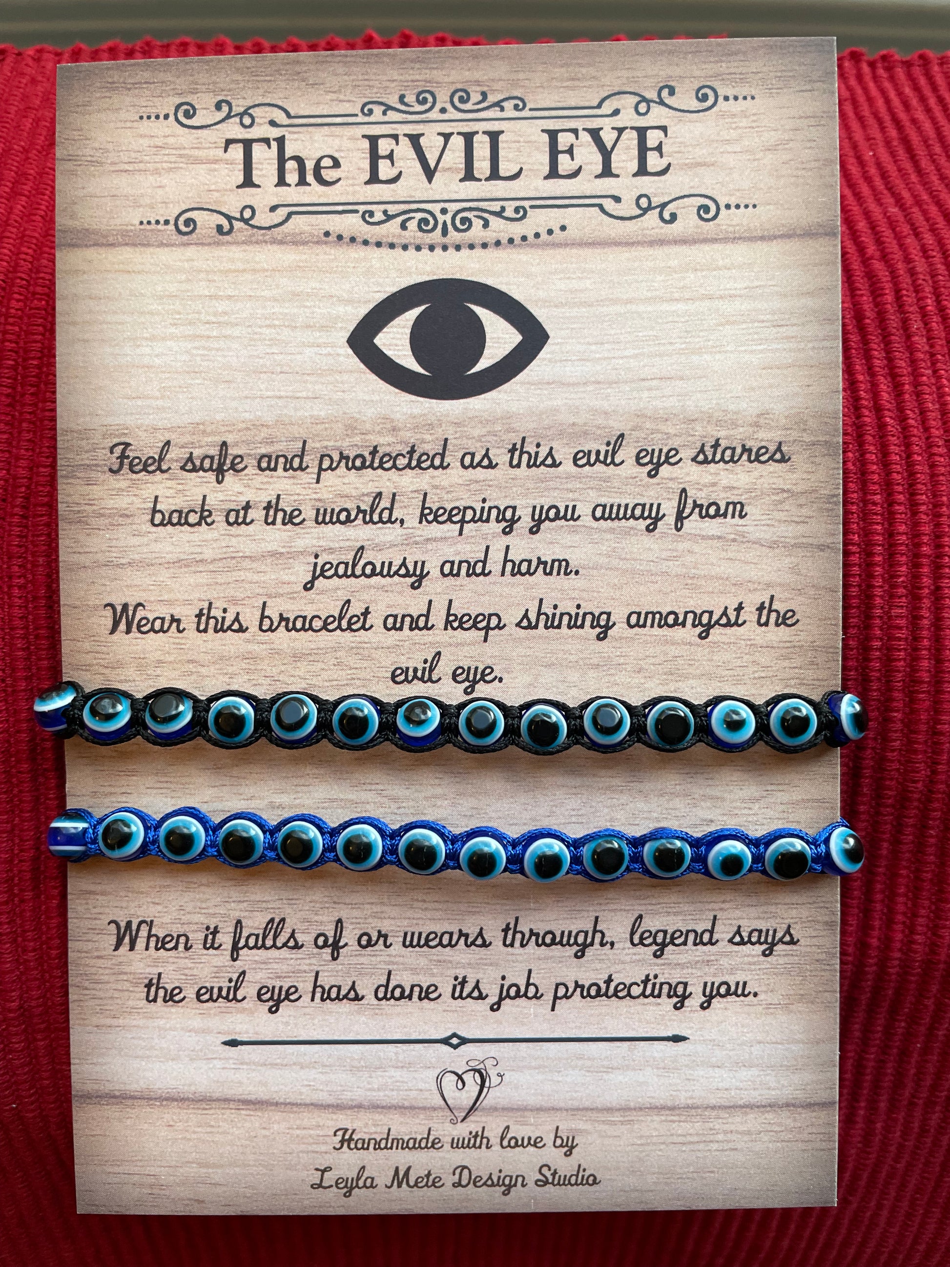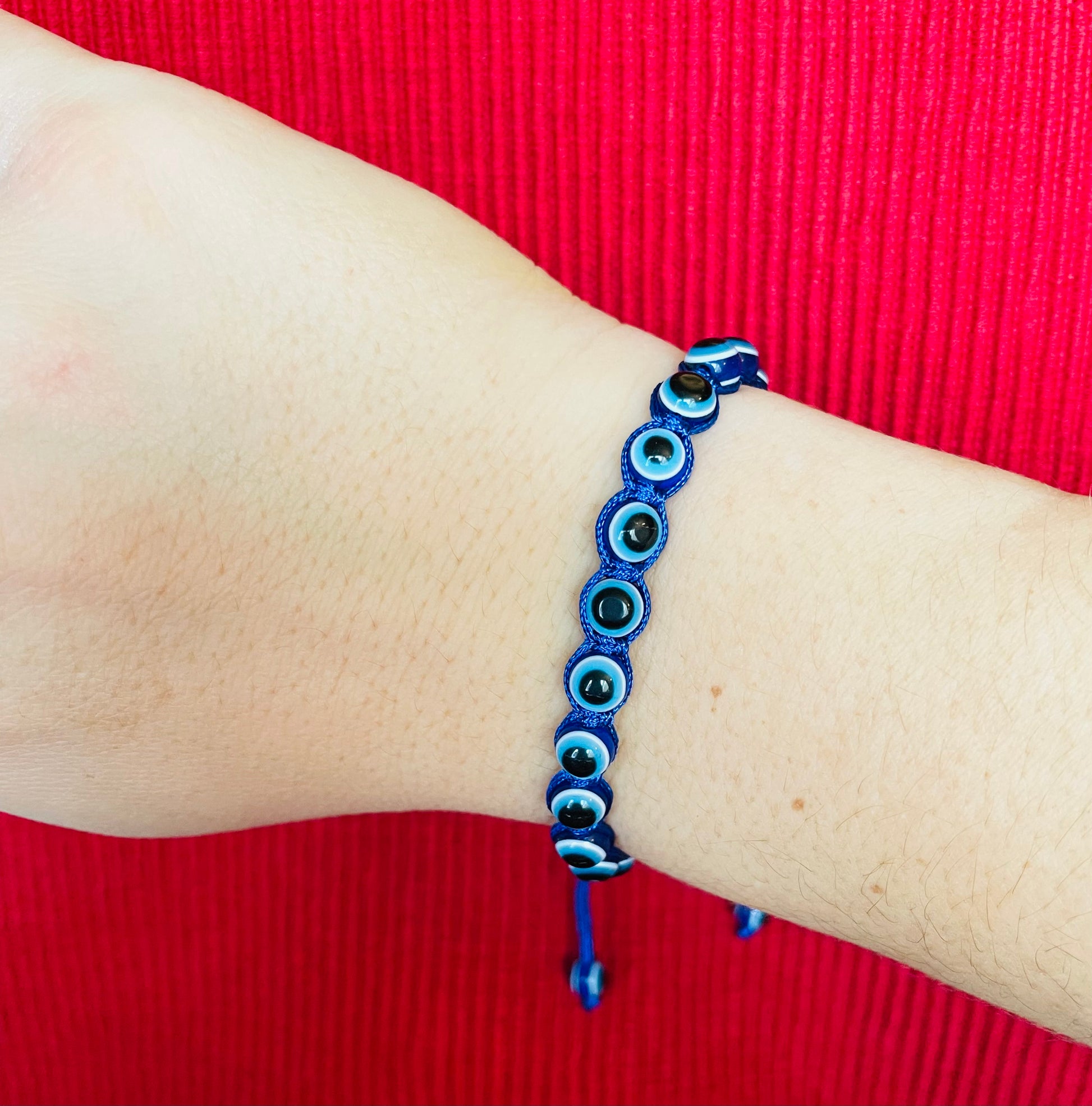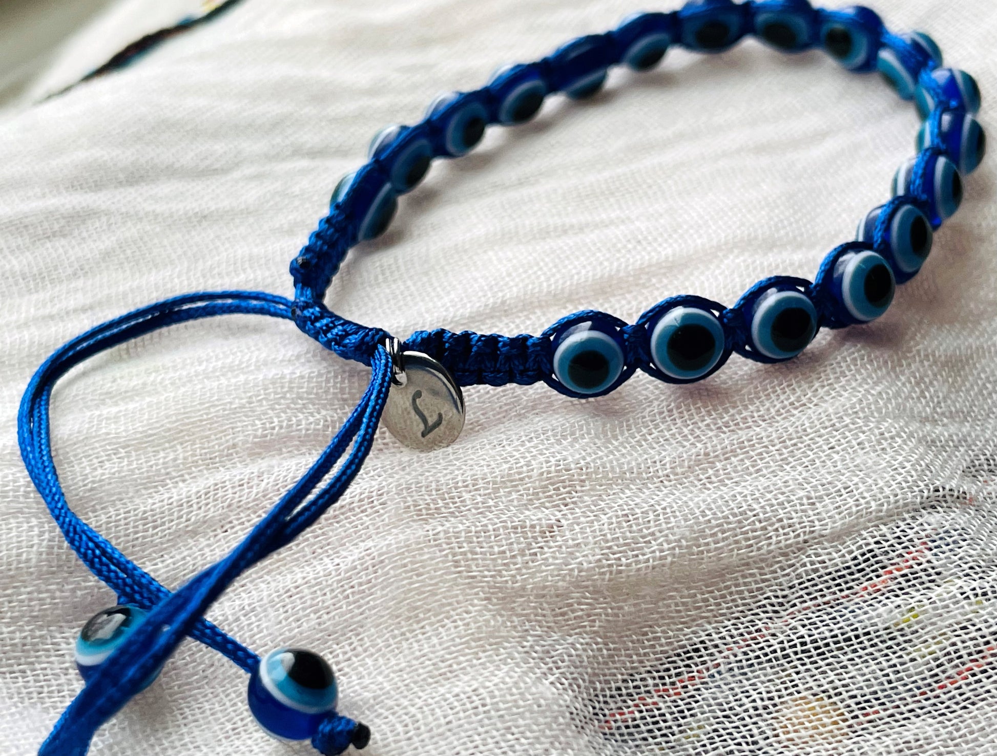 This unisex protection bracelet is an excellent choice for couples and a perfect gift for him and her. Available in black and blue string, the bracelet is braided with blue evil eye beads and two beads on each end close the bracelet with a knot. The slider clasp ensures the perfect fit both for men and women. Add a personal touch with your choice of initial charms!