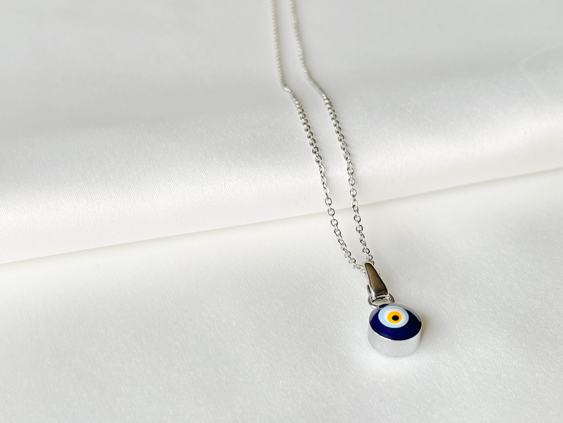 The silver plated Evil Eye Pendant Necklace adds a mystic touch to any look. The design features a 17" silver plated thin cable chain and a one-sided flat-back evil eye pendant. Add a letter charm to your necklace for a personalized touch!