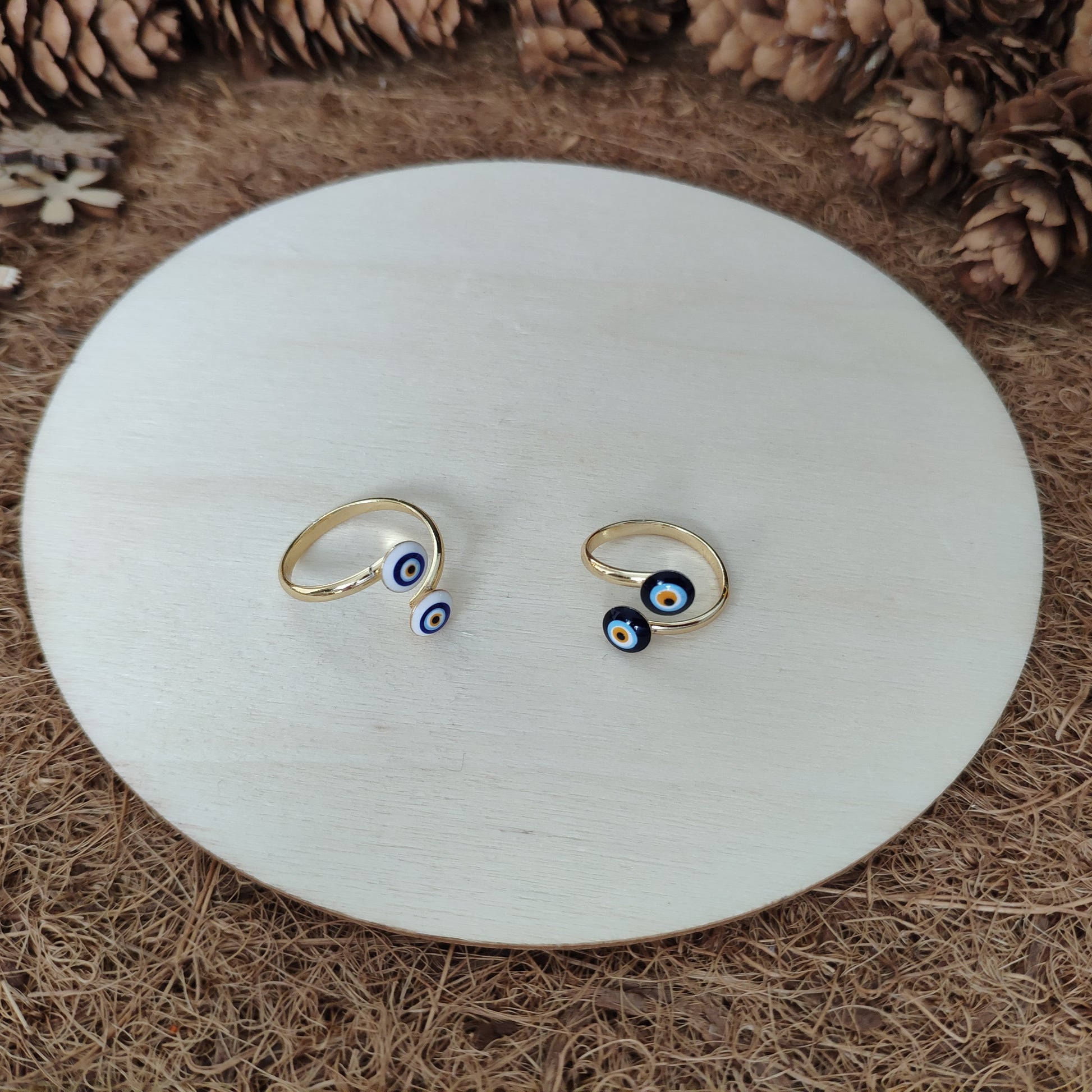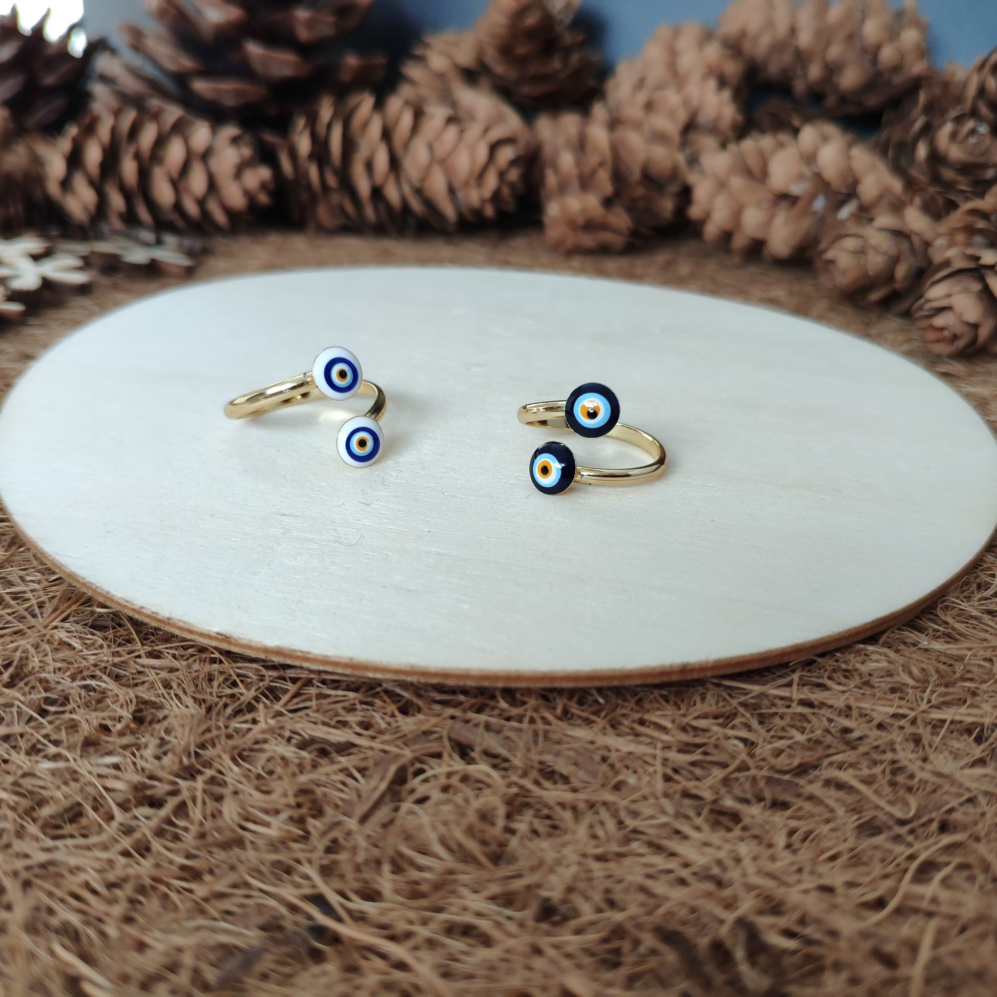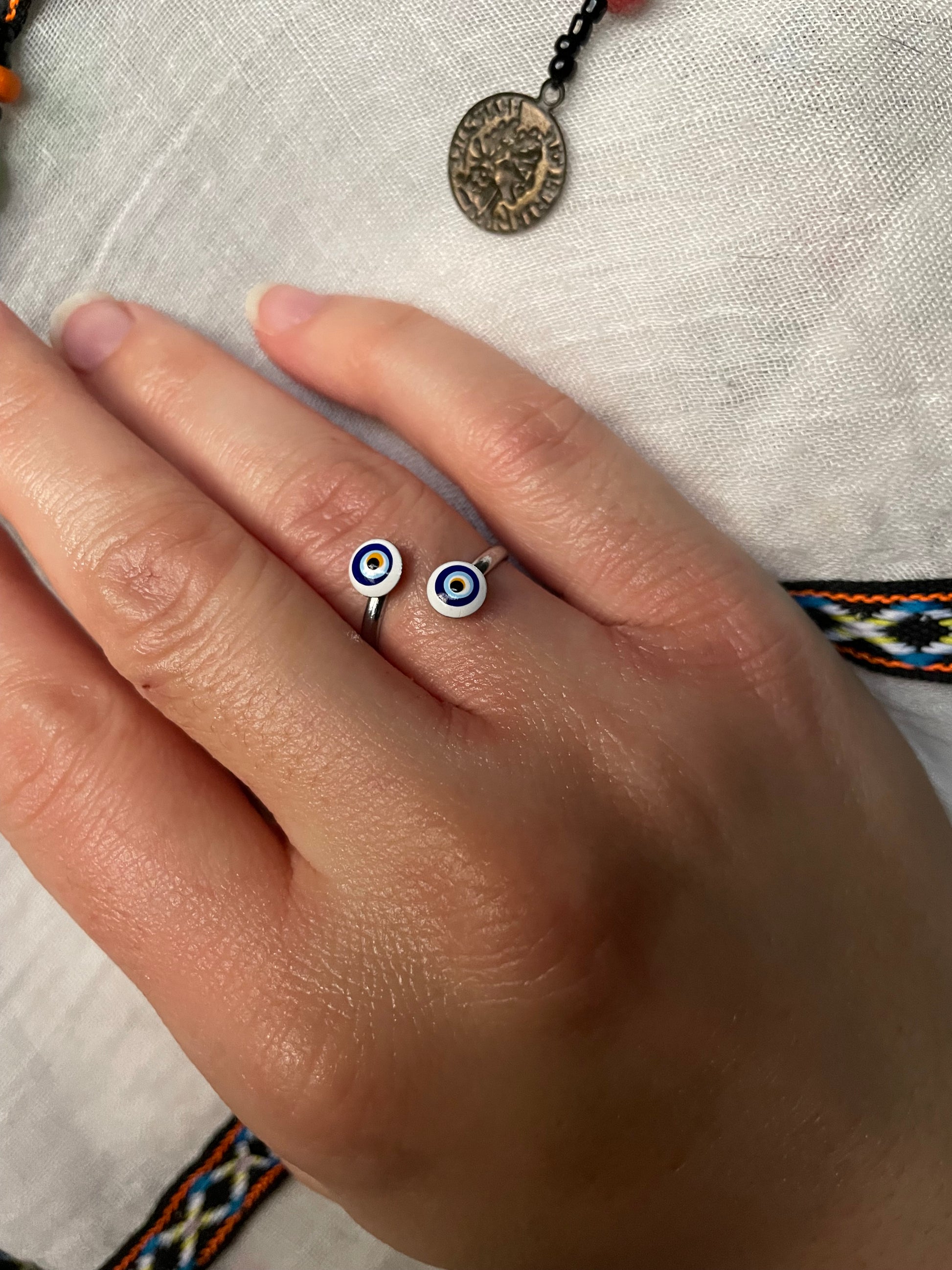 This boho wrap ring features an enamel evil eye charm and an open design that makes it a comfortable fit for every ring size. Simply adjust it to fit any finger you want and stack it with other rings. You can even use it as a knuckle ring! Choose from gold or silver bands and white or dark blue eye designs.