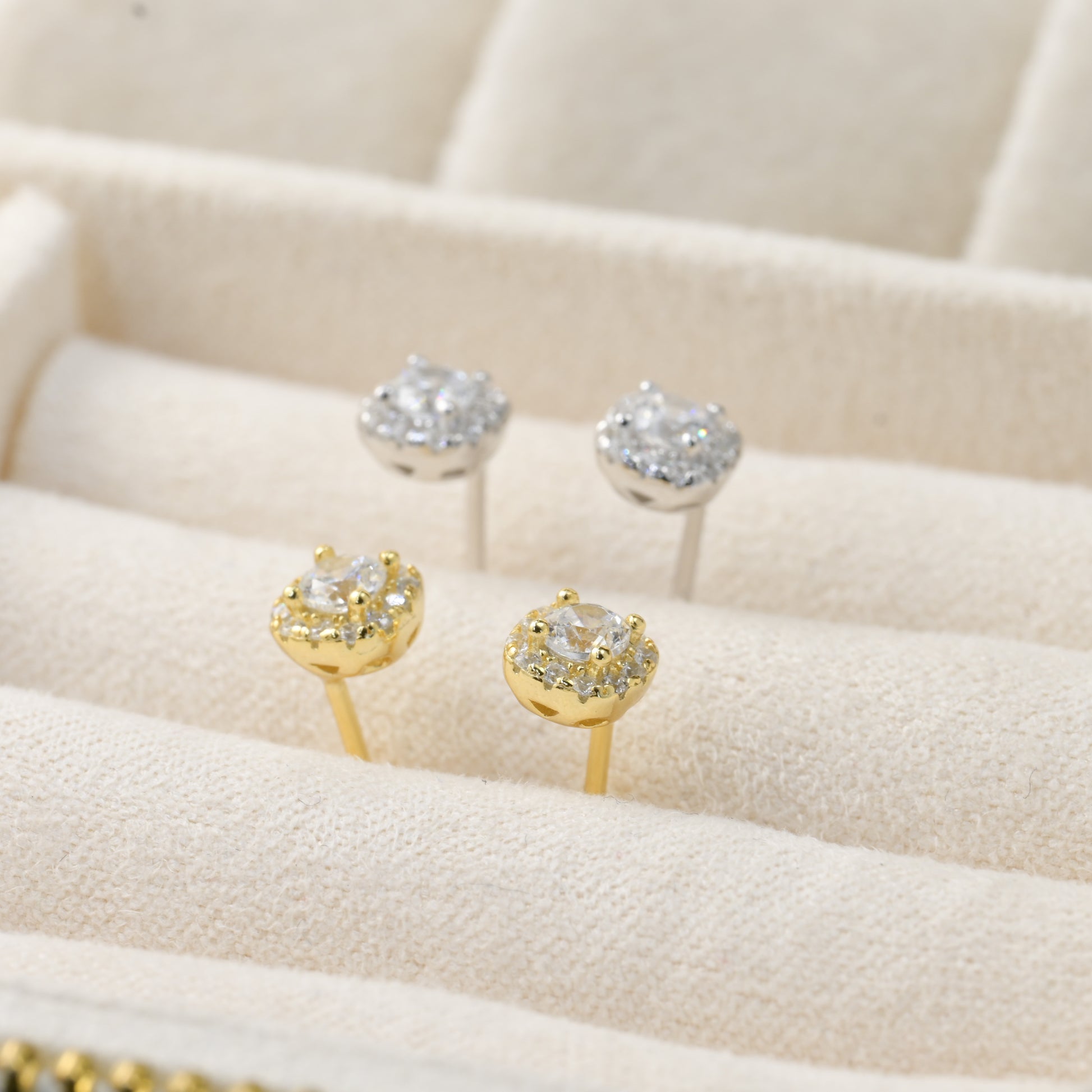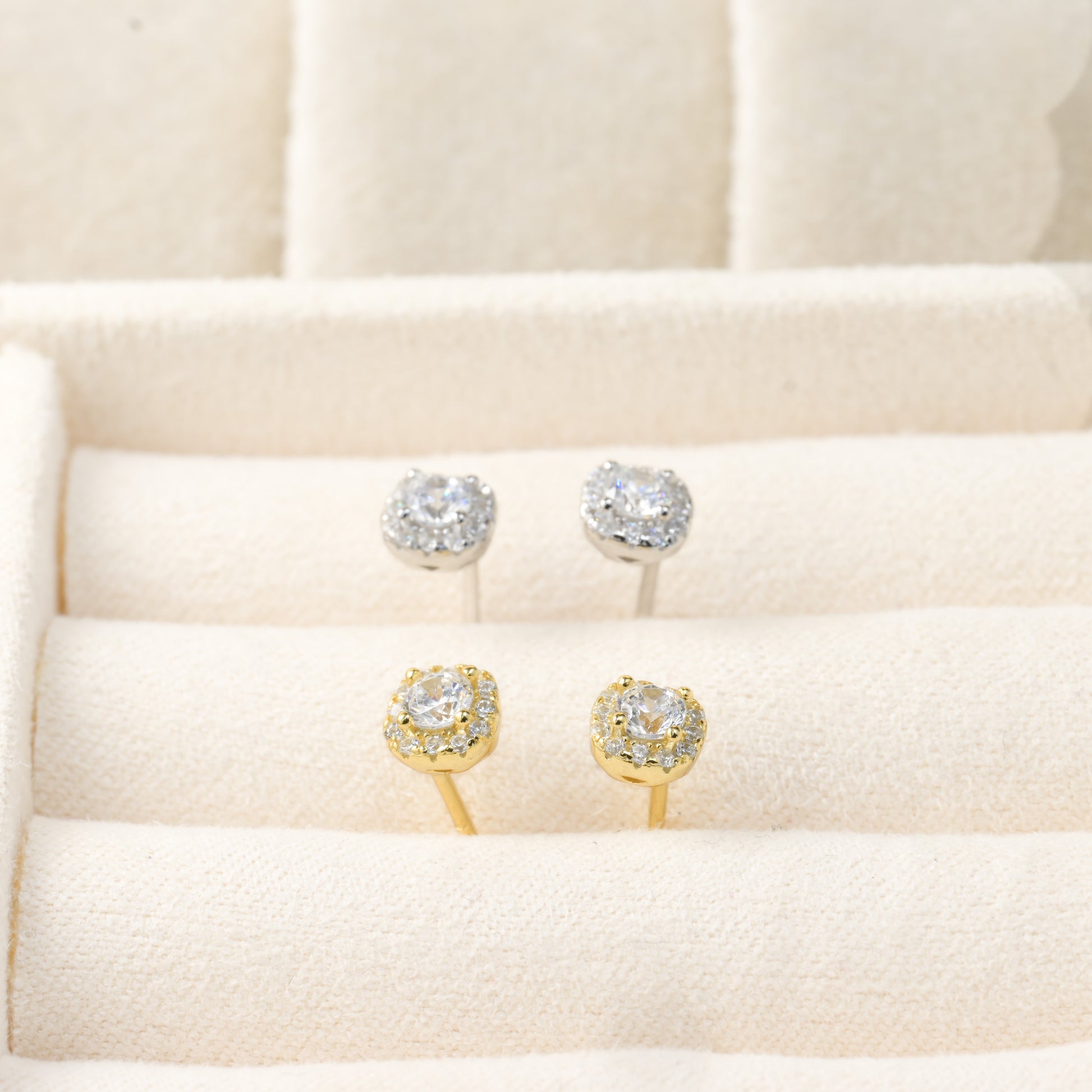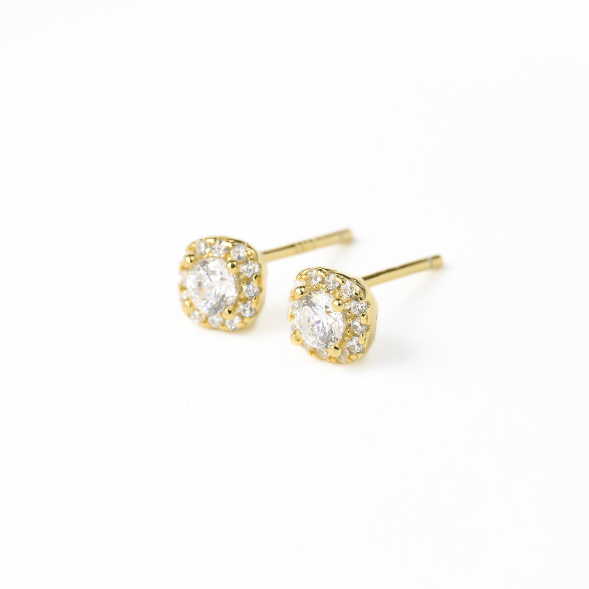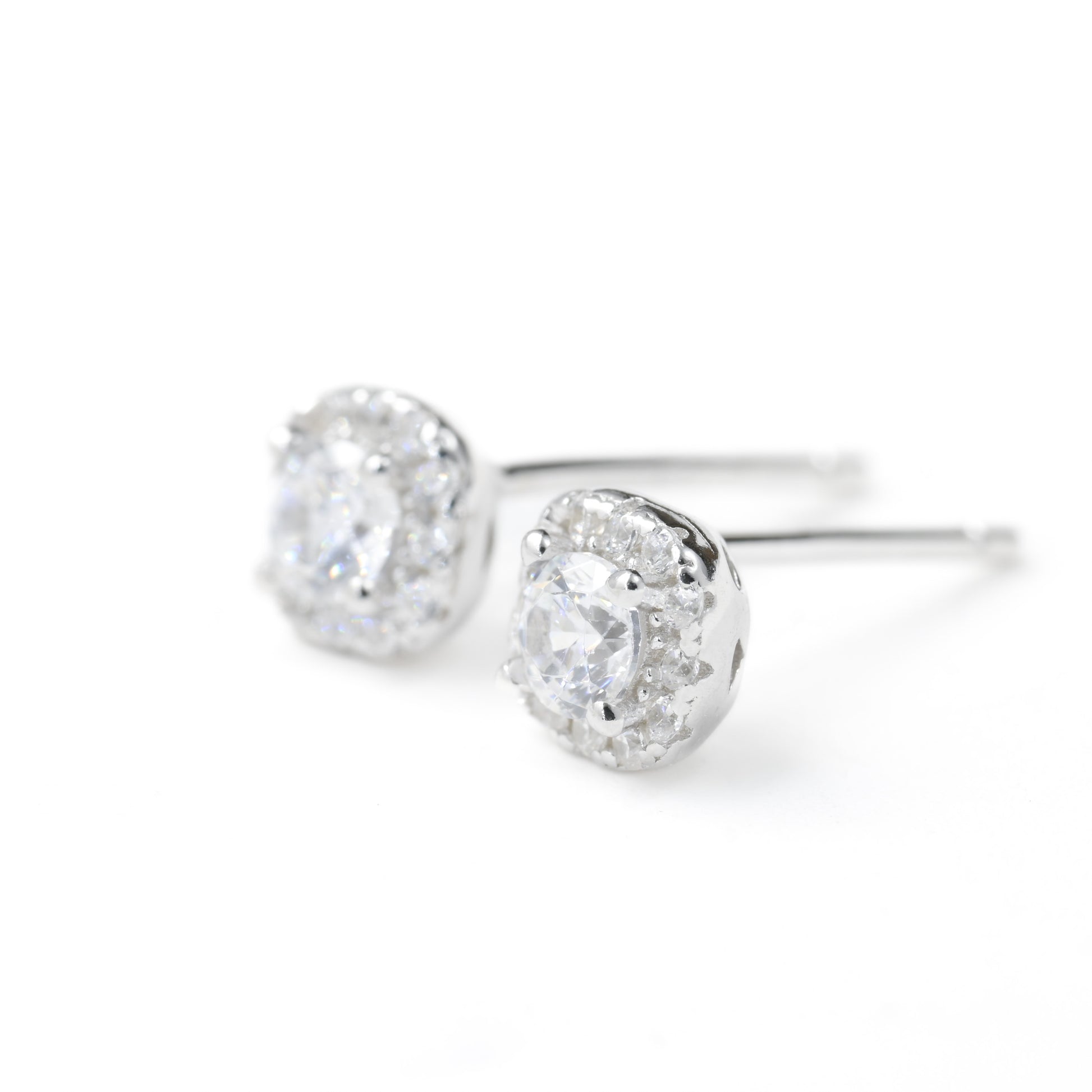Embrace classic style with our sterling silver cushion-cut halo diamond studs measuring 5mm. CZ stones add sparkle. Simple elegance for any occasion.