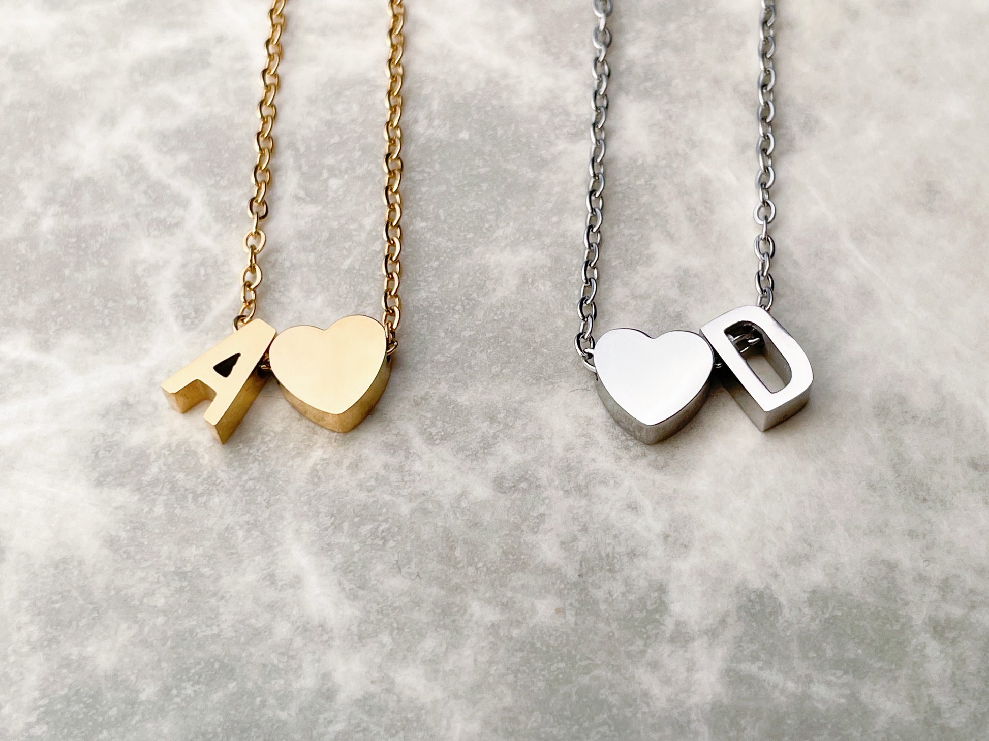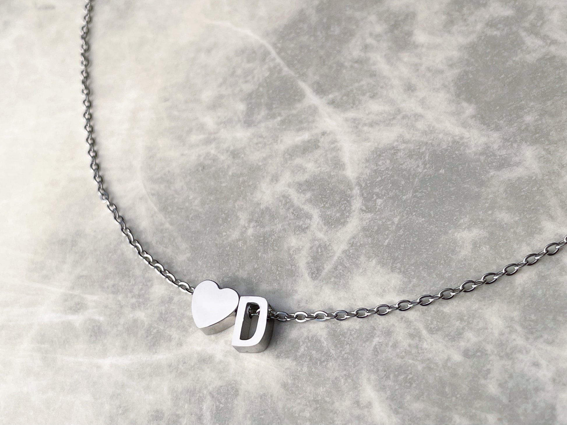 Make a statement of love with this dainty heart and initial necklace. This delicate and minimalist design features a shiny heart charm and a letter charm attached to a thin cable chain finished off with a lobster clasp. Crafted in highly polished stainless steel, charms sparkle from all angles. The chain comes in 16". Please reach out if you want to have a shorter chain.