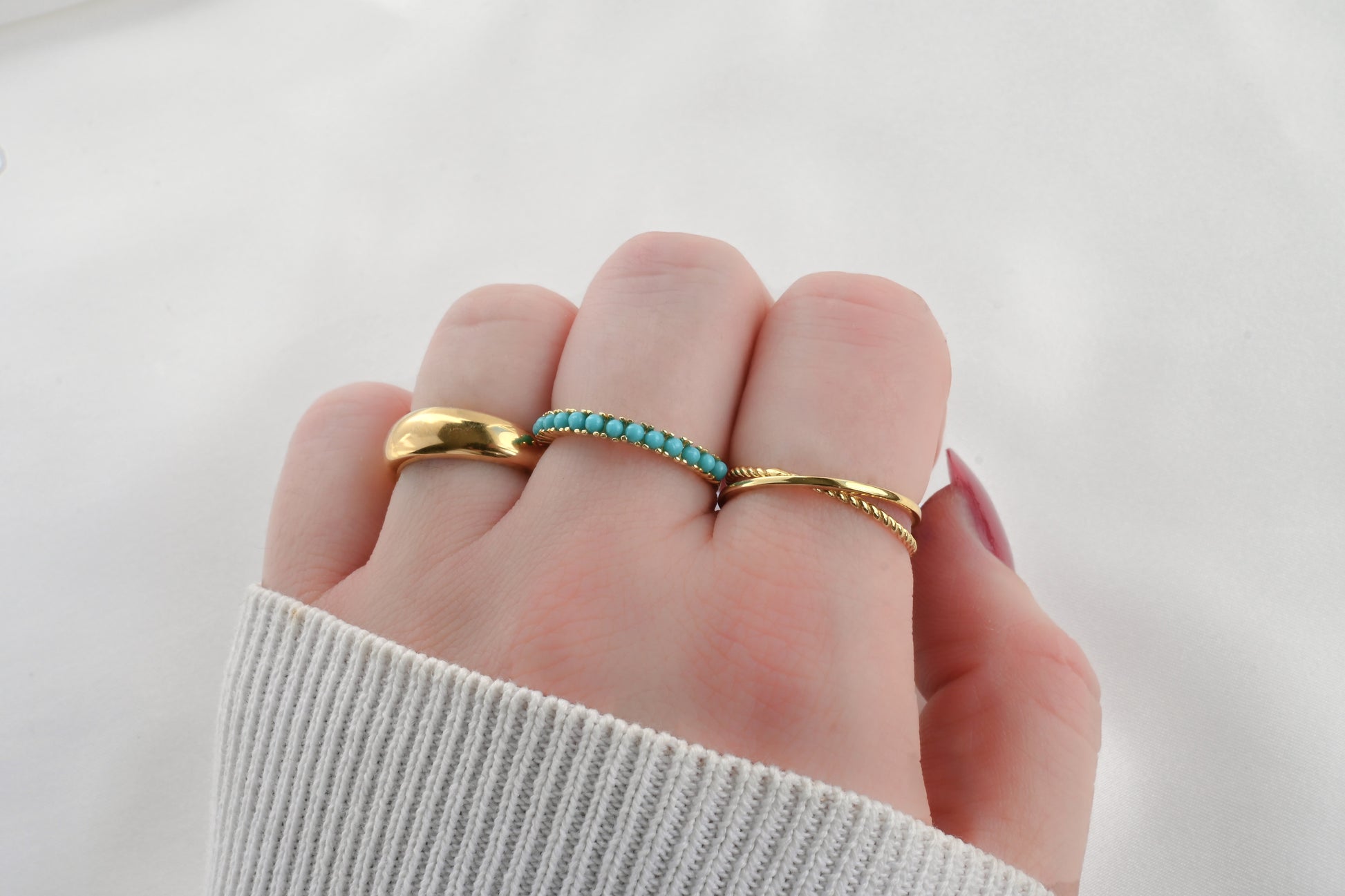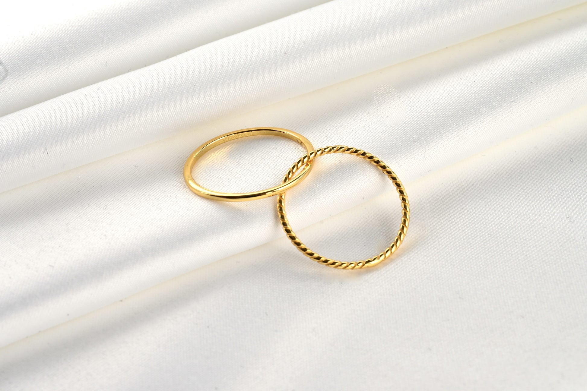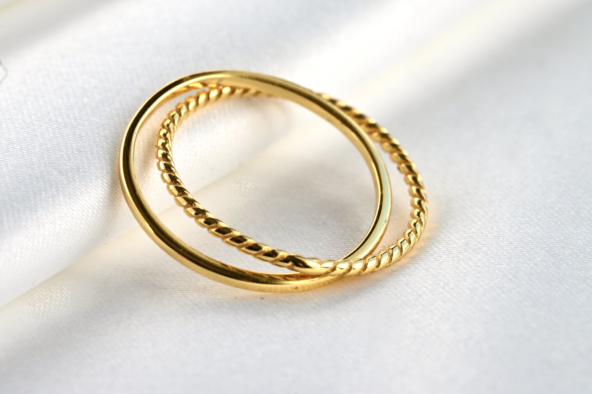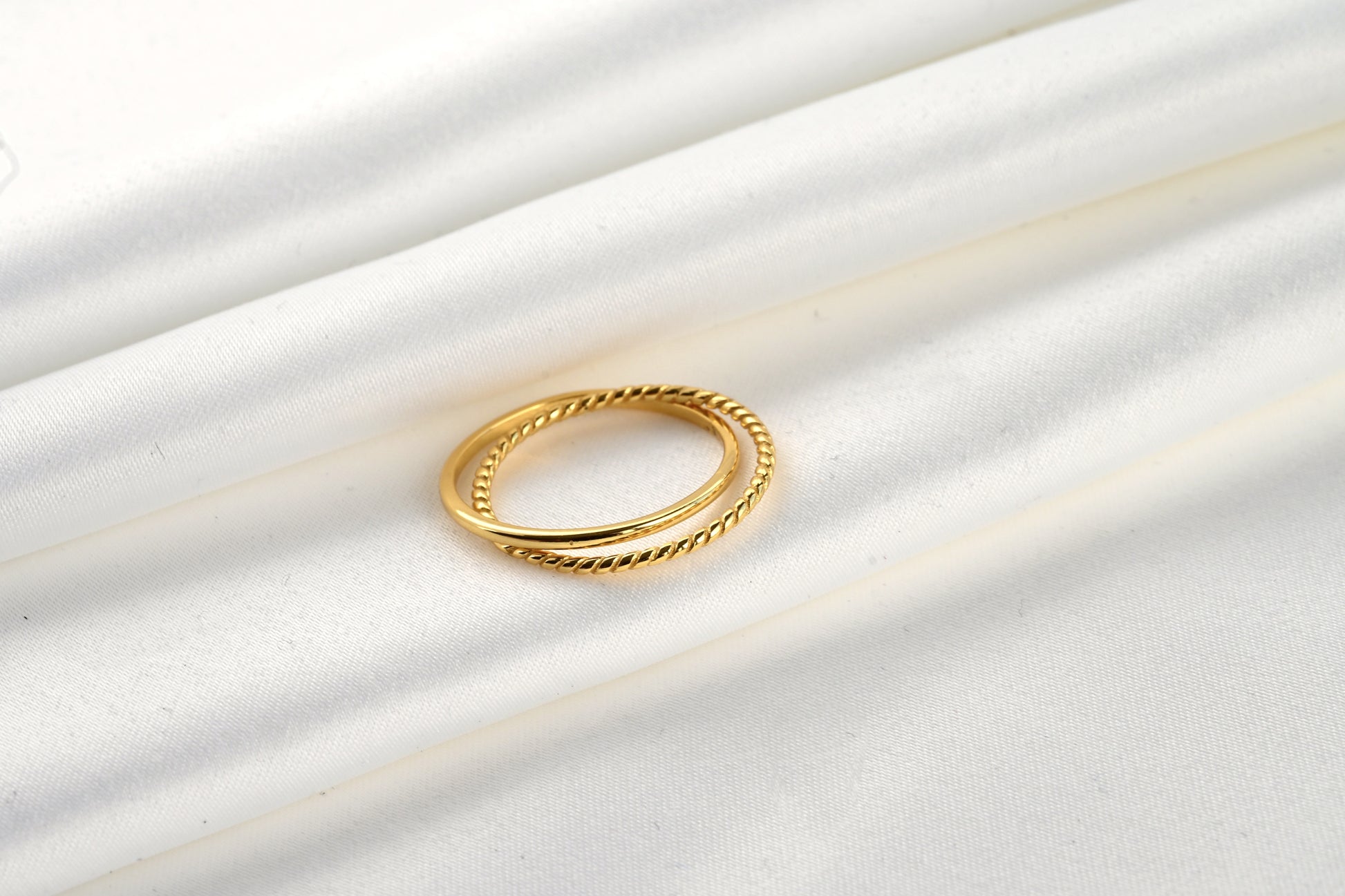 Made in 18k Gold Plated Sterling Silver, this interlocking duo ring is a piece you will hold on to forever. The ring features an interlocking 1-mm thin twisted band and a plain band that complement each other. Pair it with bold rings to create a stack.