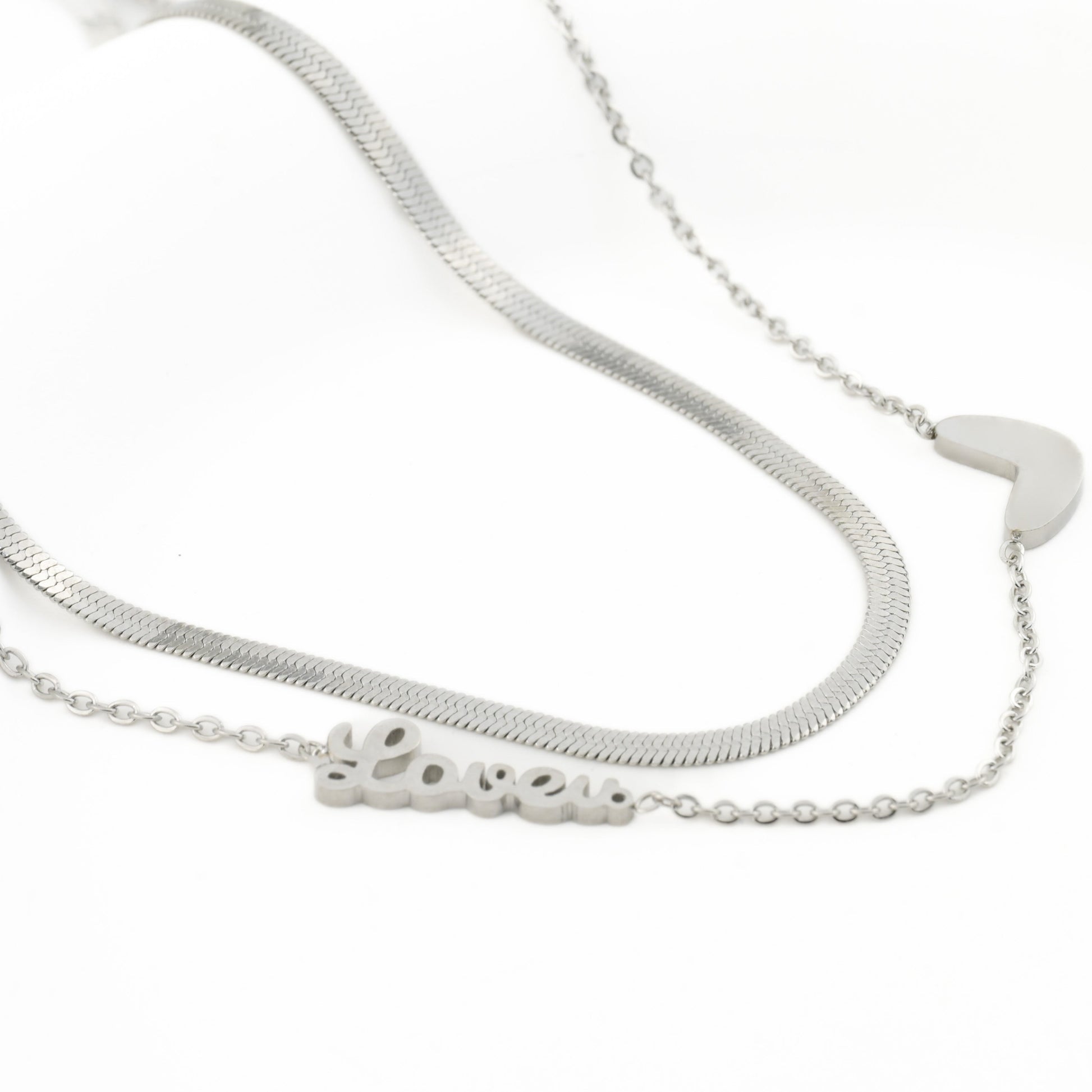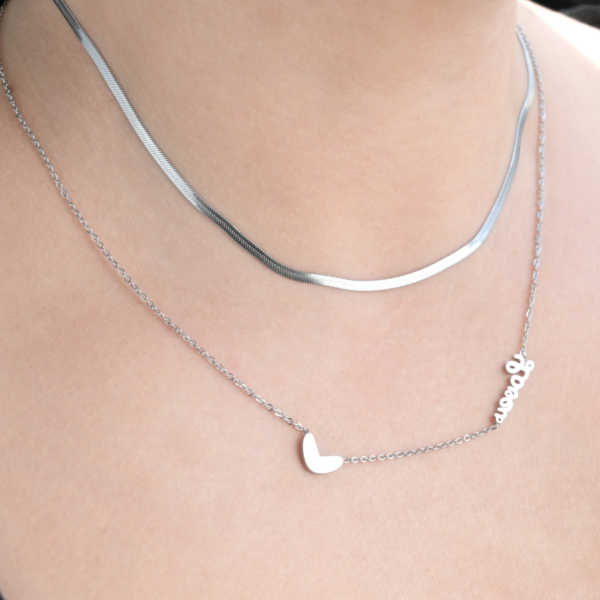 Stainless steel two-layered herringbone necklace ensures lasting elegance. Featuring a 2.5mm herringbone chain (15" length) and a 17.5" cable chain with a small heart and "love" station, it adds charm to any look. Available in gold and silver.
