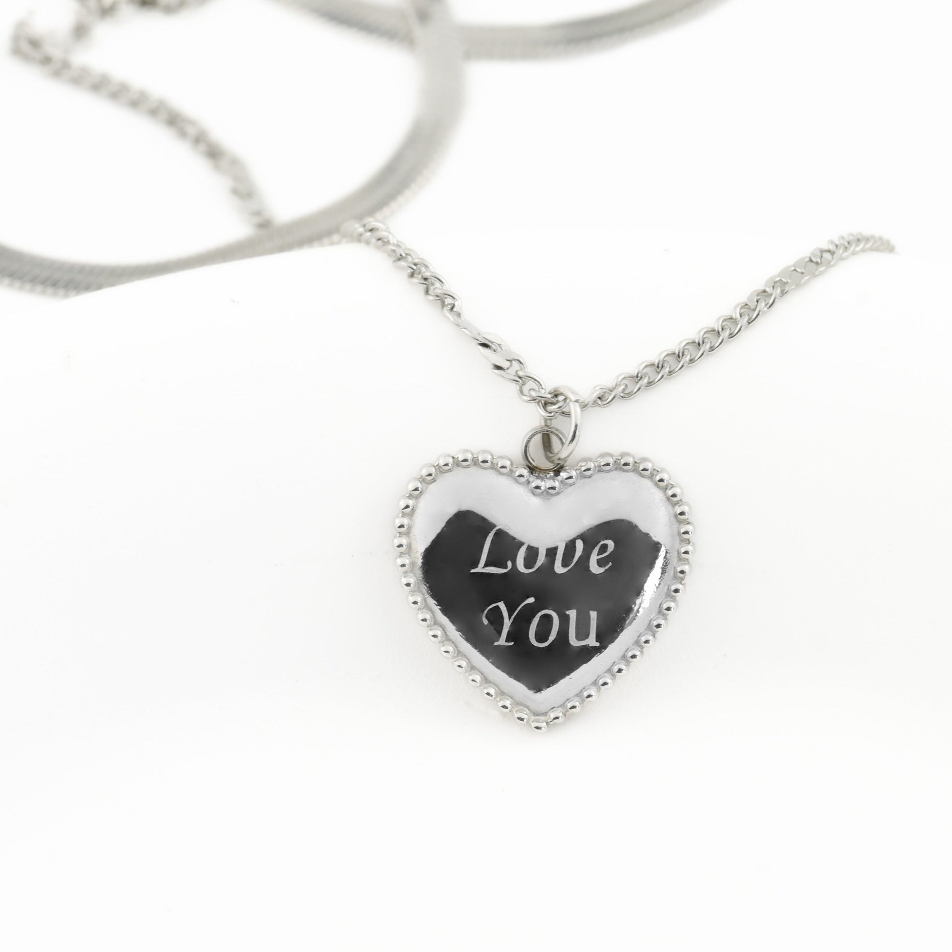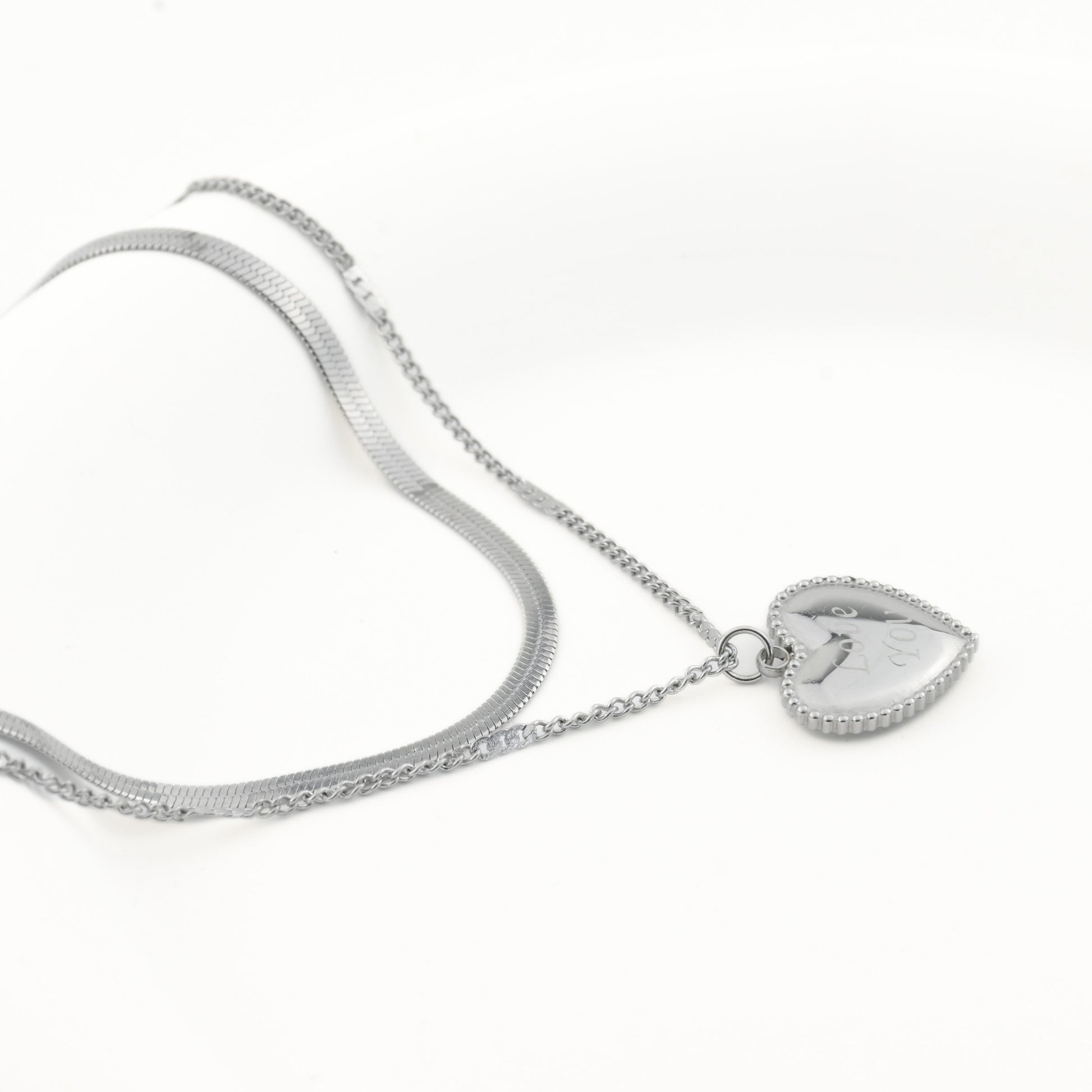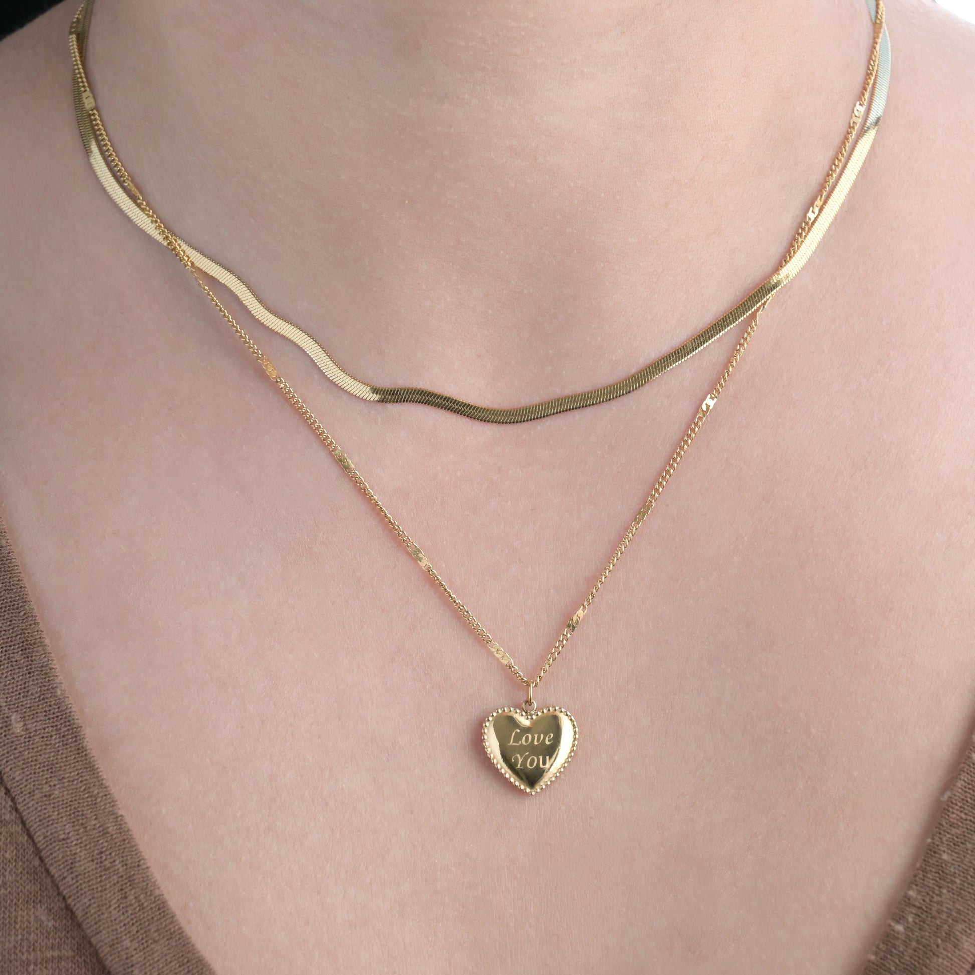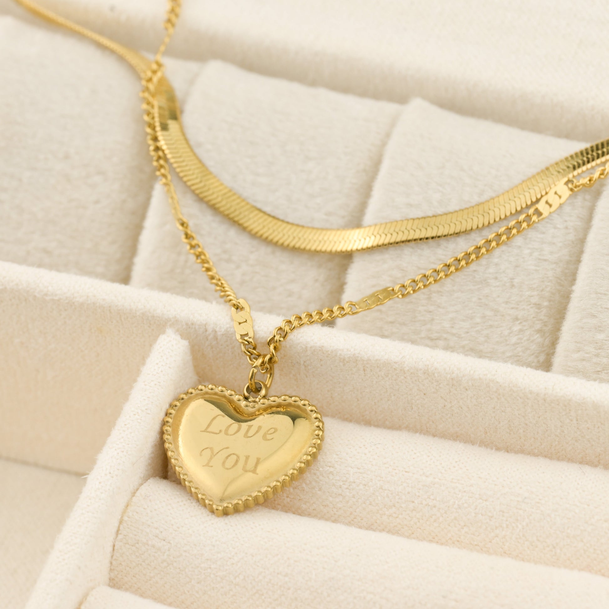 Stainless steel two-layered herringbone necklace ensures lasting elegance. Featuring a 2.5mm herringbone chain (15" length) and a 17" thin curb sequin chain with a small heart with 'Love You' engraving, it adds charm to any look. Available in gold and silver.