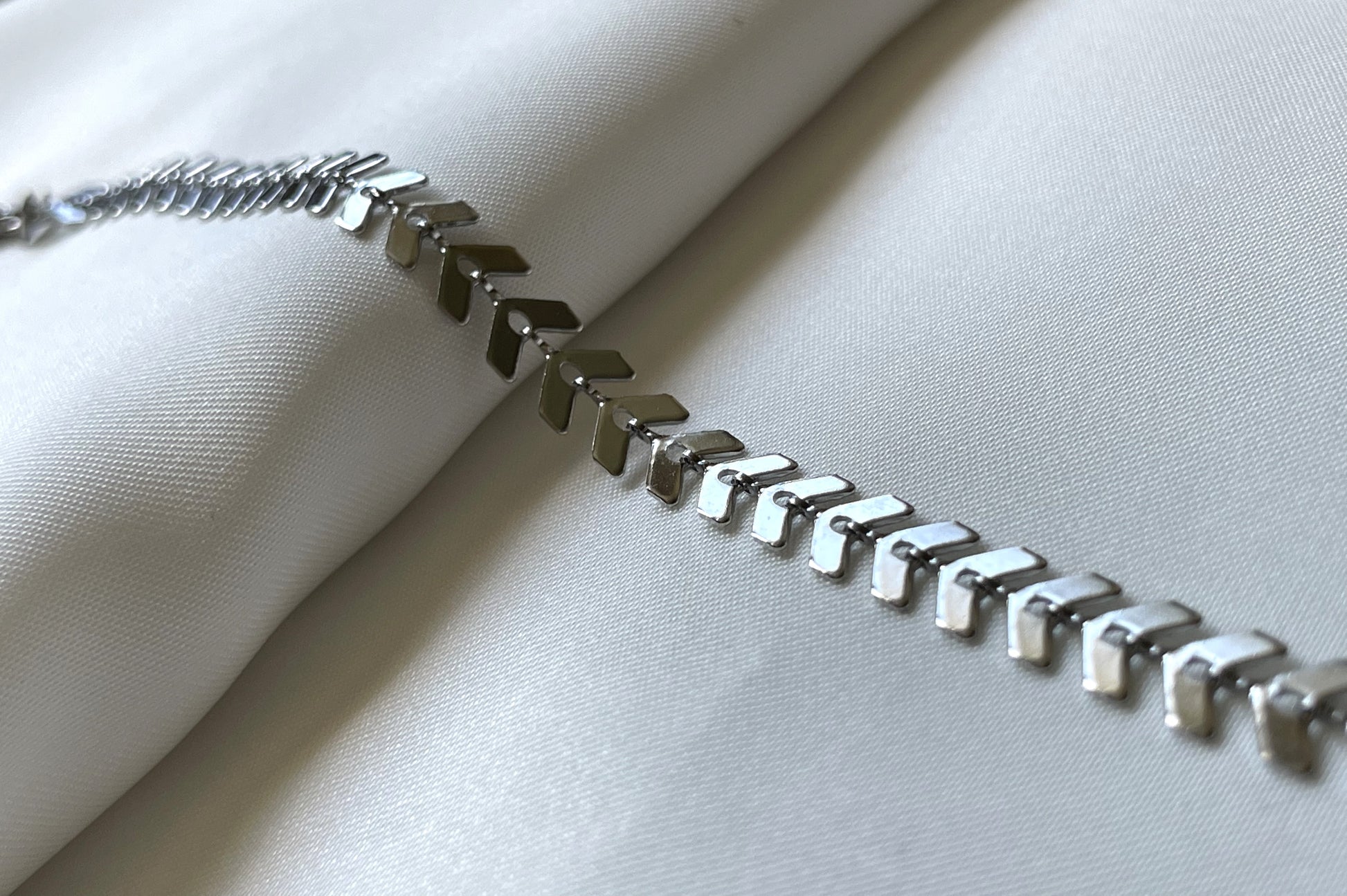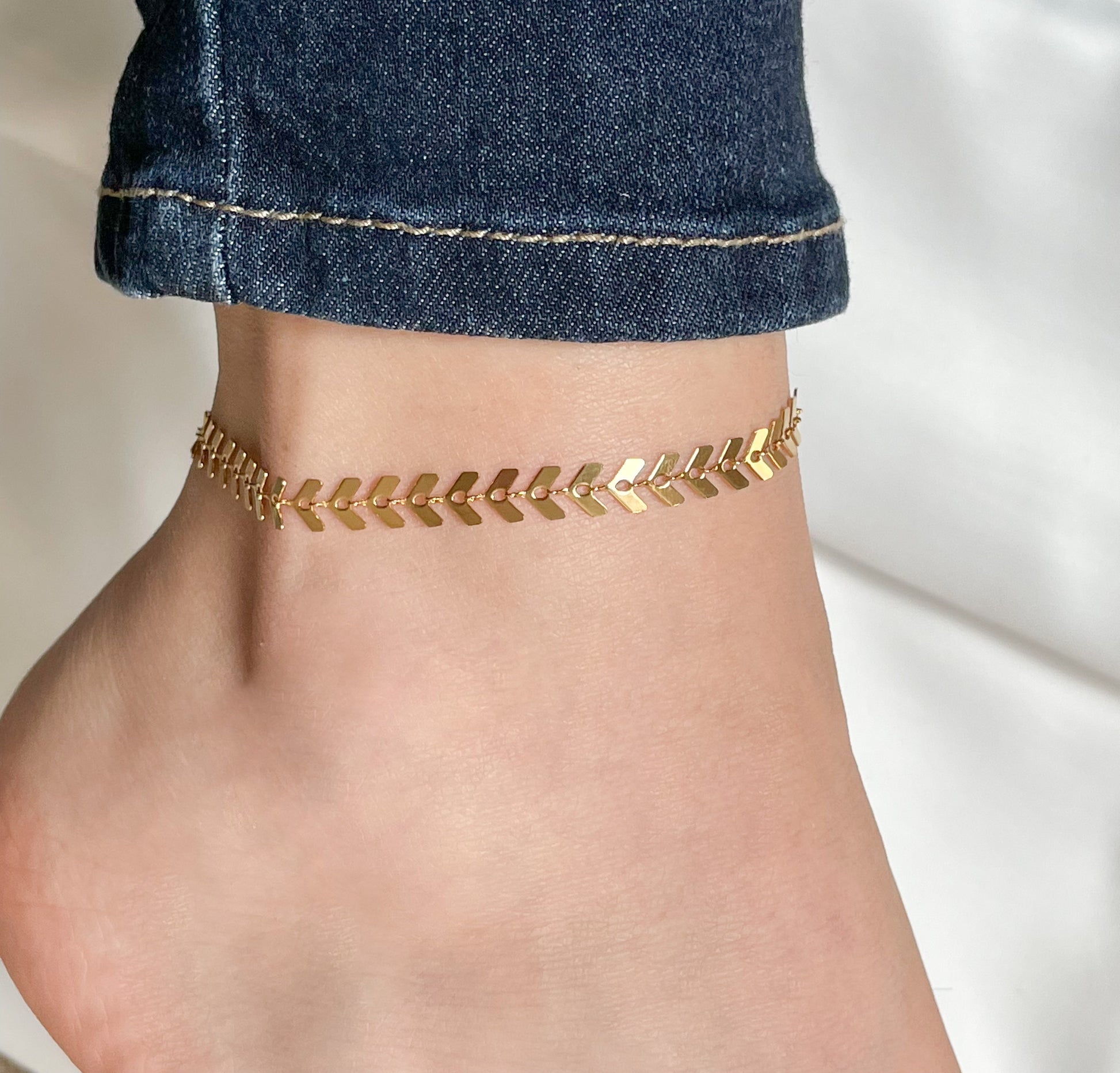 This fish bone or leaf style chain anklet inspired by ancient Greece motifs is made of stainless steel in gold finish and receives a personalized touch at the clasp area with a disc letter charm, which creates a contrast with the edgy look of the leaf links of the chain. Offers the perfect fit with your choice of length!