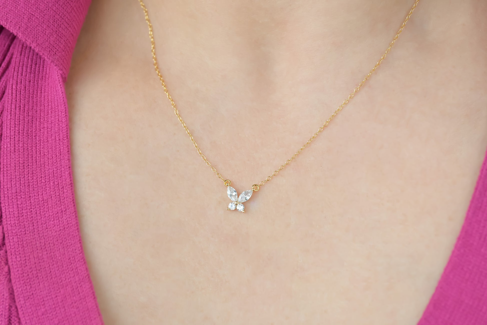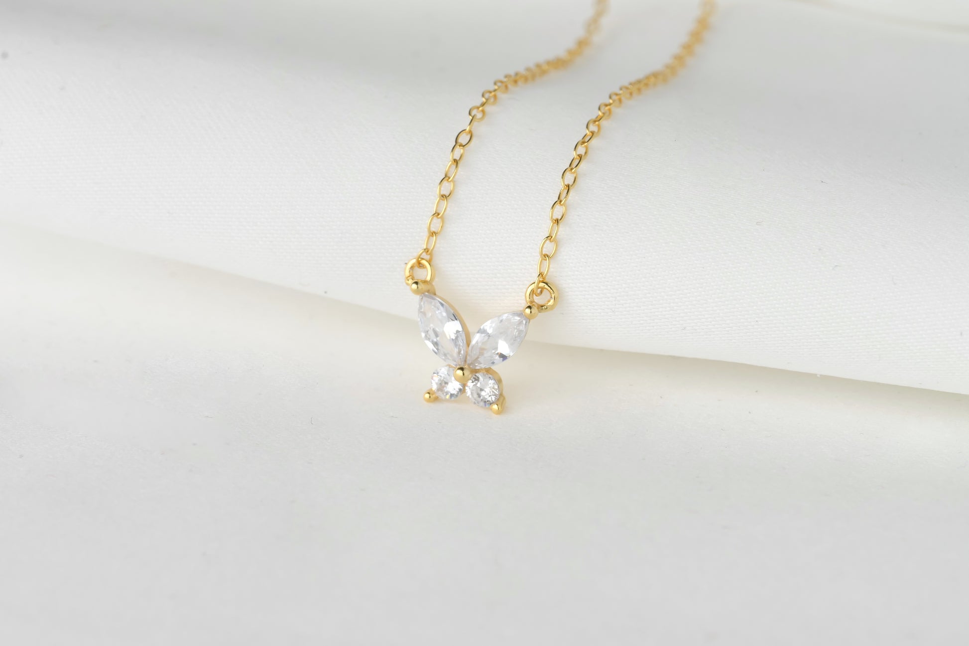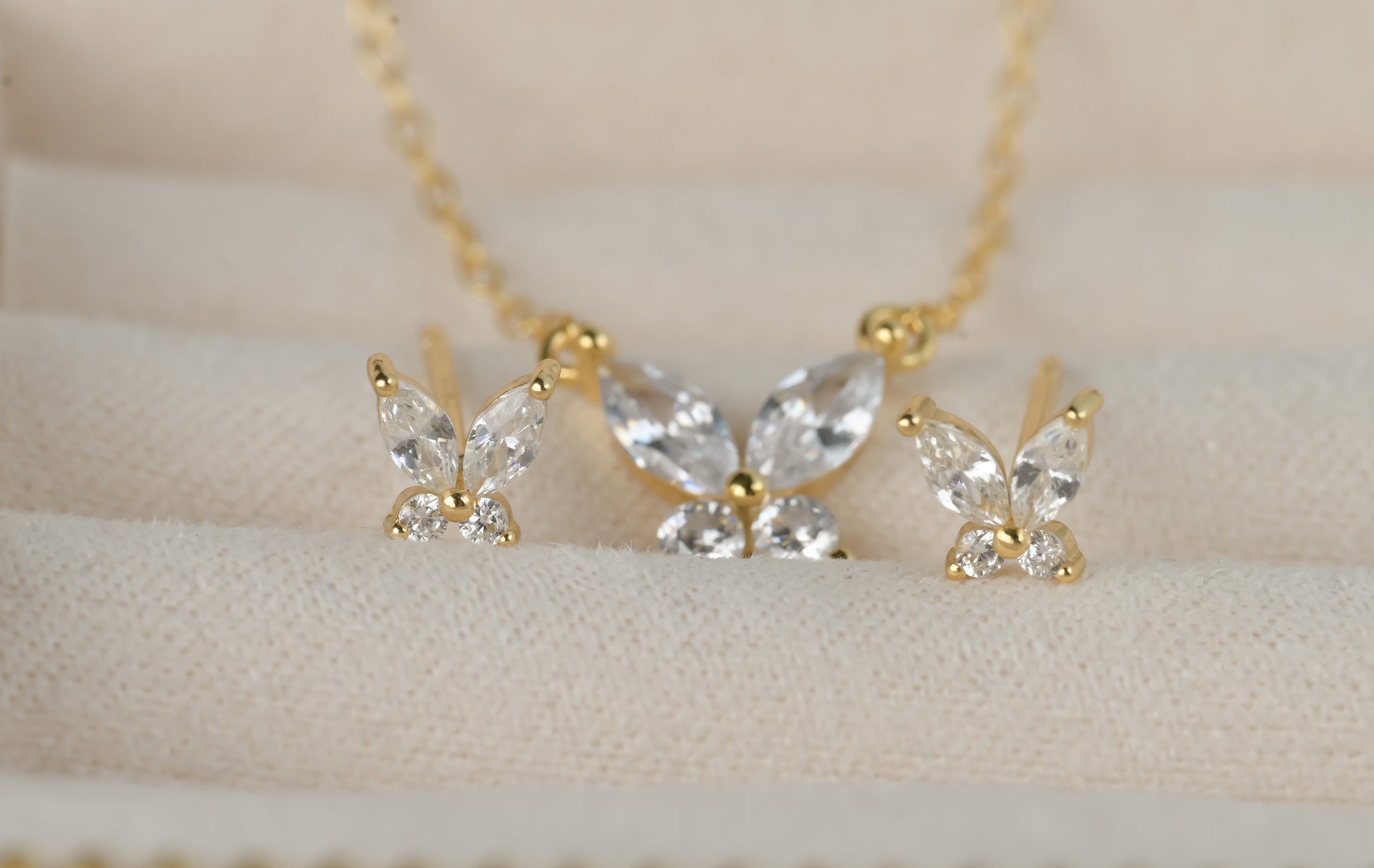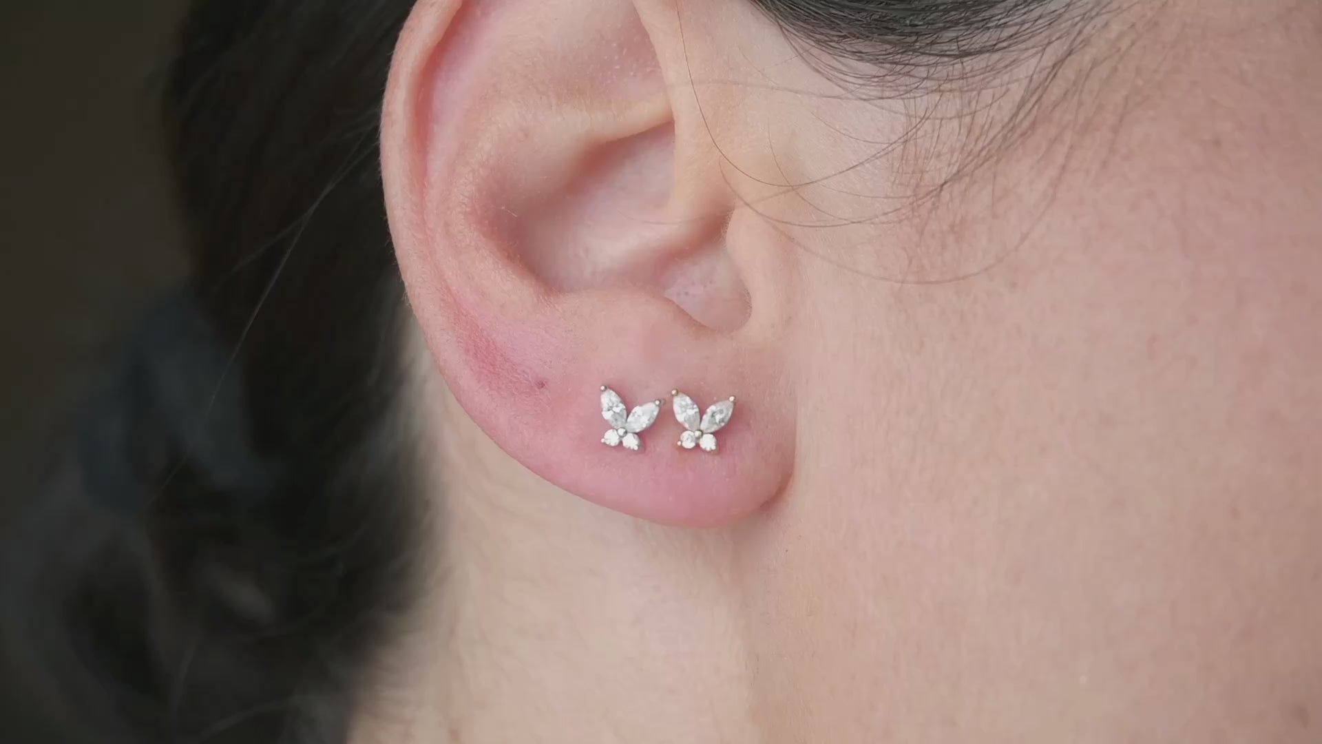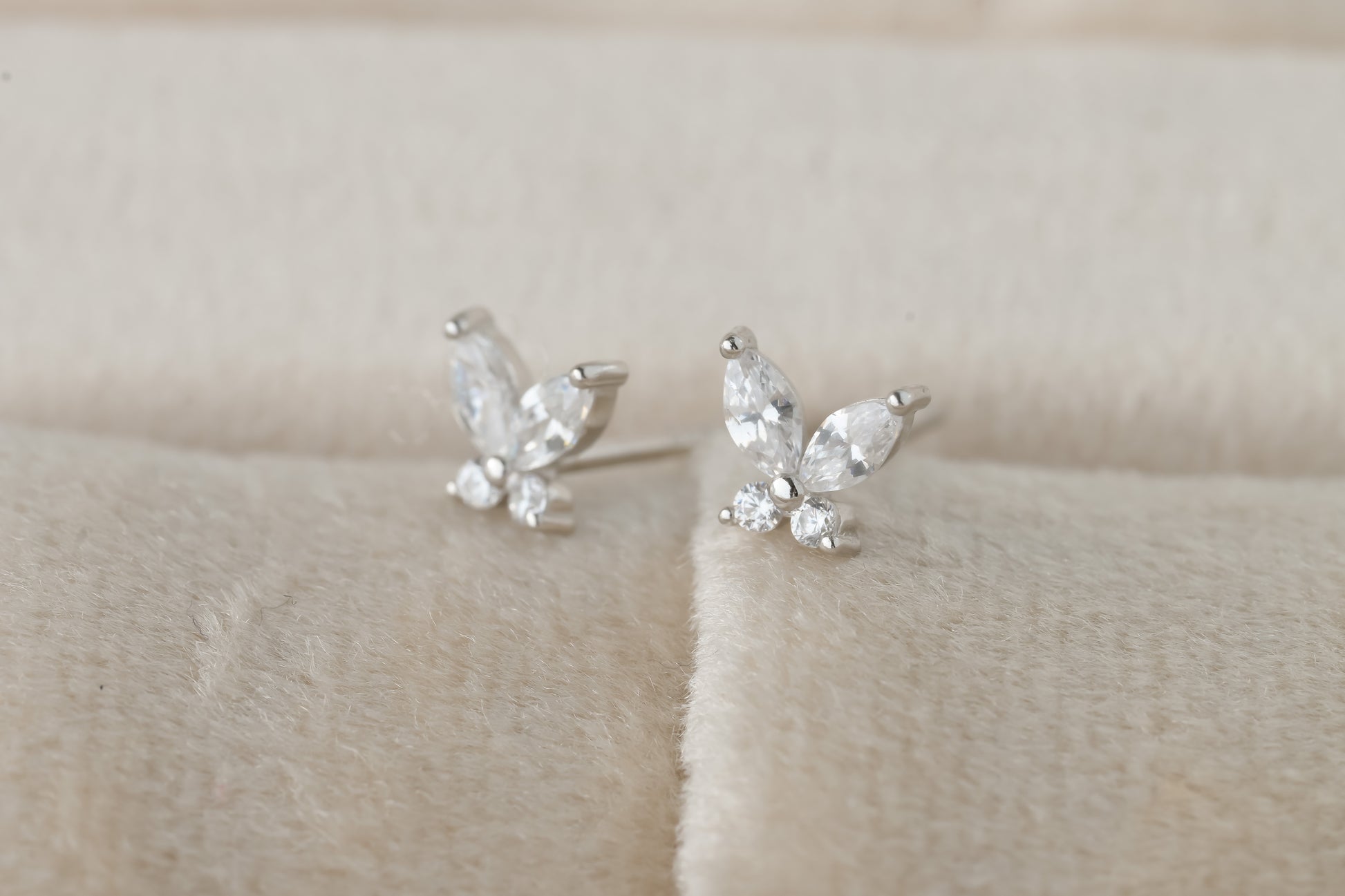 Add a touch of whimsical elegance to your style with our 5.5mm Butterfly Stud Earrings. Meticulously hand-crafted in sterling silver and adorned with dazzling marquise-cut cubic zirconia stones in a secure button prong setting. Available in both classic silver and luxurious 14k gold finish, these studs are versatile and eye-catching. Pair them with our matching Butterfly Necklace for a complete and enchanting look. Elevate your style with the beauty of nature.