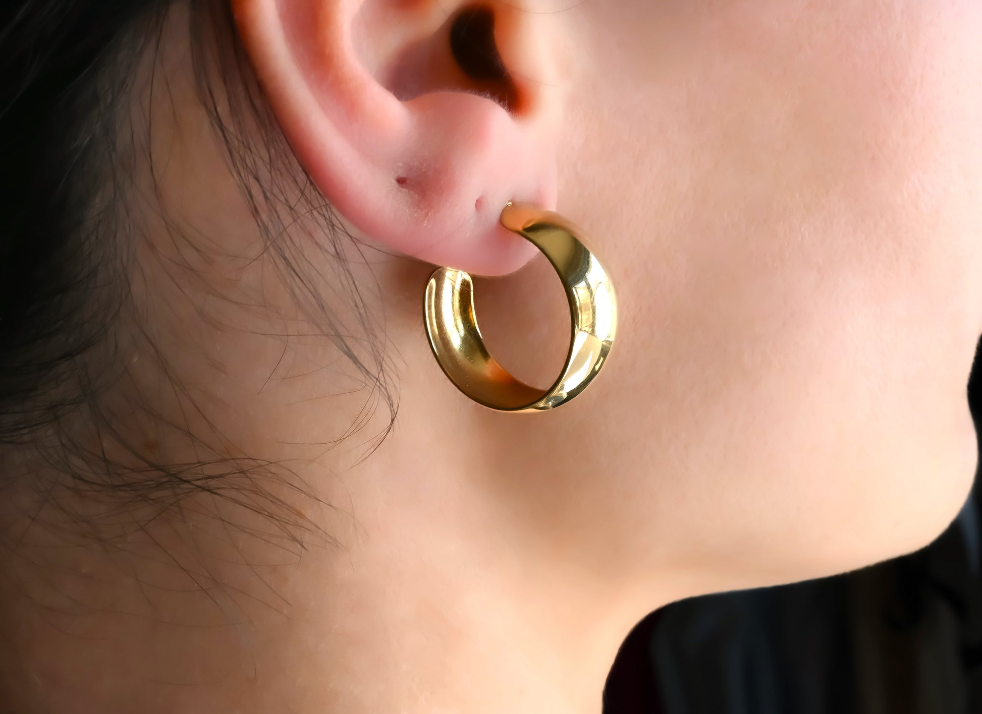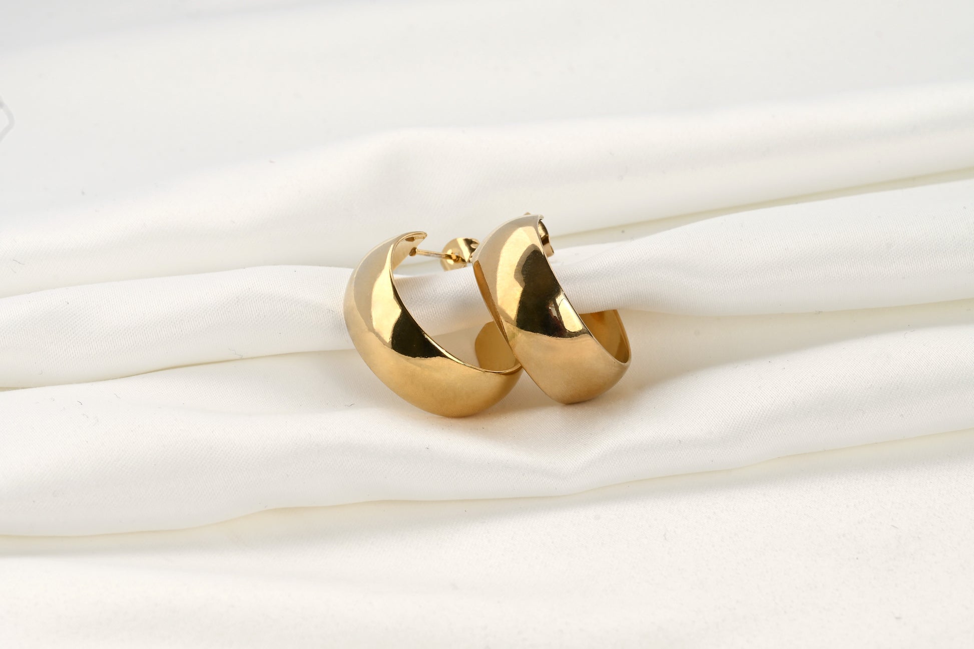 Classy and bold in design, these super lightweight chunky dome hoops are made of 18k Gold PVD plated stainless steel measuring 25 mm in size and 10 mm in width. They will fit just about any outfit. Plus, they are tarnish resistant and waterproof; you can wear them to the pool or gym and they won't tarnish.