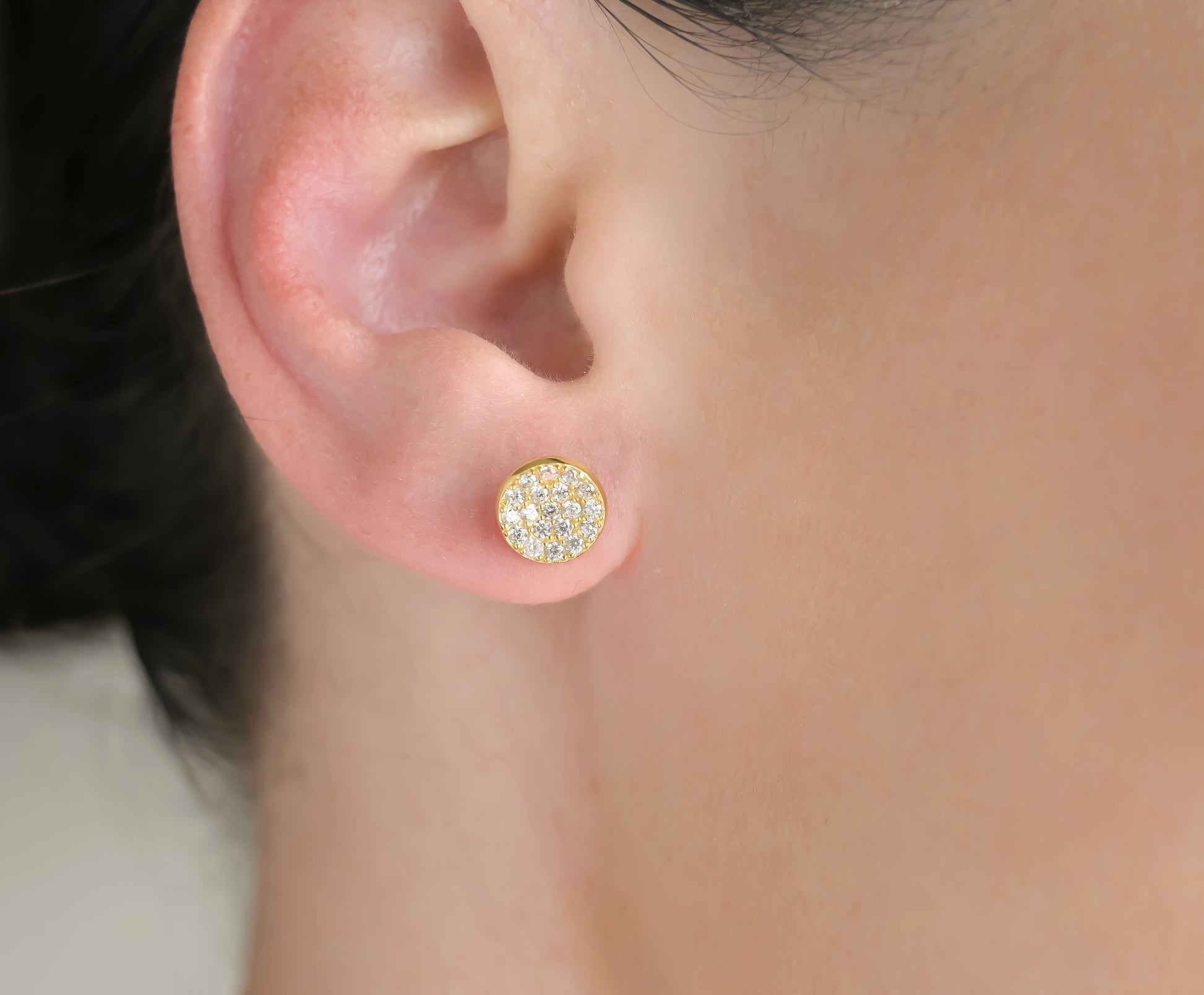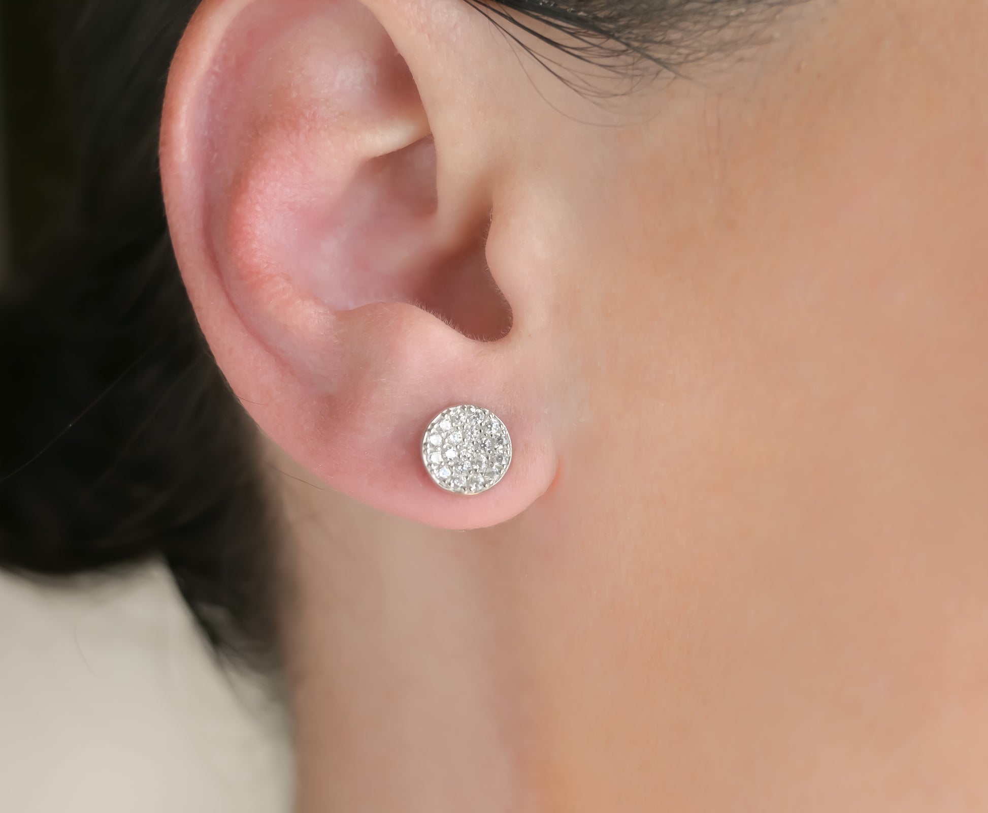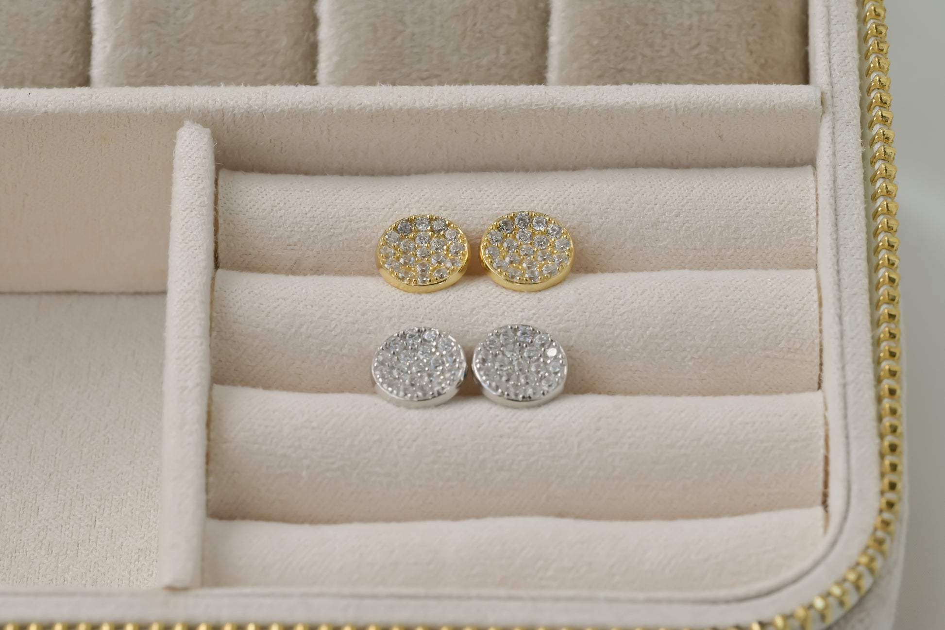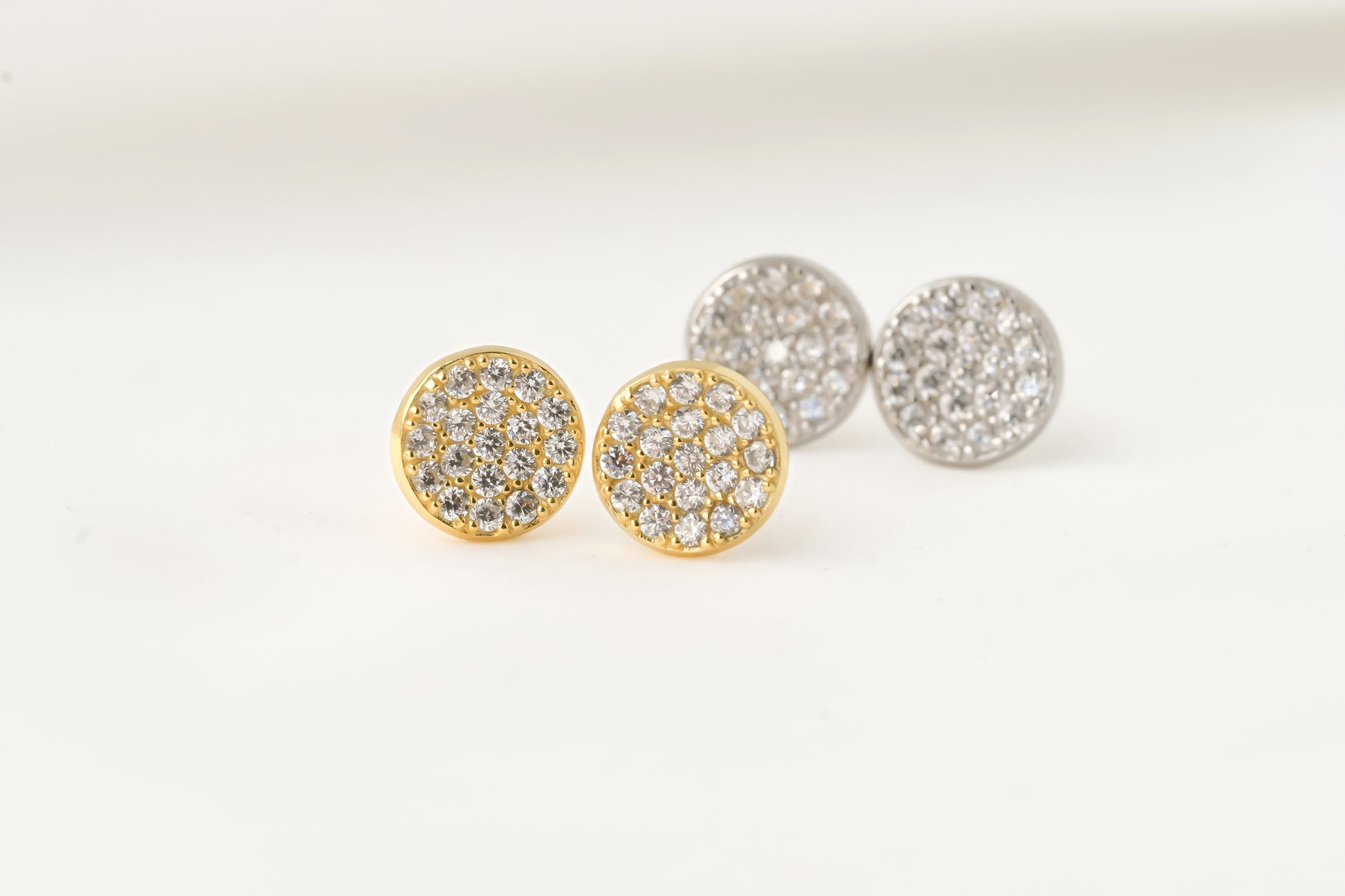 Elevate your elegance with our medium-sized sterling silver pavé diamond round studs, available in both radiant gold and classic silver. These uniquely curved studs are adorned with tiny cubic zirconia stones, adding a touch of brilliance and dimension to your style. Perfect for any occasion, these versatile and eye-catching earrings are a must-have addition to your jewelry collection. Discover sophistication and timeless charm with every wear.