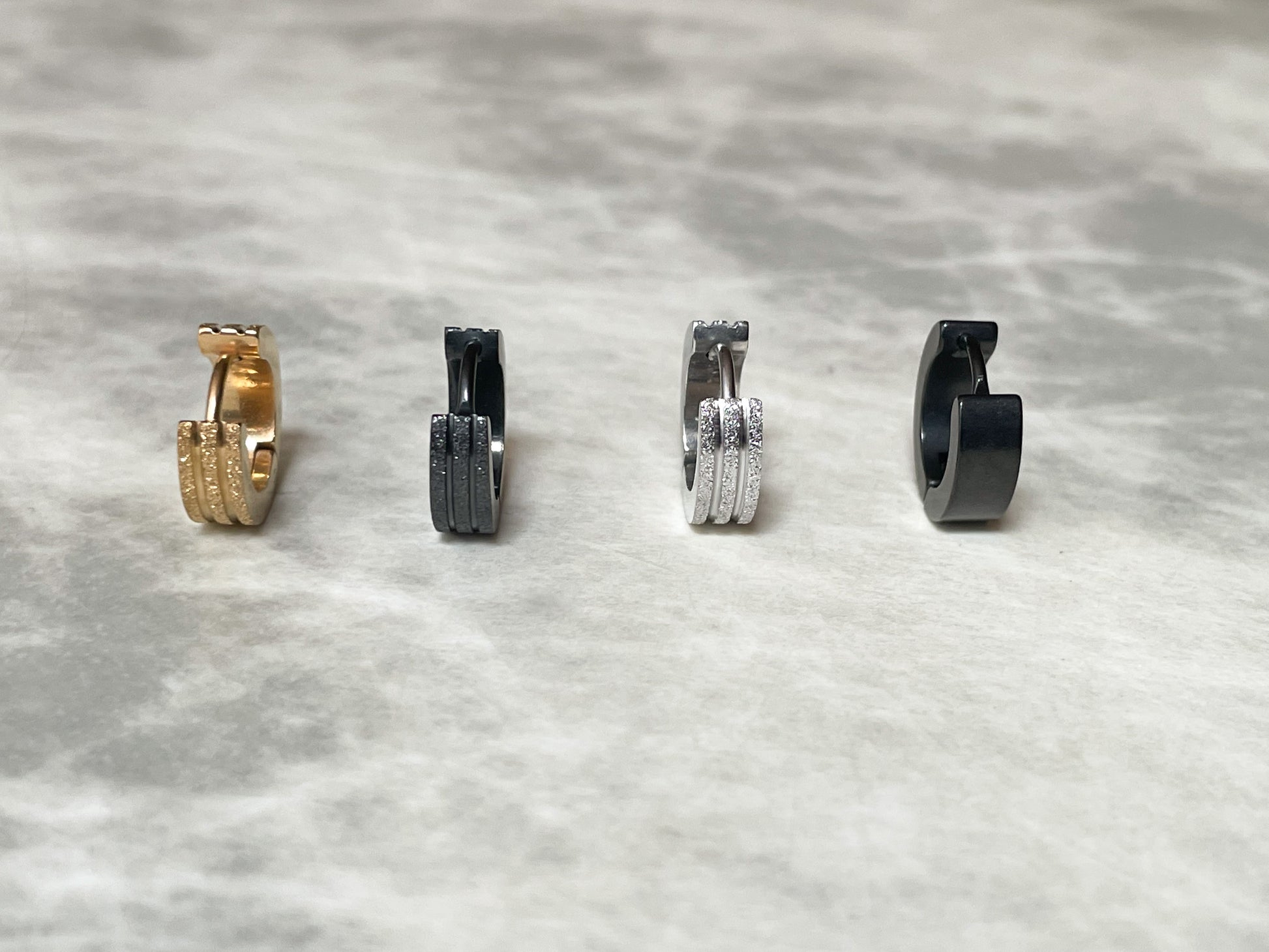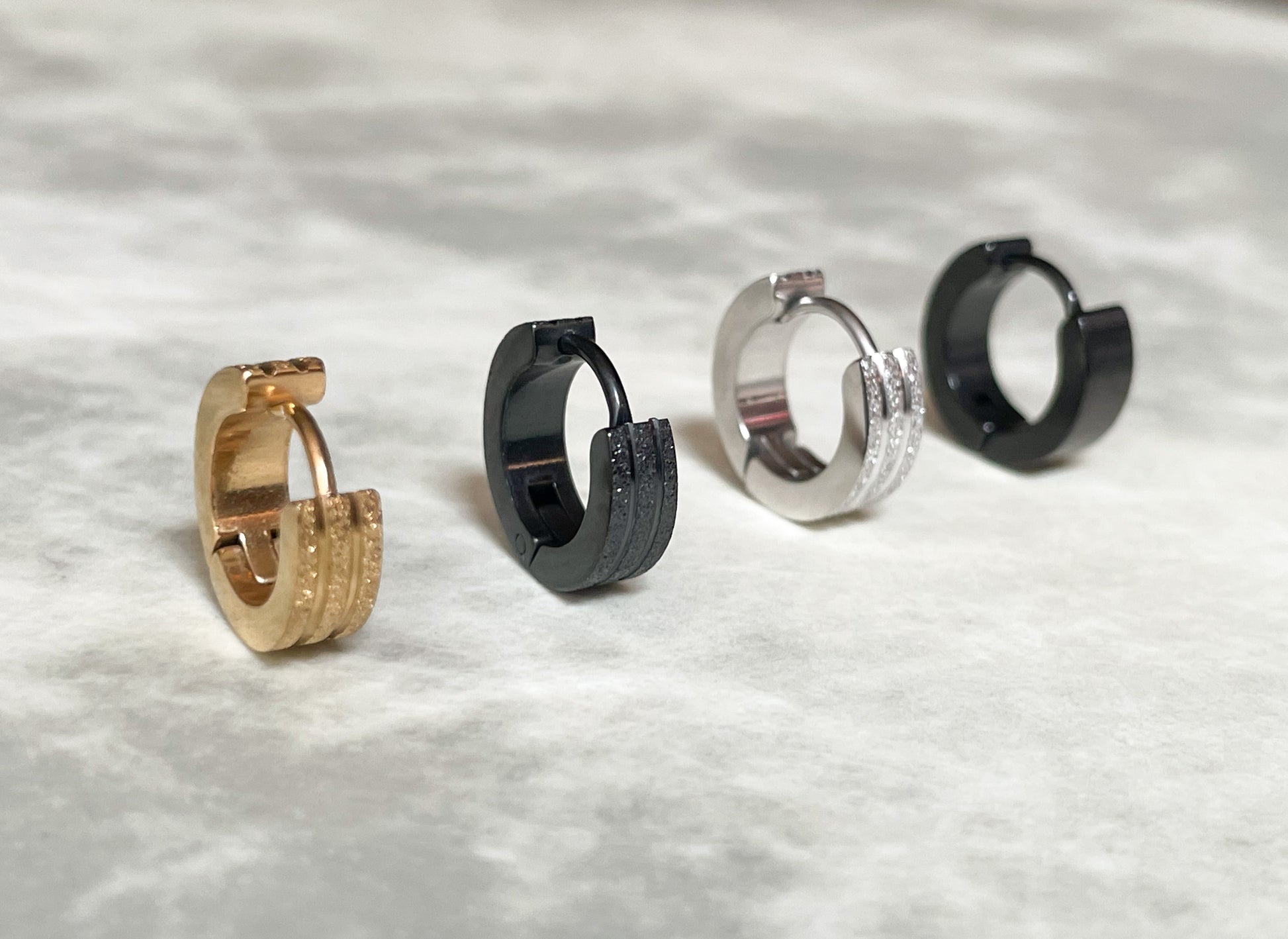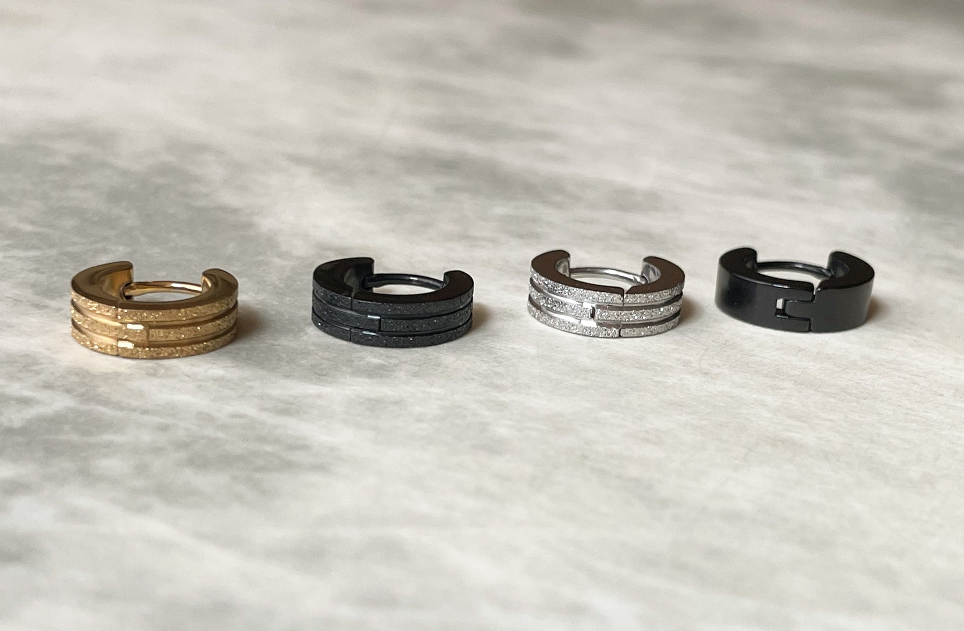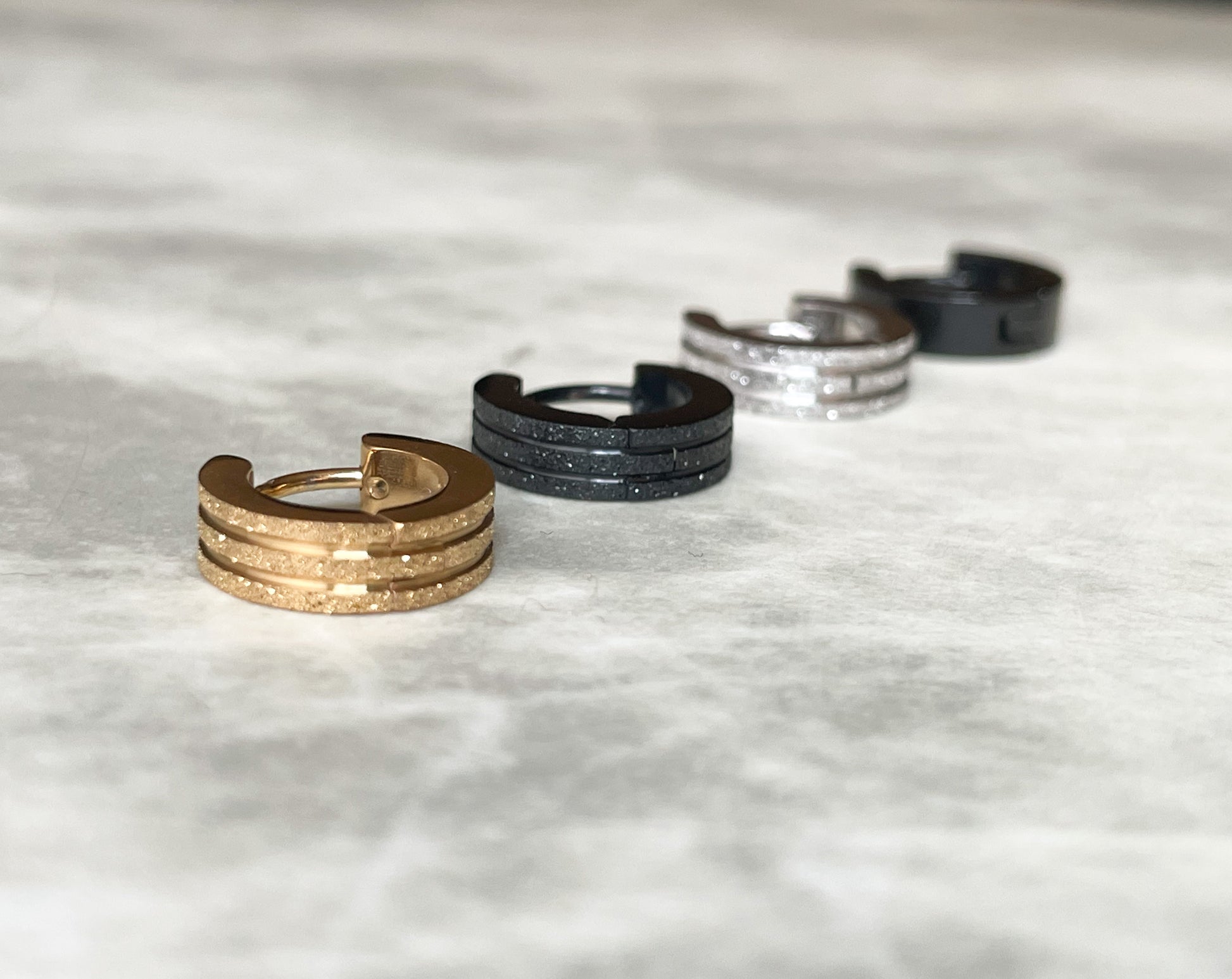 These huggie hoops are a simple piece with a lot of shine! Made of stainless steel in black, gold and silver finish, these earrings deliver sparkles from all angles. The black one is also available in satin finish without any sparkles. Sold as a pair.
