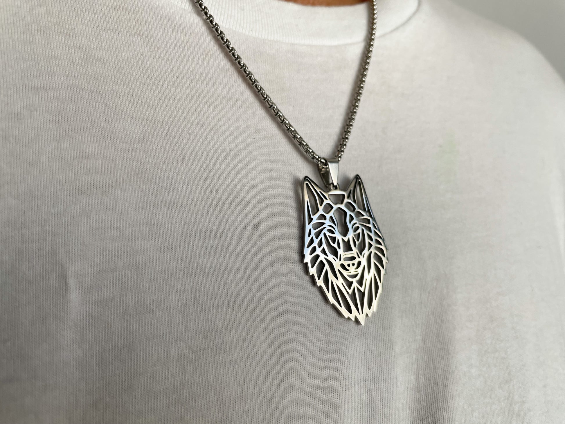 A powerful symbol of strength, loyalty and bravery, this wolf pendant will be a great companion . Crafted in stainless steel in silver and black finish, this waterproof Celtic design features a shiny flat wolf head measuring 45x30 mm and a nonadjustable 23.5 inch rounded box chain. Add an initial charm next to the wolf pendant for a personalized touch!