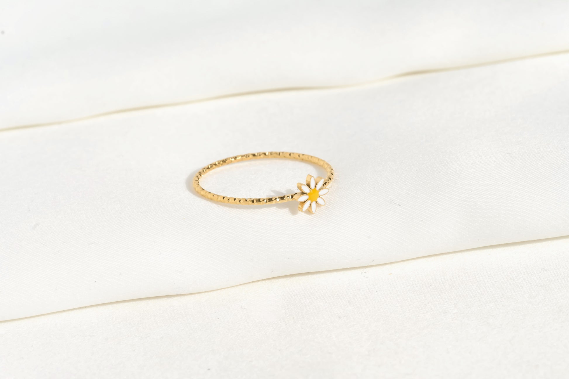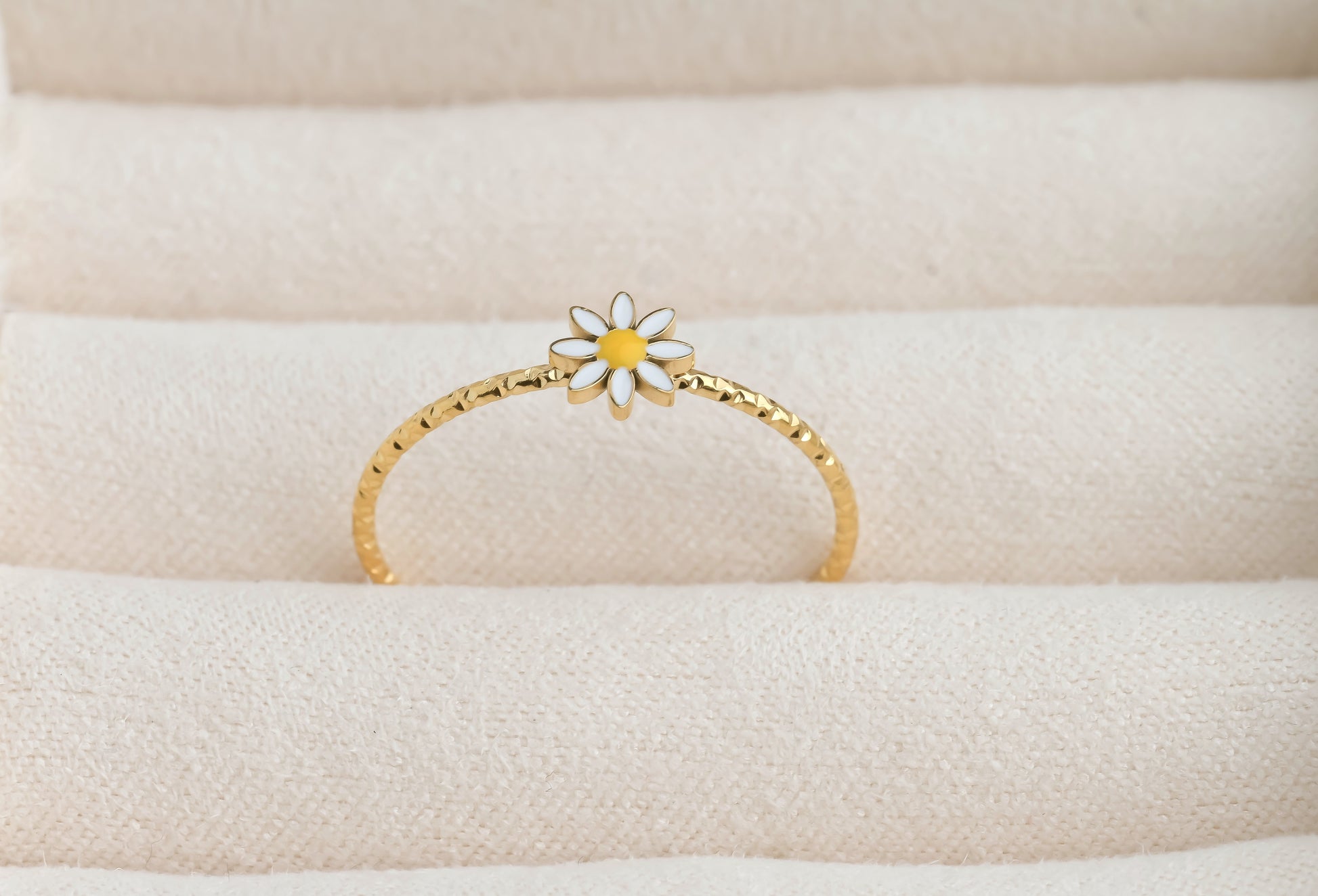Elevate your style with our minimalist Gold Daisy Ring, expertly crafted from 18k gold PVD plated stainless steel. Its warm gold tone features a subtle red undertone, and the white daisy design adds a touch of minimalistic elegance to your look.