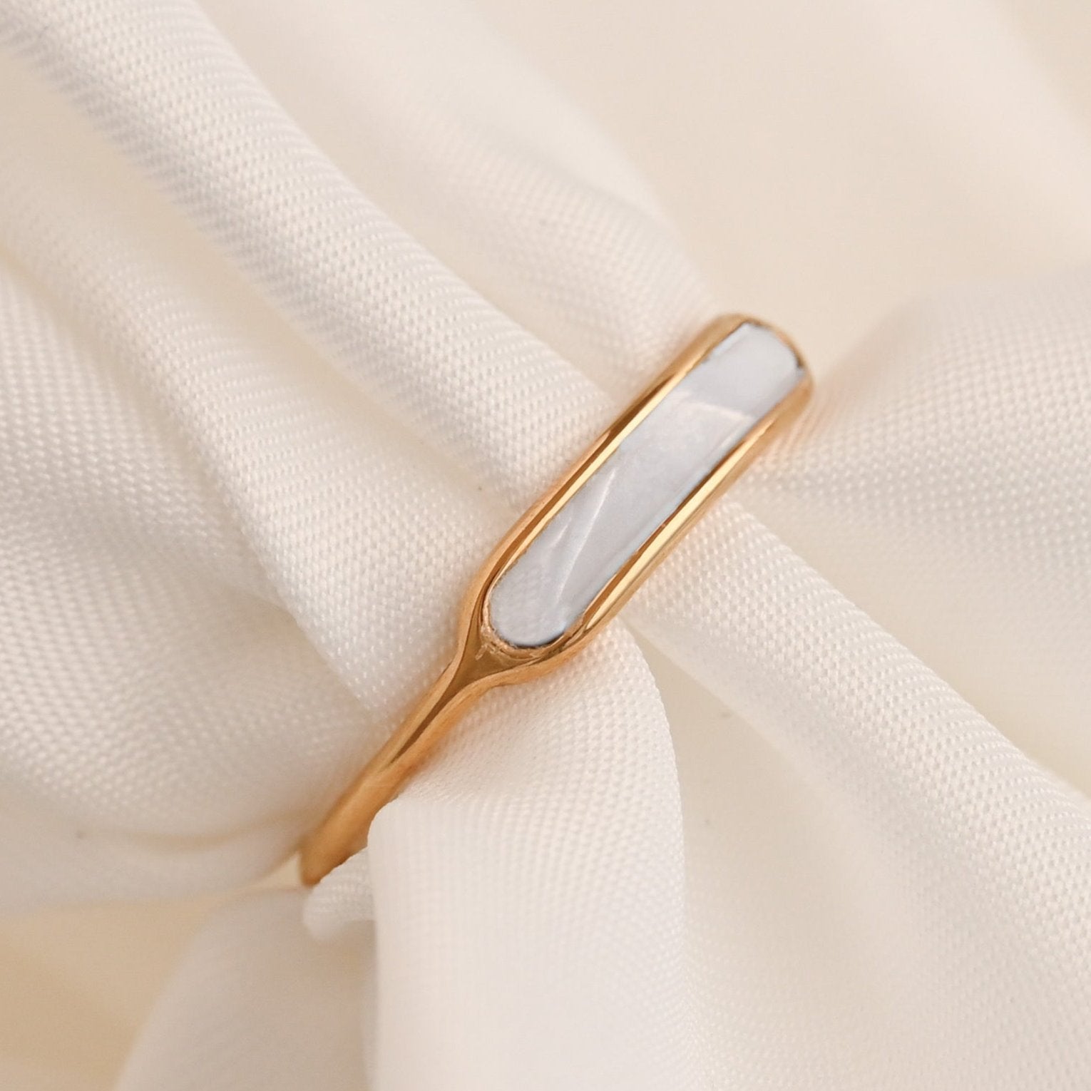 This dainty ring features a shimmering mother of pearl set in stainless steel with 18k gold PVD plating, ensuring it’s tarnish-free and long-lasting. Its delicate design makes it perfect for everyday wear or layering with other rings for an elegant touch.