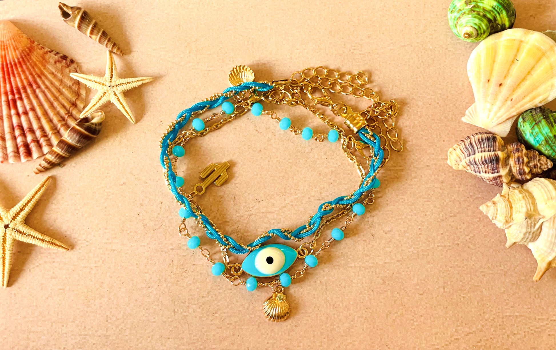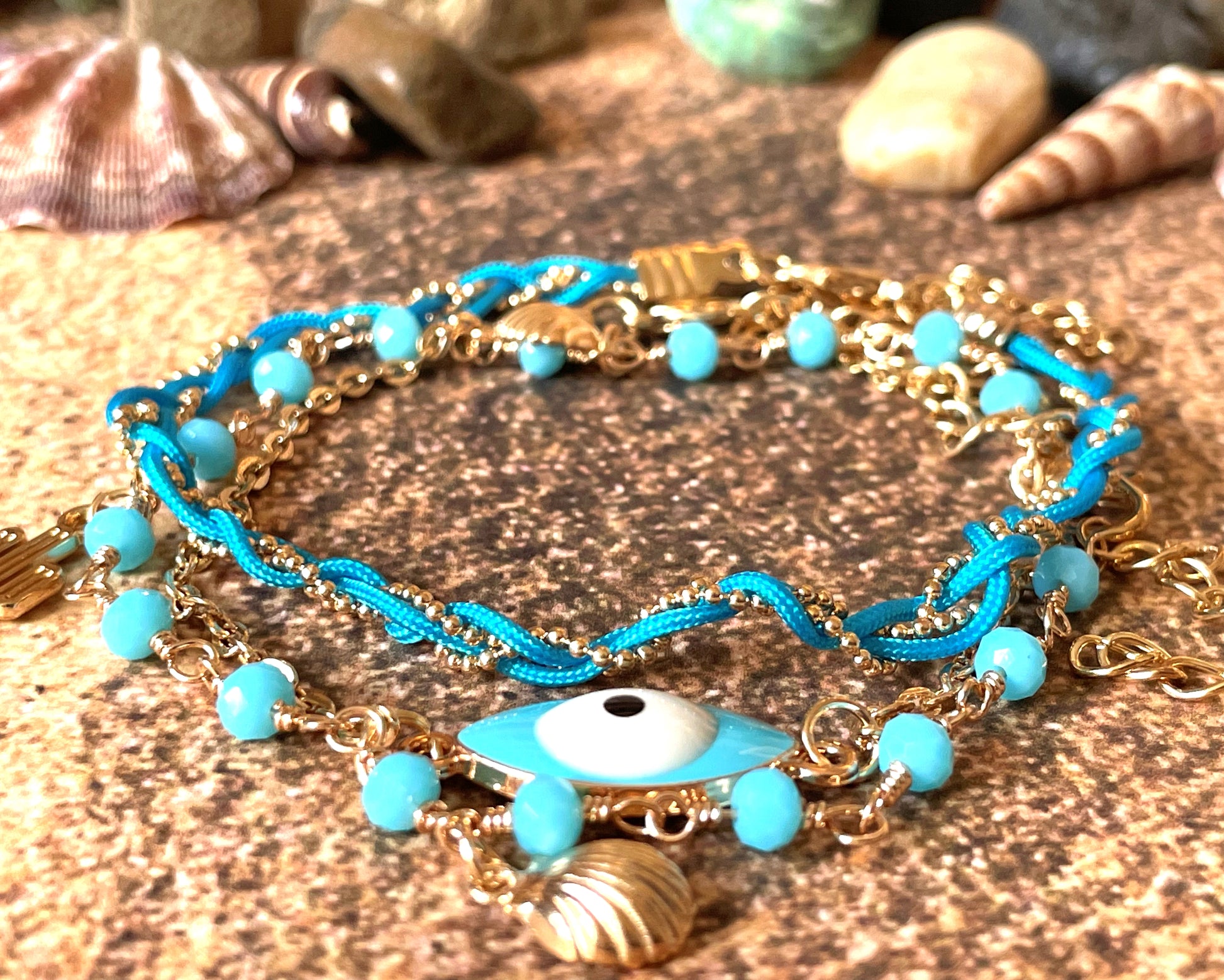 3 Pieces turquoise anklet set that features a gold evil eye chain anklet, a gold chain anklet with gold seashell and cactus charms and a third twisted rope and ball chain anklet.
