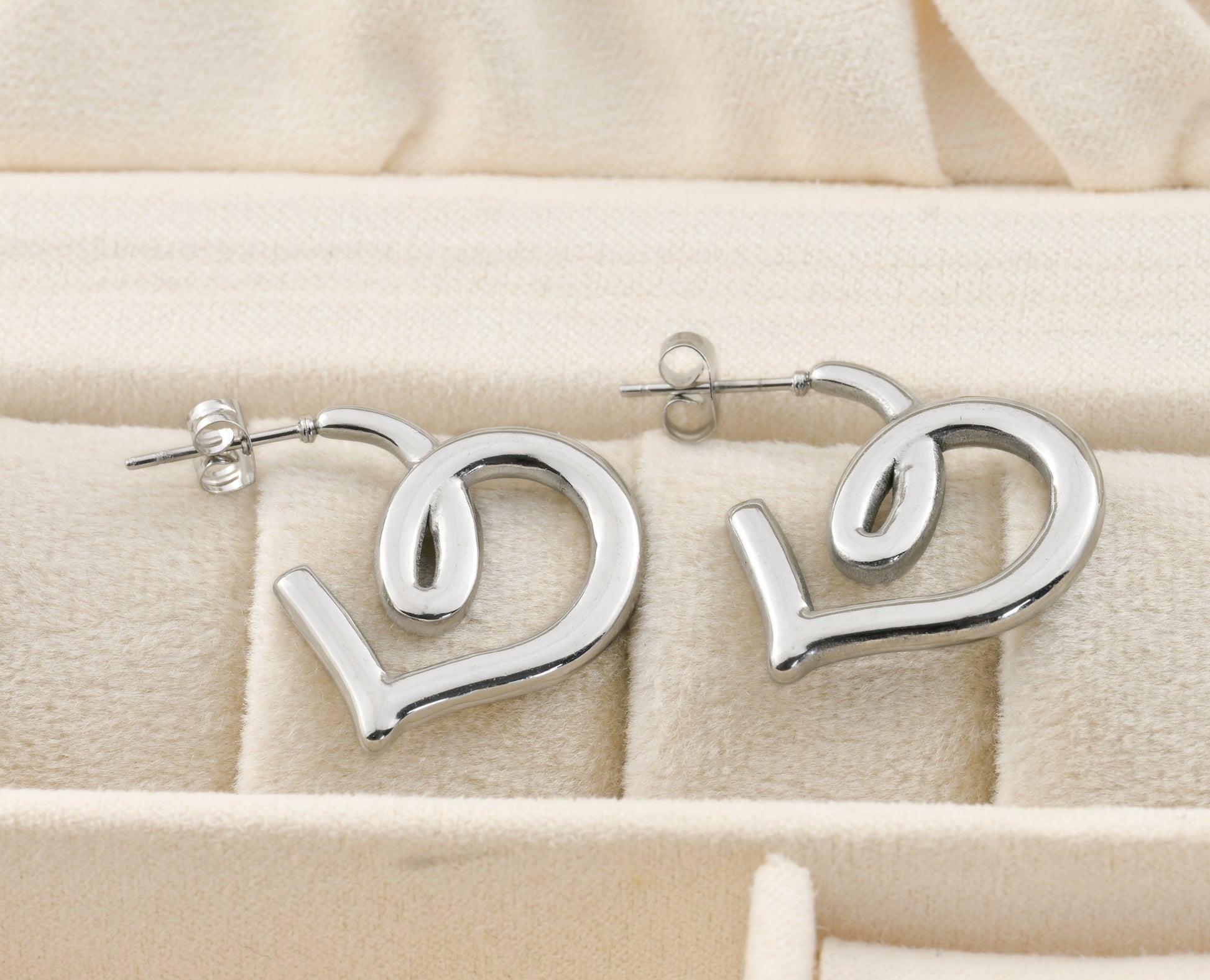 Stainless steel open sculptural heart hoops, available in gold and silver, measure 20x24mm. Tarnish-free and durable, they add a touch of playful sophistication to any look.
